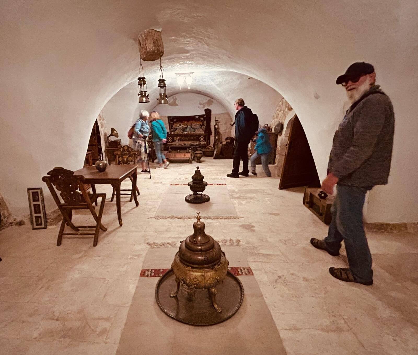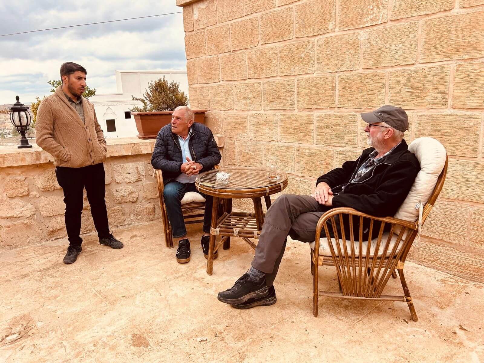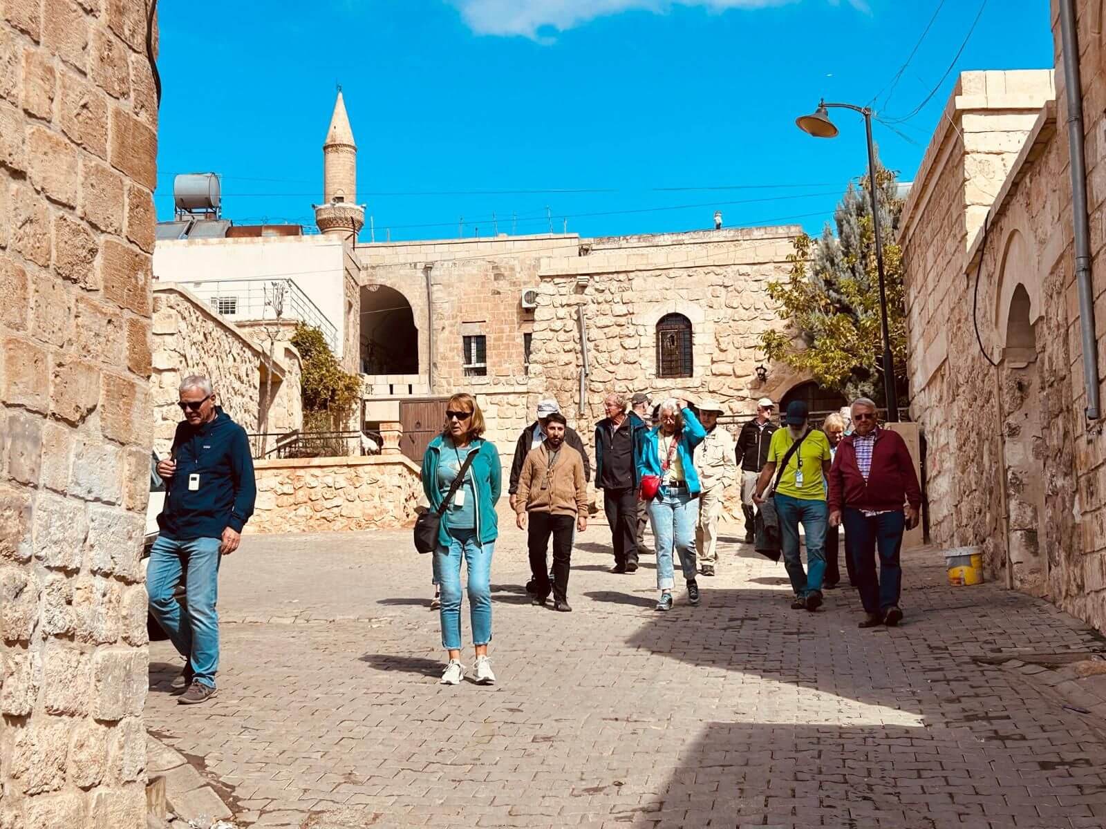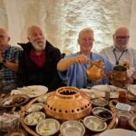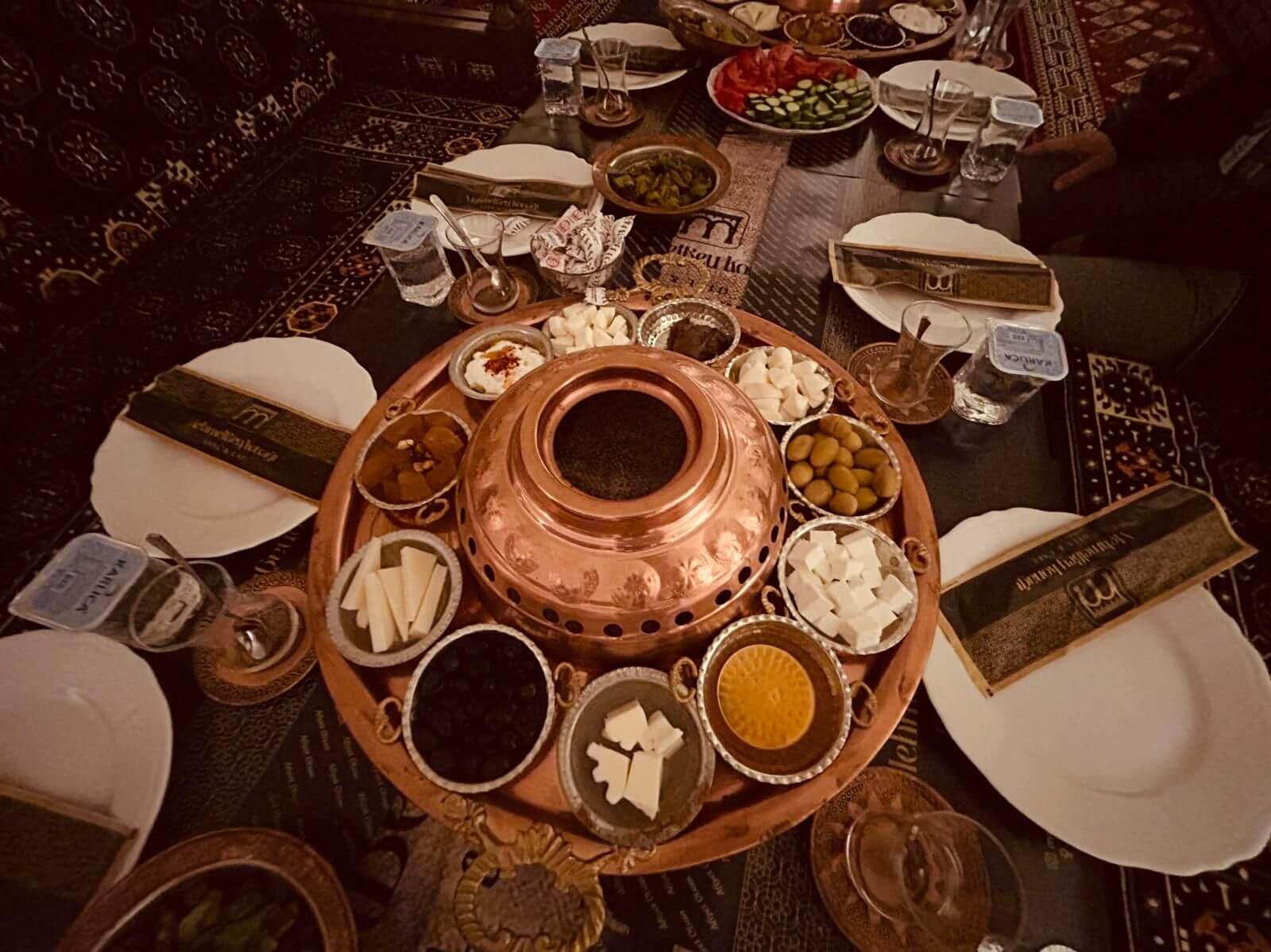 Unser Bus und unser Guide sind pünktlich und so starten wir am Morgen, um zuerst ein gemeinsames Frühstück einzunehmen. In Midyat wurde vor einigen Jahren bei Renovierungsarbeiten zufällig ein Eingang zu einer Höhlenstadt gefunden. Nach ersten Erkenntnissen hat diese unterirdische Stadt – Matiate – riesige Ausmaße. Über 1.900 Jahre sollen dort bis zu 70.000 Menschen gelebt haben. Wir bekommen das Frühstück in einem Hotel in einer dieser Höhlen unter dem Hotel serviert. Dieses Frühstück ist ein typisch türkisches Frühstück. Unser Guide erklärt uns, was wir auf den vielen kleinen Schälchen und Tellern finden. Es schmeckt alles prima und wir sind gut gesättigt, damit wir jetzt zu Fuß den neueren Teil Mityats erkunden können. Zunächst besuchen wir ein Herrenhaus, in dem Hochzeiten ausgerichtet werden können. Die Architektur und die Inneneinrichtung und auch hier der Zugang zur unterirdischen Stadt sind beeindruckend. Weiter geht es zum Stadtmuseum, in dem wir Ausstellungen sehen, die zum Leben im Osmanischen Reich gehören. Anschließend fahren wir mit unserem Bus in die Altstadt. Heute gibt es Freizeit zum Bummeln, Essen und Shoppen. Das Wetter lädt auch zum Eis und Tee oder Kaffee vor einem Geschäft in der Sonne ein. Zurück im Camp besprechen wir den nächsten Fahrtag und die Möglichkeit, in Kars, unserem übernächsten Ziel nach Ararat, ein traditionelles Gänseessen mit kaukasischer Folklore zu genießen. Jetzt wird es leider abends schnell kühl, sodass es nur noch ein kurzes Verweilen nach der Besprechung im Freien gibt.