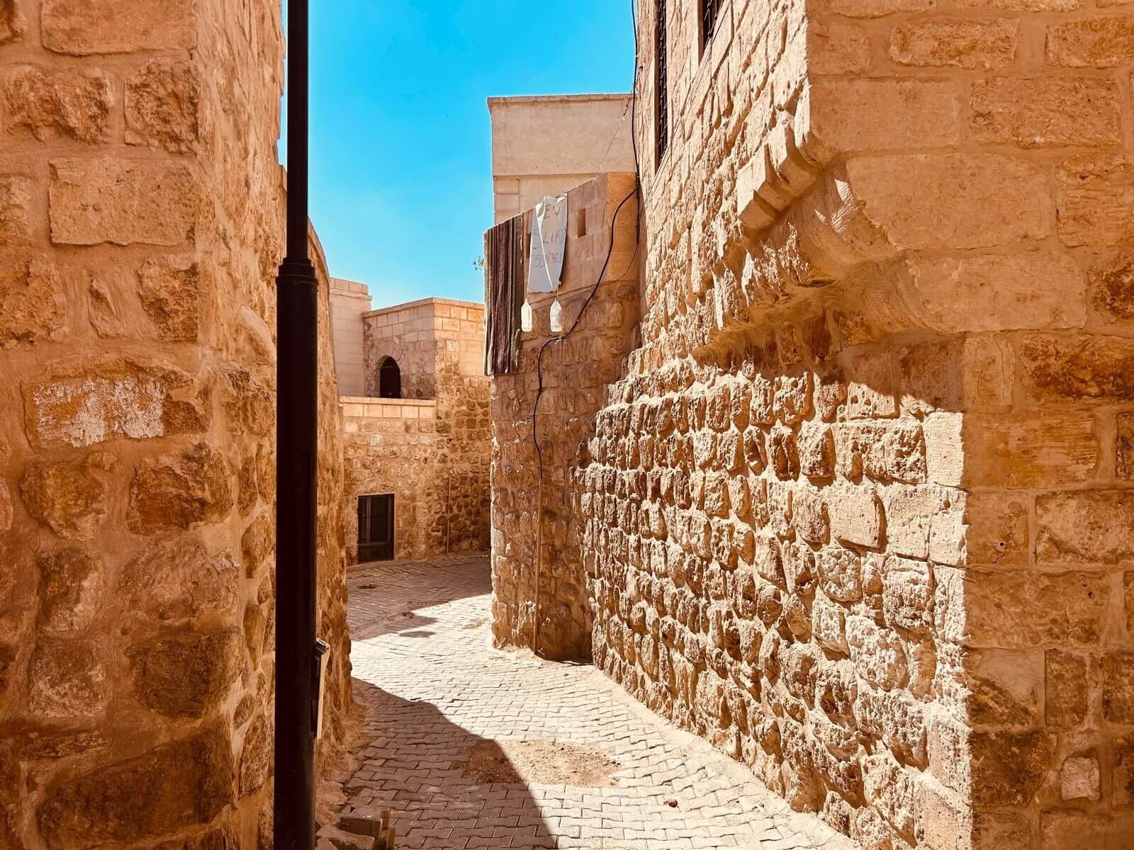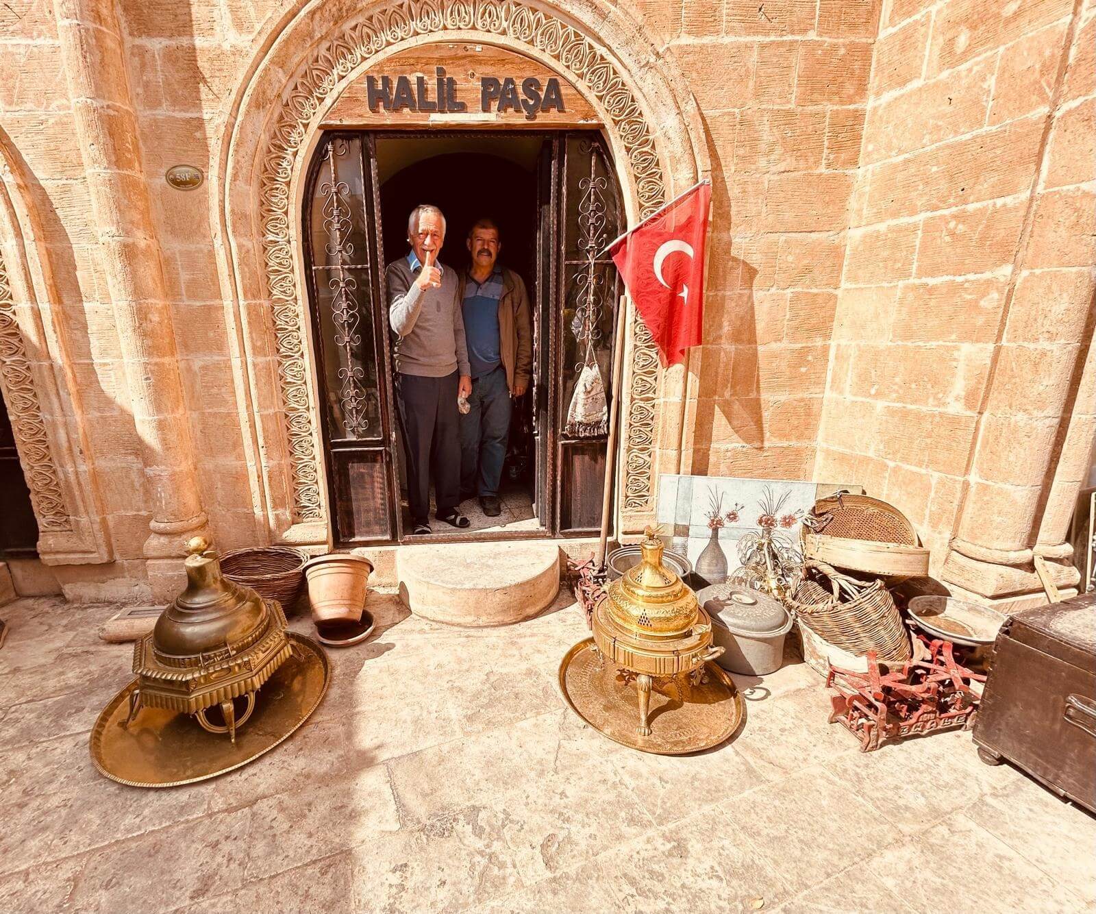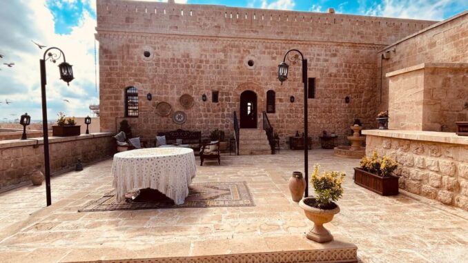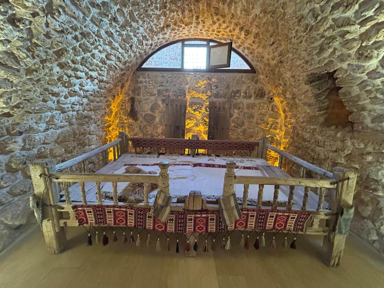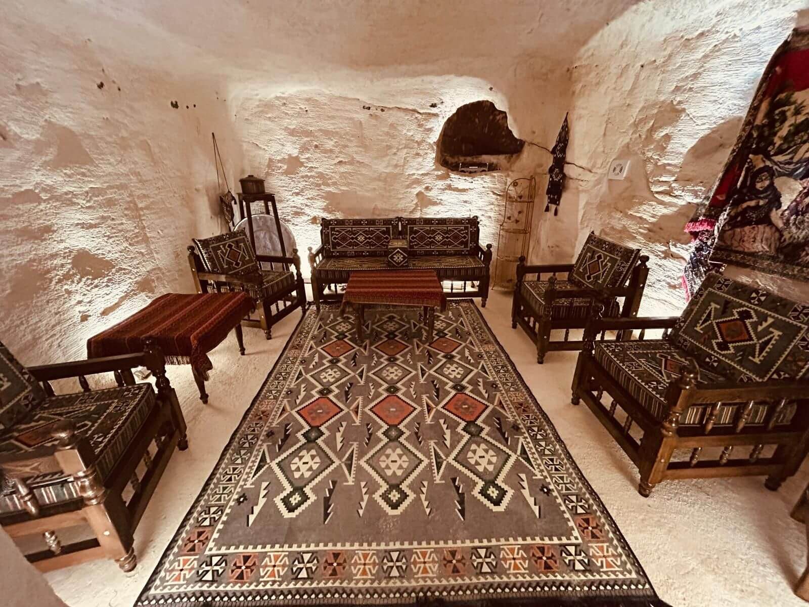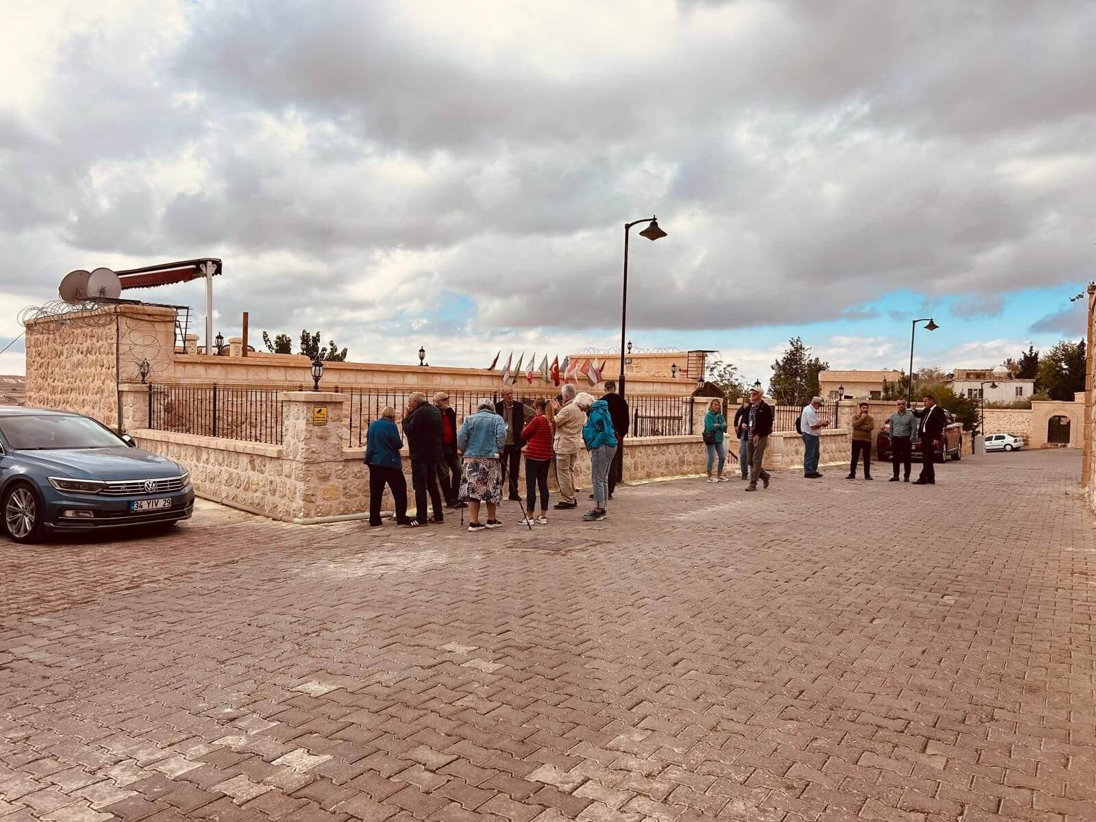Unser Bus und unser Guide sind pünktlich und so starten wir am Morgen, um zuerst ein gemeinsames Frühstück einzunehmen. In Midyat wurde vor einigen Jahren bei Renovierungsarbeiten zufällig ein Eingang zu einer Höhlenstadt gefunden. Nach ersten Erkenntnissen hat diese unterirdische Stadt – Matiate – riesige Ausmaße. Über 1.900 Jahre sollen dort bis zu 70.000 Menschen gelebt haben. Wir bekommen das Frühstück in einem Hotel in einer dieser Höhlen unter dem Hotel serviert. Dieses Frühstück ist ein typisch türkisches Frühstück. Unser Guide erklärt uns, was wir auf den vielen kleinen Schälchen und Tellern finden. Es schmeckt alles prima und wir sind gut gesättigt, damit wir jetzt zu Fuß den neueren Teil Mityats erkunden können. Zunächst besuchen wir ein Herrenhaus, in dem Hochzeiten ausgerichtet werden können. Die Architektur und die Inneneinrichtung und auch hier der Zugang zur unterirdischen Stadt sind beeindruckend. Weiter geht es zum Stadtmuseum, in dem wir Ausstellungen sehen, die zum Leben im Osmanischen Reich gehören. Anschließend fahren wir mit unserem Bus in die Altstadt. Heute gibt es Freizeit zum Bummeln, Essen und Shoppen. Das Wetter lädt auch zum Eis und Tee oder Kaffee vor einem Geschäft in der Sonne ein. Zurück im Camp besprechen wir den nächsten Fahrtag und die Möglichkeit, in Kars, unserem übernächsten Ziel nach Ararat, ein traditionelles Gänseessen mit kaukasischer Folklore zu genießen. Jetzt wird es leider abends schnell kühl, sodass es nur noch ein kurzes Verweilen nach der Besprechung im Freien gibt.