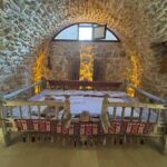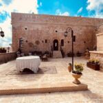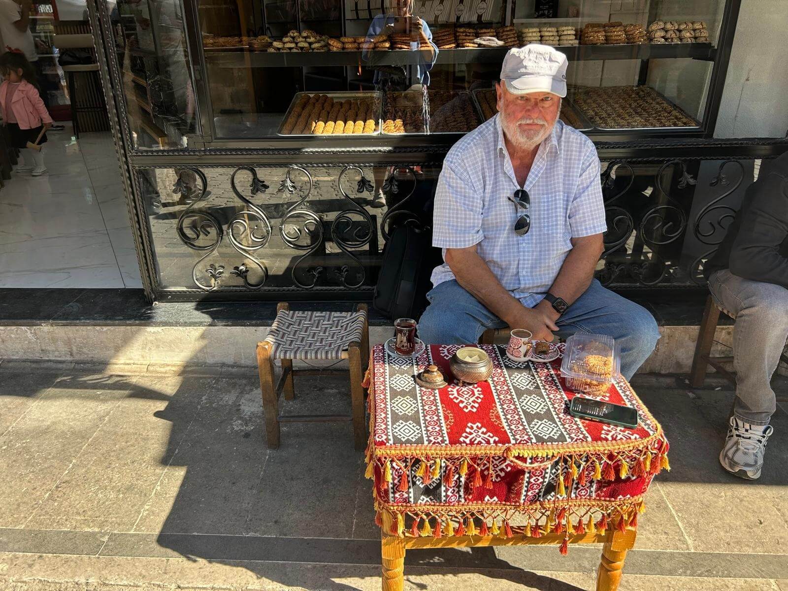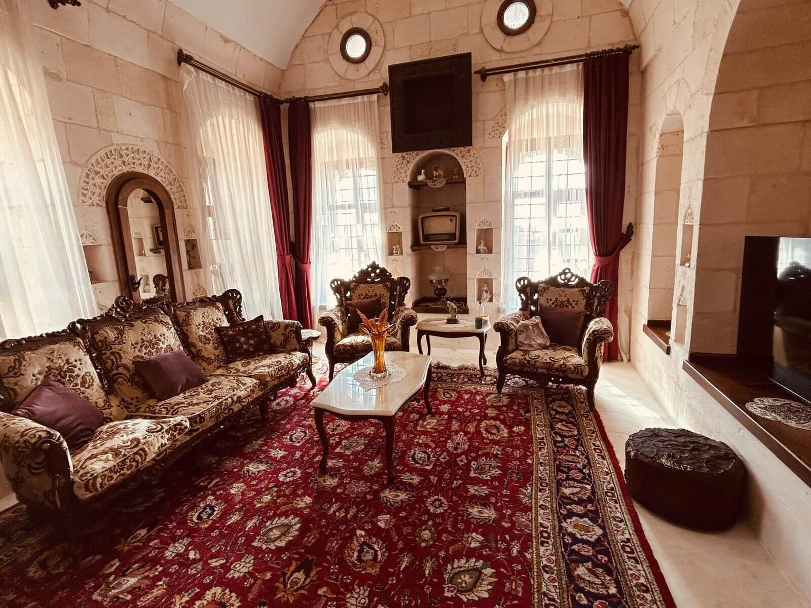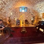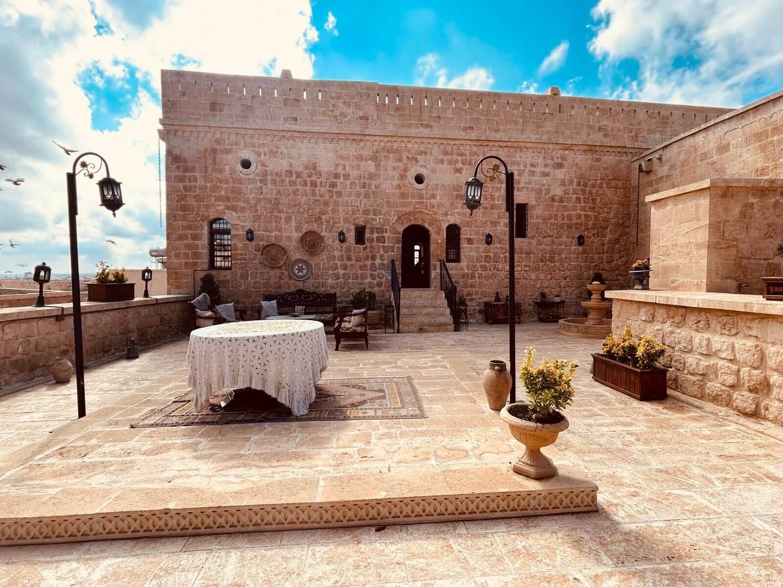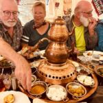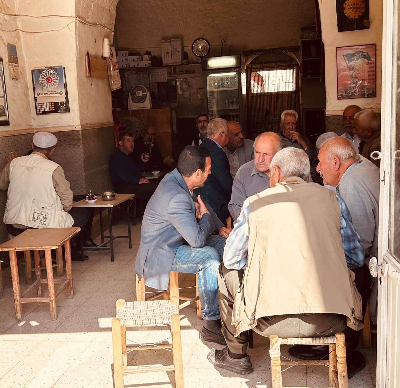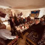 Unser Bus und unser Guide sind pünktlich und so starten wir am Morgen, um zuerst ein gemeinsames Frühstück einzunehmen. In Midyat wurde vor einigen Jahren bei Renovierungsarbeiten zufällig ein Eingang zu einer Höhlenstadt gefunden. Nach ersten Erkenntnissen hat diese unterirdische Stadt – Matiate – riesige Ausmaße. Über 1.900 Jahre sollen dort bis zu 70.000 Menschen gelebt haben. Wir bekommen das Frühstück in einem Hotel in einer dieser Höhlen unter dem Hotel serviert. Dieses Frühstück ist ein typisch türkisches Frühstück. Unser Guide erklärt uns, was wir auf den vielen kleinen Schälchen und Tellern finden. Es schmeckt alles prima und wir sind gut gesättigt, damit wir jetzt zu Fuß den neueren Teil Mityats erkunden können. Zunächst besuchen wir ein Herrenhaus, in dem Hochzeiten ausgerichtet werden können. Die Architektur und die Inneneinrichtung und auch hier der Zugang zur unterirdischen Stadt sind beeindruckend. Weiter geht es zum Stadtmuseum, in dem wir Ausstellungen sehen, die zum Leben im Osmanischen Reich gehören. Anschließend fahren wir mit unserem Bus in die Altstadt. Heute gibt es Freizeit zum Bummeln, Essen und Shoppen. Das Wetter lädt auch zum Eis und Tee oder Kaffee vor einem Geschäft in der Sonne ein. Zurück im Camp besprechen wir den nächsten Fahrtag und die Möglichkeit, in Kars, unserem übernächsten Ziel nach Ararat, ein traditionelles Gänseessen mit kaukasischer Folklore zu genießen. Jetzt wird es leider abends schnell kühl, sodass es nur noch ein kurzes Verweilen nach der Besprechung im Freien gibt.