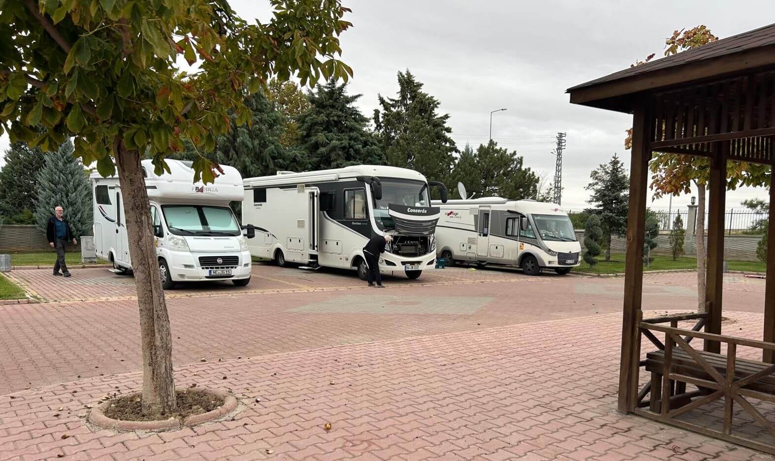 Eigentlich ist unser heutiges Ziel des Fahrtages Afyon. Aber da die Stadtverwaltung kurzfristig beschlossen hatte, unseren CP zu renovieren, entschieden sich alle, nach Konya zu fahren. Aus Bursa heraus gab es am Montagmorgen einen kräftig zähfließenden Verkehr. Dann führte uns unsere Route über eine landschaftlich interessante Gegend. Obwohl es teilweise stark regnete, konnten wir die Gebirgsregion des Uludağ (gewaltiger Berg) gut erleben. Auch Straßenbau mit Schotterersatzstraßen konnte uns nicht aufhalten. Danach folgt die Porzellanstadt Kütahya mit großen Märkten. Wir fahren weiter auf der anatolischen Hochebene und passieren Afyon. Von dort geht es weiter nach Konya. Für die heute insgesamt 500 km zu absolvierende Tour, gewinnen wir morgen einen Ruhetag in Konya. Wir fahren durch Acsehir, die Stadt Hoca Nasteddins und erreichen die 3-Millionen-Stadt Konya. Der Nachmittagsverkehr ist auch in türkischen Großstädten recht stocken. Dafür stehen wir auf einem Platz an einem Park, der alles bietet, was der Camper braucht. Nach der Ankunft trifft man sich zum Ankerbier. Morgen steht Ausschlafen auf dem Programm.