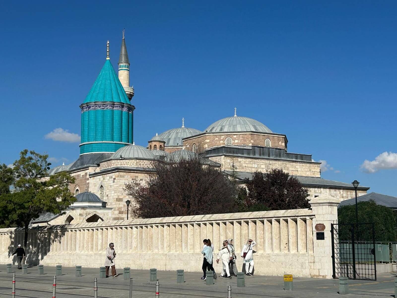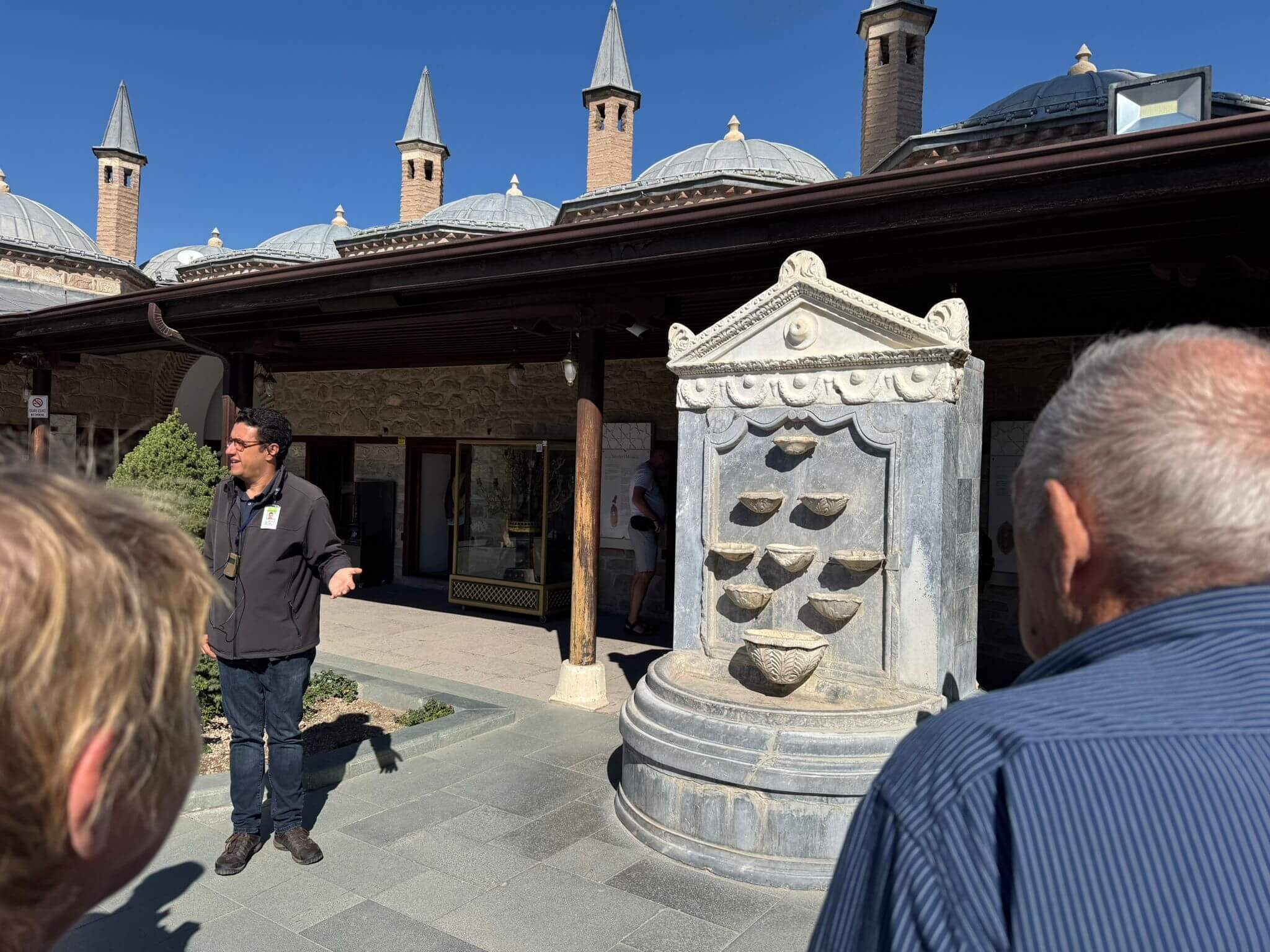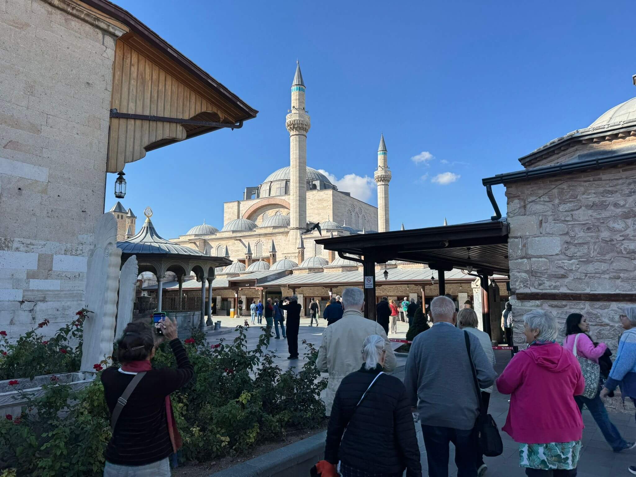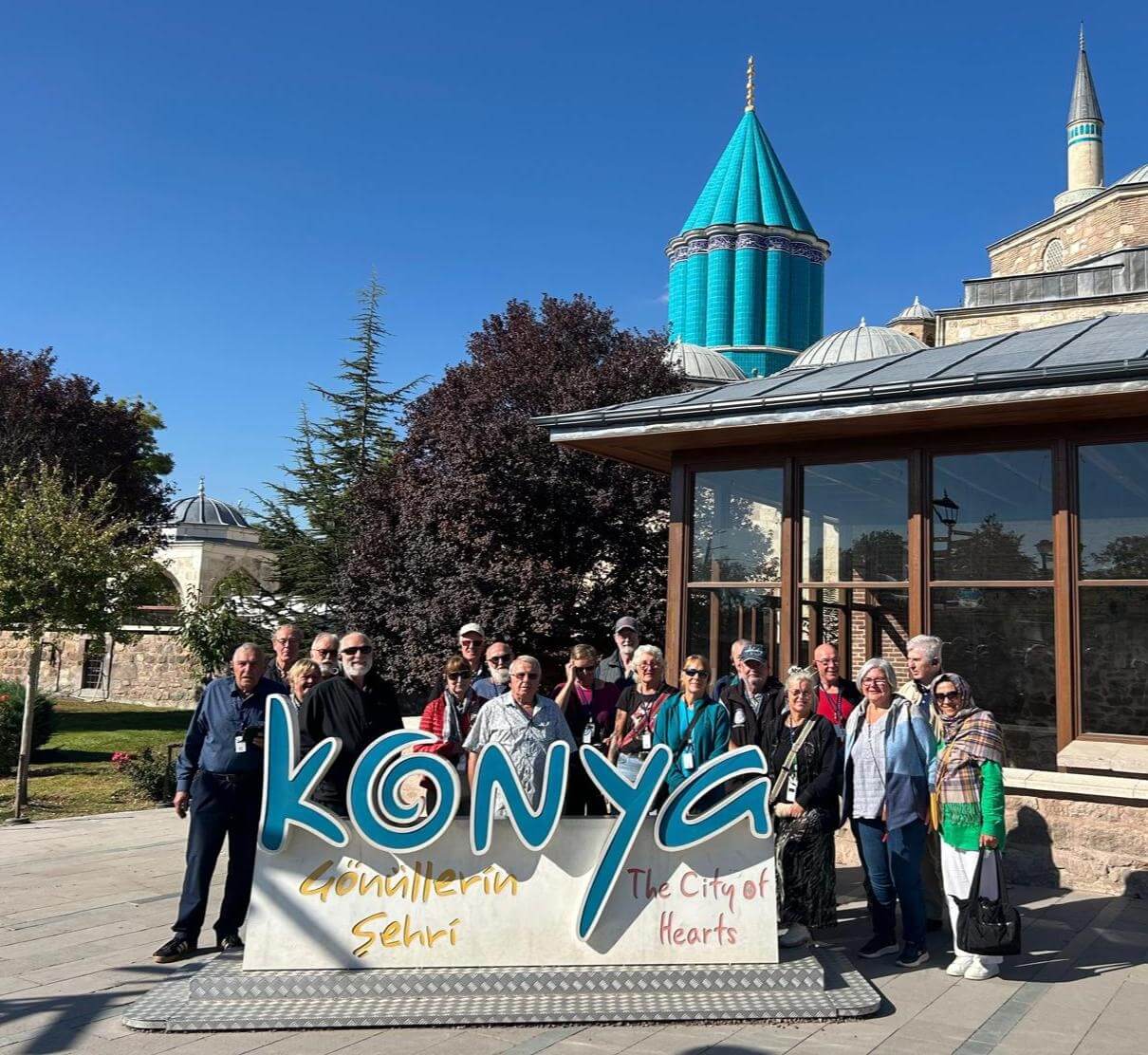 Der gestrige Ruhetag hat allen gutgetan. So starten wir am Morgen mit Sonnenschein am Himmel und im Herzen mit einem Bus, um Konya, die Stadt der Mevlevi-Tariqa, kennenzulernen. Unser erstes Ziel ist das Mausoleum des Gründers des Ordens, Dschalal ad-Din ar-Rumi, welches seit 1927 mit der Säkularisierung durch Atatürk zum Mevlana-Museum wurde. In dem Museum erfahren wir von unserem Guide und anhand der Ausstellung viel über diesen Orden des Islam, der in der ganzen Welt verbreitet ist. Nach einer kurzen Teepause auf dem Alaaddin-Hügel, einer aufgeschütteten Erhebung inmitten Konyas, um die Bauten der Sultane der Rum-Seldschuken-Dynastien aus der Umgebung hervorzuheben, besichtigen wir dort den letzten erhaltenen Rest der Mauern des alten Palastes und das größte noch erhaltene Bauwerk, die Alaaddin-Moschee, die zu Zeiten des mächtigen Seldschuken-Sultans Alaaddin Keykubat (regierte 1219 bis 1236 n. Chr.) fertiggestellt wurde. Bestaunt wird die prächtige Mihrab, die Gebetsnische in Richtung Mekka, die aus wundervoll gefertigten, türkisfarbenen Kacheln aus seldschukischer Zeit besteht. Dann bekommt wieder mal der Hunger die Oberhand und wir besuchen ein traditionelles Restaurant, in dem jeder sein Wunschgericht findet. Renner ist das im Ofen gebackene Lammfleisch. Nach dem Essen bringt uns der Bus zum Sille Subasi. Sille war eines der wenigen Dörfer, in denen bis 1922 kappadokisch-griechisch gesprochen wurde. Es war von Griechen bewohnt, die dort seit über 800 Jahren in friedlichem Zusammenleben mit den nahe gelegenen Türken von Konya lebten. Das währte über acht Jahrhunderte, weshalb es den Dorfbewohnern gelang, sowohl ihre griechische Muttersprache als auch ihre orthodoxe christliche Religion zu bewahren. Etwas, was in der heutigen Zeit leider immer seltener wird. Wir wandern durch das Dorf und nutzen eines der vielen Restaurants für eine Tee- oder Kaffeepause. Der Bus bringt uns anschließend zurück zum CP und wir haben Glück, dass wir in Konya noch nicht in der Rush-Hour landen. So haben alle Zeit, etwas zu relaxen und sich auf den absoluten Höhepunkt des Tages vorzubereiten. Wir besuchen eine Sufi-Zeremonie der Derwische. Die Eindrücke von dieser Zeremonie sind unbeschreiblich. Bei der Heimfahrt sind sich alle einig, dass dieser Tag ein weiterer unvergesslicher Bestandteil der Reise sein wird.