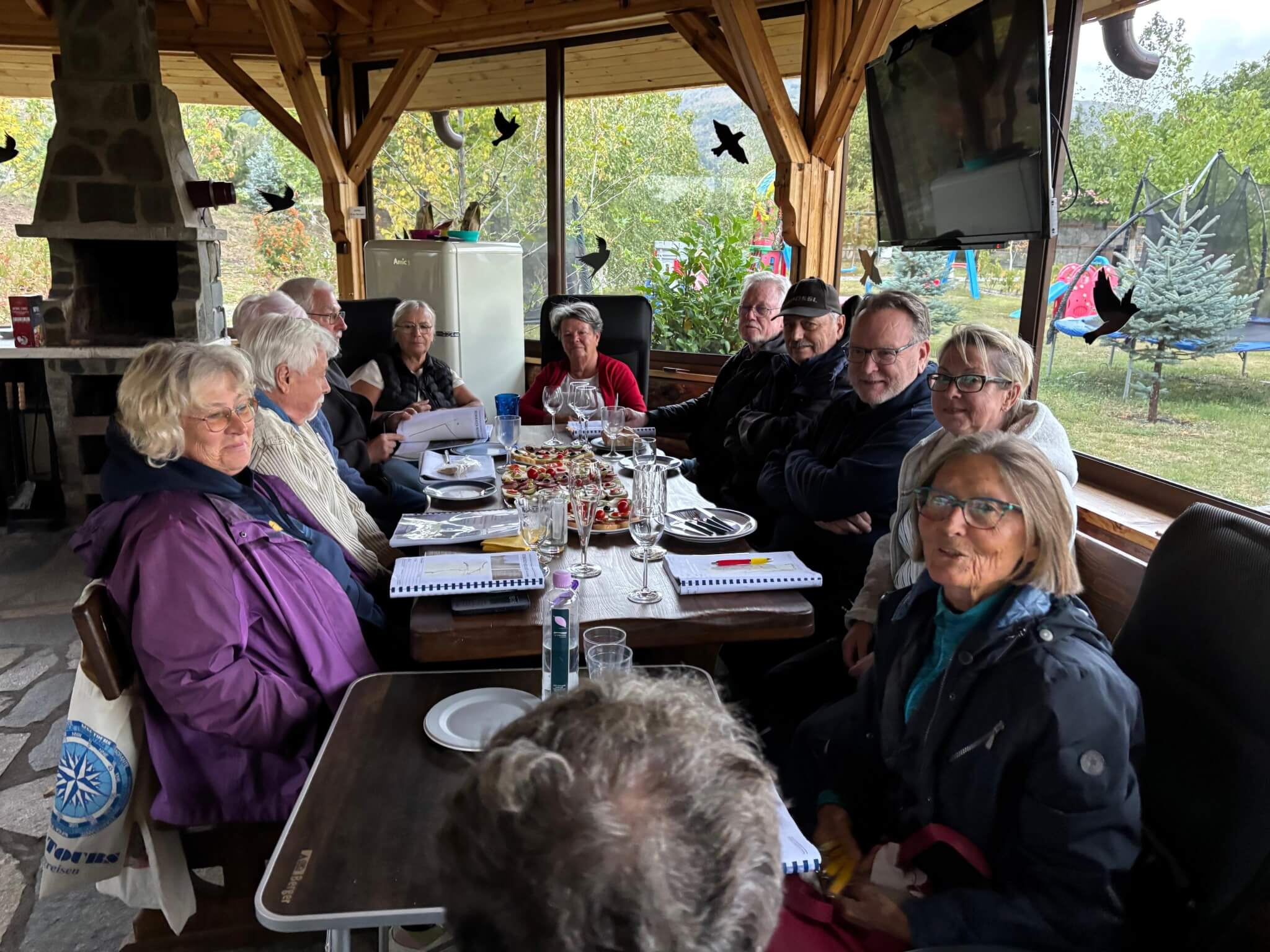 Heute haben wir eine nicht allzu lange, aber landschaftlich reizvolle Etappe vor uns. 144 Kilometer sind für alle leicht zu bewältigen. Nach 48 Kilometern bietet sich ein Abstecher ins malerische Dorf Bojentsi aus dem 16. Jahrhundert an. Es ist ein archäologisches und historisches Reservat. Die meisten entscheiden sich aber für das ca. 20 Kilometer entfernte Museumsdorf Etara. Das Freilichtmuseum bietet eine reichhaltige Sammlung technischer Anlagen. Es macht Spaß und ist sehr interessant, durch diese kleine Anlage zu bummeln. Nun nehmen wir den Shipka-Pass in Angriff. Von 1.195 Metern ü. NN. gelegenen Parkplatz auf Passhöhe sieht man das Denkmal der Schlacht von 1877. Es erinnert an die Kämpfer der russischen Truppen und der bulgarischen Landwehr, die hier die Frontlinie gegen die heranrückenden Osmanen verteidigten. Aufgrund des Nebels lohnt heute ein Aufstieg zum Denkmal nicht. Nachdem wir wieder einige Kilometer bergab gefahren sind, biegen wir zum Shipka-Kloster ab. Die schöne russisch-orthodoxe Kirche wurde 1877/1878 im Auftrag des russischen Zaren Alexander, in Gedenken an die Schlacht im kalten Winter 1877, errichtet. In Kazanlak bietet sich noch die Besichtigung eines originalgetreu nachgebauten Thrakergrabes direkt neben dem Original an. Es ist ein UNESCO Weltkulturerbe aus dem 4. Jahrhundert v. Chr. und ein bedeutendes Beispiel thrakischer Kunst und Architektur. Nach weiteren 25 Kilometern erreichen wir unseren großzügig angelegten Campingplatz im berühmten Rosental. Neben dem Campingplatz kann die Reiseleitung noch ein Wohnmobil der besonderen Art auf einem in ihrer Heimatstadt gebauten Fahrzeug bestaunen. Am Abend, im Nachgang zu unserer Fahrerbesprechung, spendiert Kuga belegte Brote und Wolfgang anlässlich seines Geburtstages Wein und Bier. Obwohl das Wetter kühl und regnerisch ist, haben wir in unserem beheizten Pavillon einen stimmungsvollen gemeinsamen Abend.