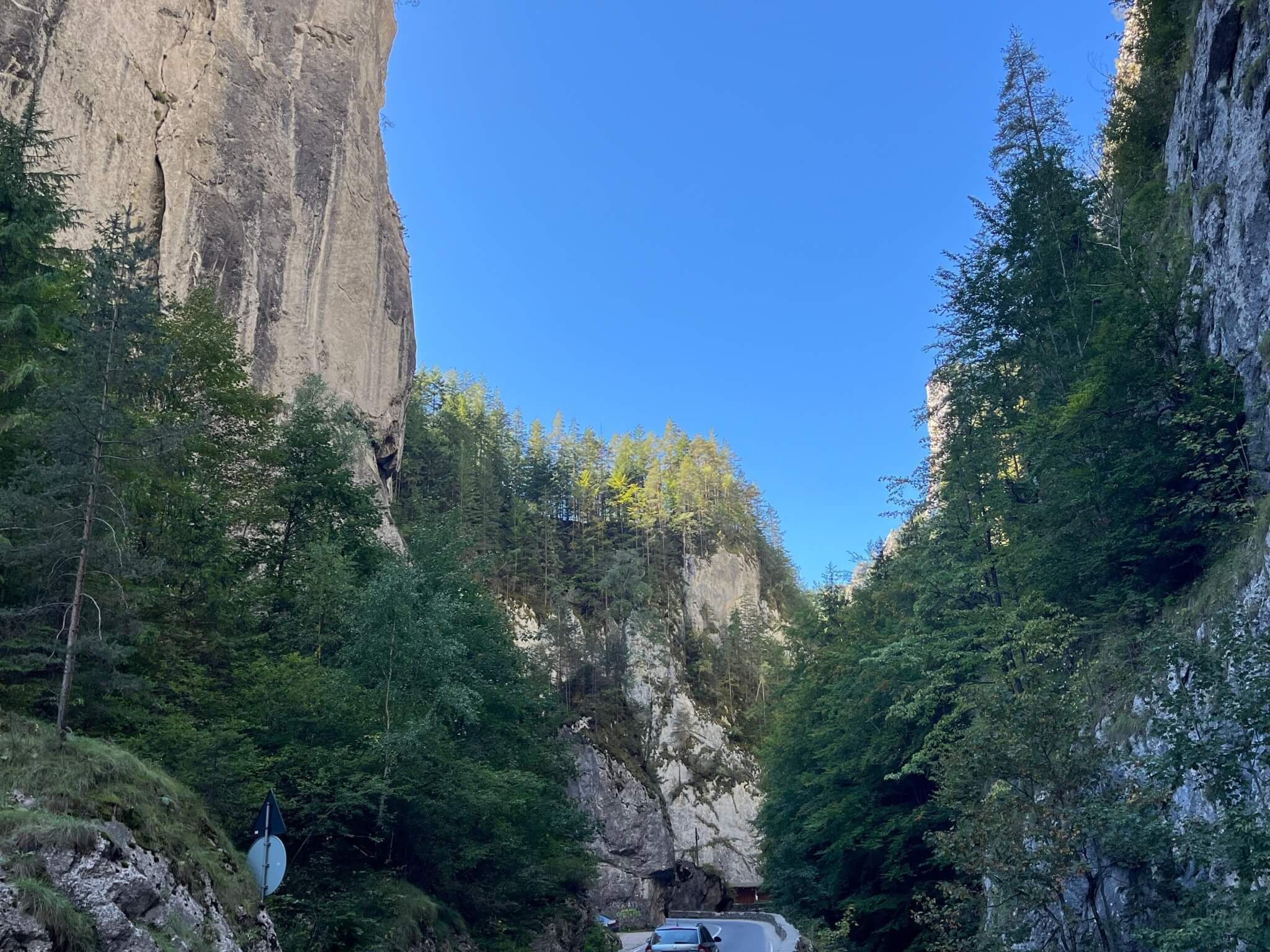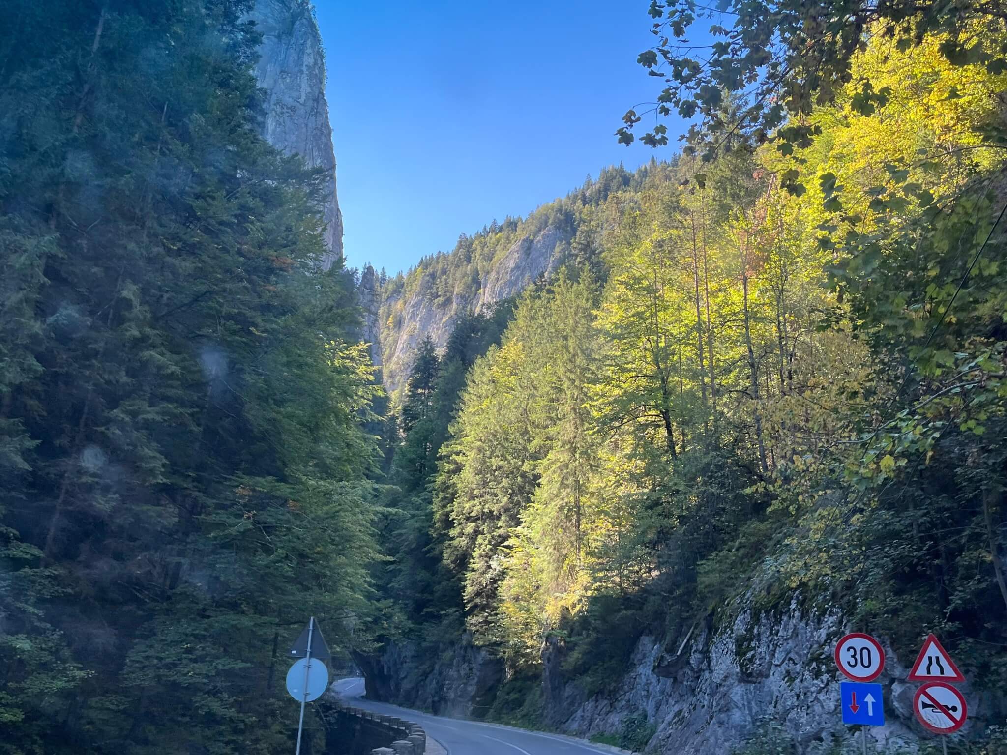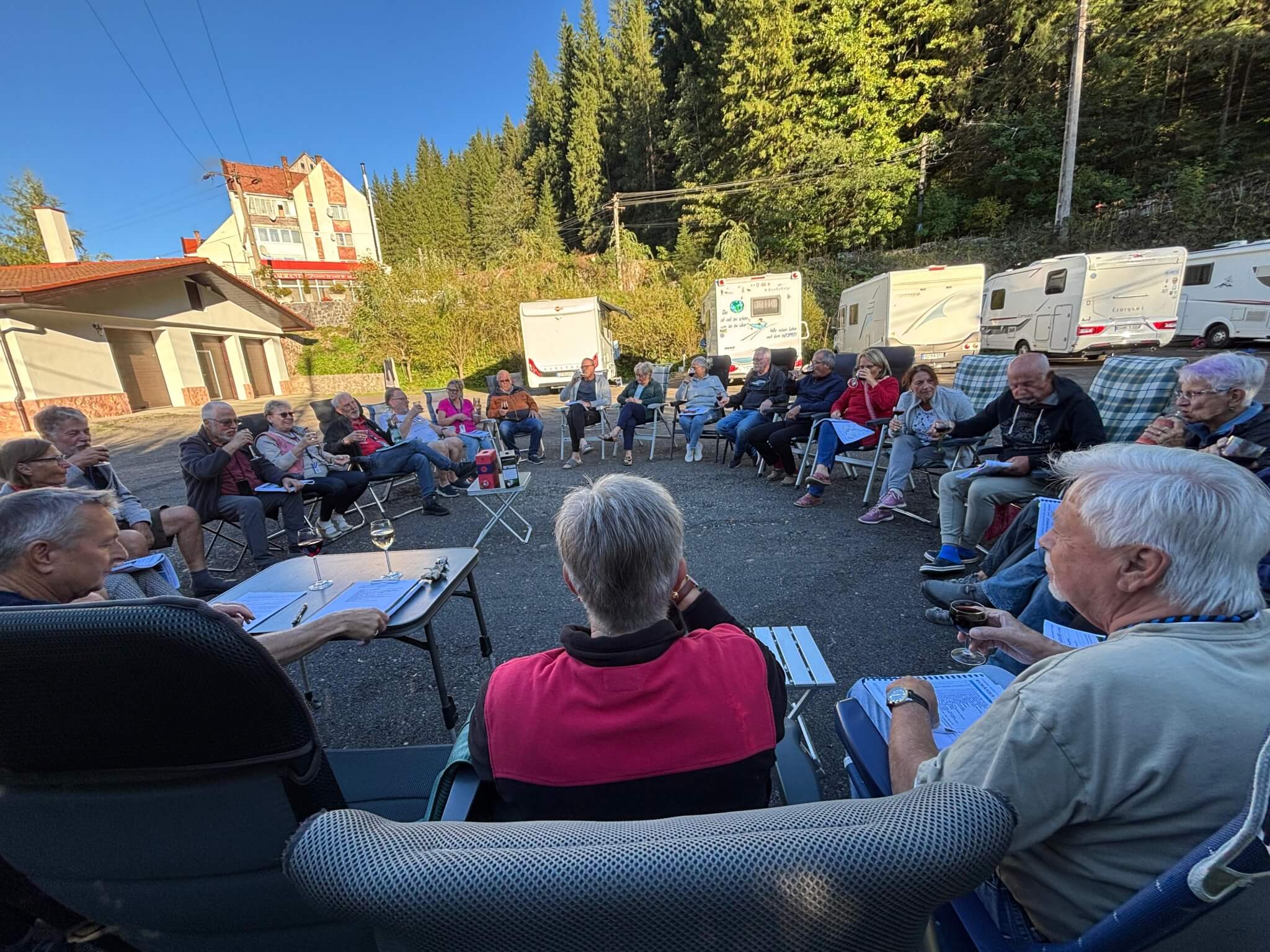 Heute liegt mit 272 Kilometern nochmals eine lange Strecke vor uns. Aber das schöne Wetter und die tolle Landschaft lassen uns die Fahrt genießen. Zuerst passieren wir einige Klöster, welche wir gestern schon auf unserem Busausflug besichtigt haben. Wir fahren durch Solca mit der angeblich besten Luft Rumäniens. Wir kommen heute wieder durch viele kleine Dörfer mit hübschen Kirchen. Im weiteren Verlauf der Tour gibt es auch weitere noch wirklich sehenswerte Klöster zu besichtigen. Wir beginnen mit dem Kloster Neamt, einem rumänisch-orthodoxen Männerkloster, dem ältesten der Moldauklöster. Es wurde bereits im 14. Jahrhundert gegründet. Früher war hier eine Schule für Miniaturmalerei und Kalligrafie untergebracht. Sehr beeindruckend ist der Buchladen des Klosters. Kurz davor ist noch eine sehr schön bemalte Kirche einen Halt wert. Weiter geht es zum Kloster Agapia aus dem 18. Jahrhundert. Die Anlage ist strahlend weiß wie ein griechischer Tempel. Danach lohnt ein weiterer kleiner Abstecher zum im Jahre 1785 gegründeten Kloster Varatec mit seinen drei Kirchen. Am Ende bietet sich noch ein kurzer Besuch des im Jahre 1490 gegründeten Klosters Bistrita an. Danach gilt es nur noch die wunderschöne Landschaft zu genießen. Es empfiehlt sich noch ein kurzer Abstecher zum Bicaz-Stausee, bevor wir in die bezaubernde Bicaz-Klamm einfahren. Wir fahren unter spektakulären Felsüberhängen und zwischen hoch aufragenden Felsen hindurch. Für alle Fahrzeuge ist dies aber problemlos möglich. Langsam beginnen wir das Ceahlau-Bergmassiv, auch Olymp der Moldau genannt, zu überwinden. Auf halber Strecke erreichen wir unseren heutigen Stellplatz am Hotel Lacu Rosu. Dessen Restaurant nutzen am Abend mehrere Reiseteilnehmer zum Abendessen. Zuvor gilt es aber noch den folgenden Tag zu besprechen und dabei den von Elke und Horst spendierten Wein zu genießen.