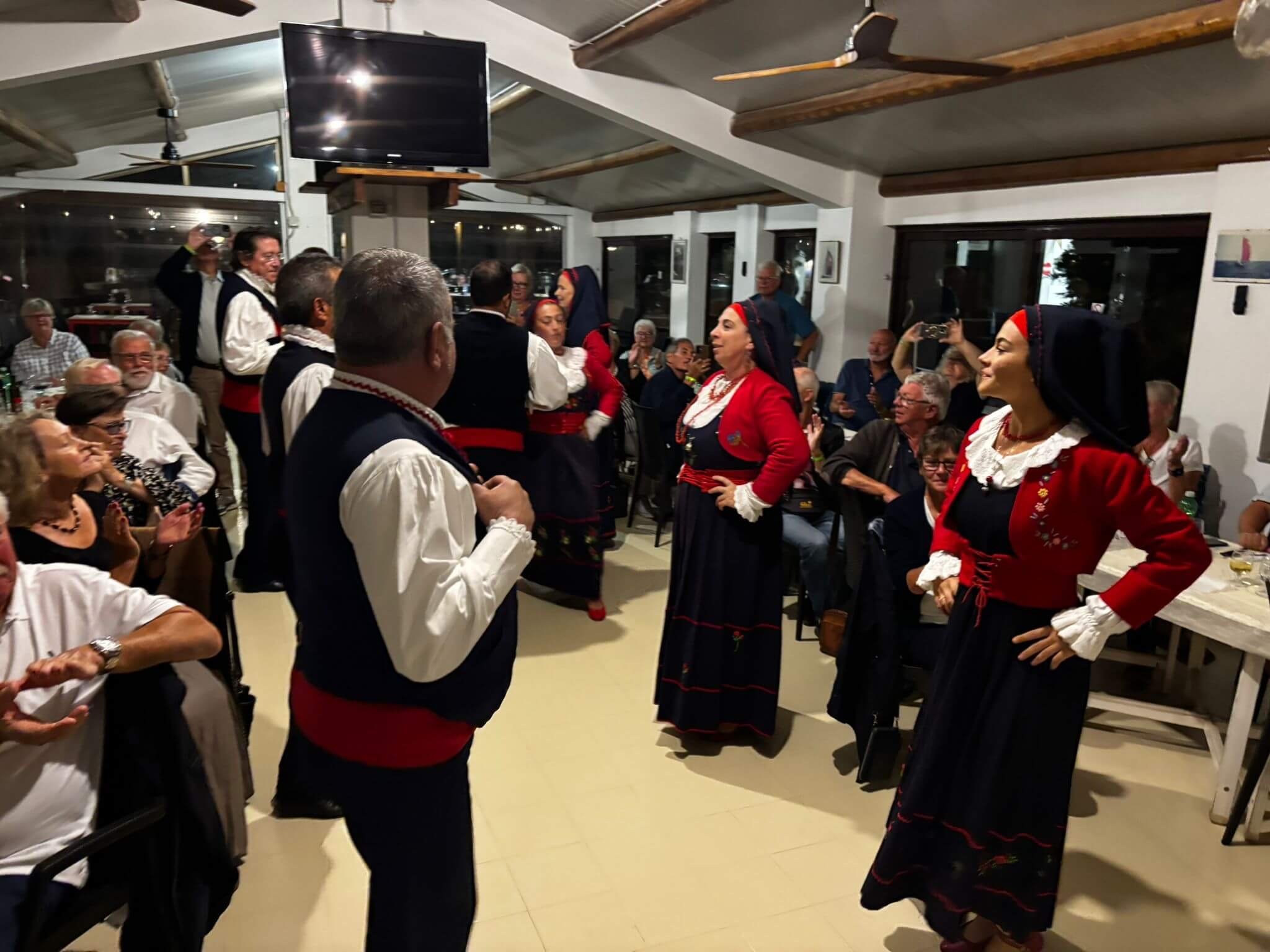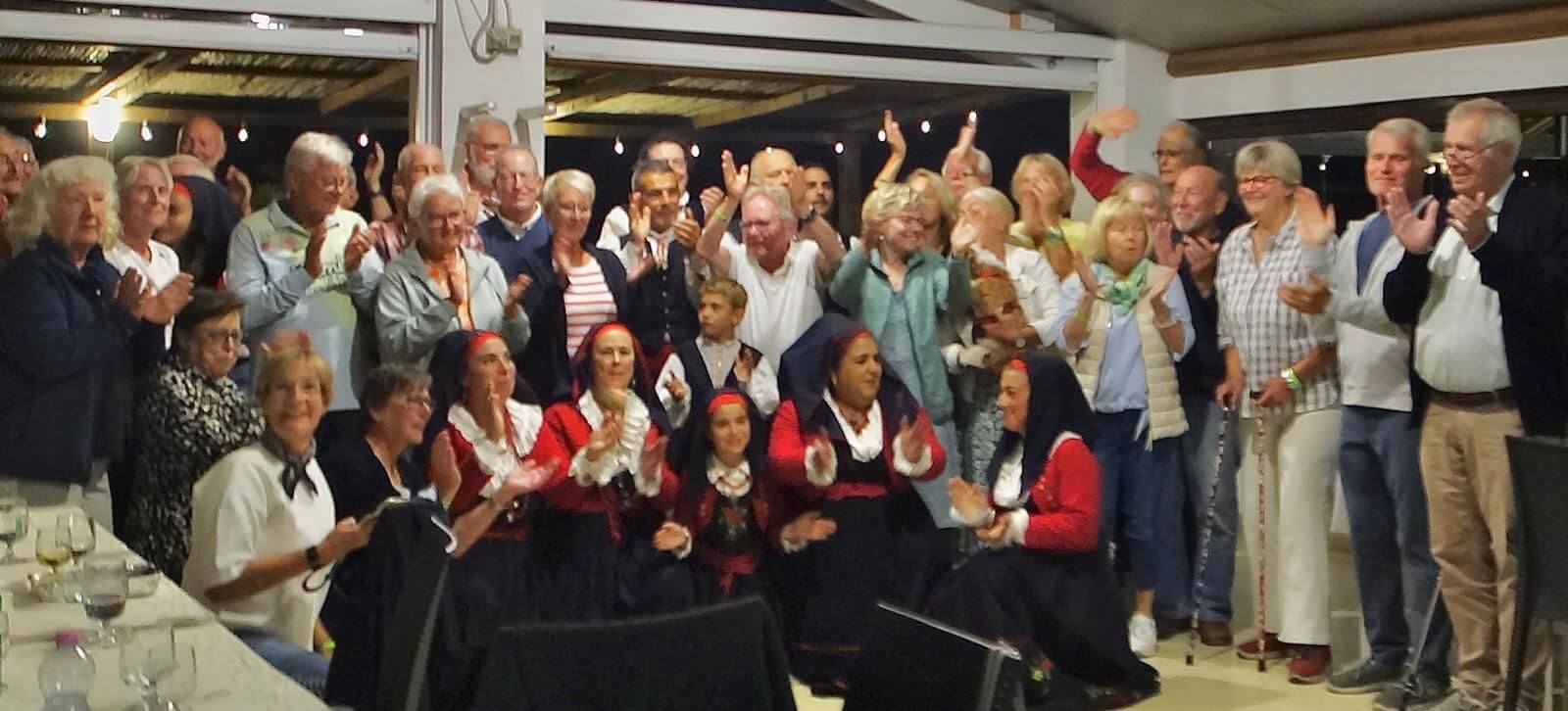 Wir freuten uns über den Ruhetag, denn die bisherigen Programmtage hatten uns doch sehr oft ganz schön gefordert. Einige stiegen auf ihre Räder und erkundeten die Umgebung. Andere ruhten sich aus. Manche vergnügten sich bei einem Strandspaziergang. Wilfried schrieb eine Erinnerung in den Sandstrand und diese wurde fünf Minuten später wieder vom hohen Wellengang weggespült. Doch am Abend merkte man, dass wir uns wieder über einen neuen Programmpunkt freuten. Wir begannen mit dem Abendessen, das wie immer üppig und gut ausfiel. Wir freuten uns auch über die immer guten Landweine von Sardinien. Doch dann kam ein echter Höhepunkt. Eine Folkloregruppe reiste aus Santa Teresa an und zeigte uns herrliche Tänze. Gekleidet waren sie in ihren handgemachten Trachten. Am Schluss der Vorführung forderten sie uns alle auf, einfach mitzutanzen. Wir hatten alle eine große Freude daran, mit den Einheimischen zu tanzen. So verging auch dieser Abend wie im Fluge. Jetzt bleiben uns noch vier Tage und wir sind gespannt, was wir noch erleben dürfen.