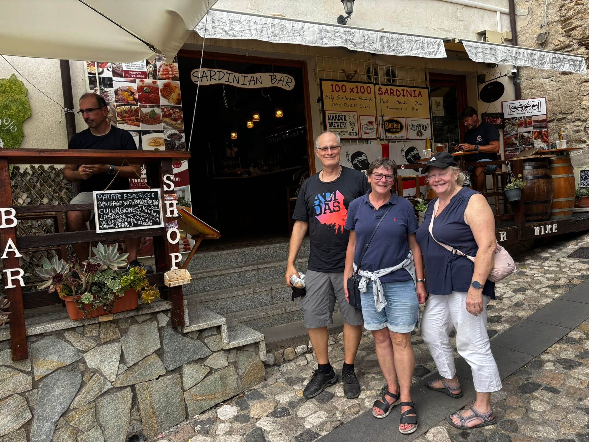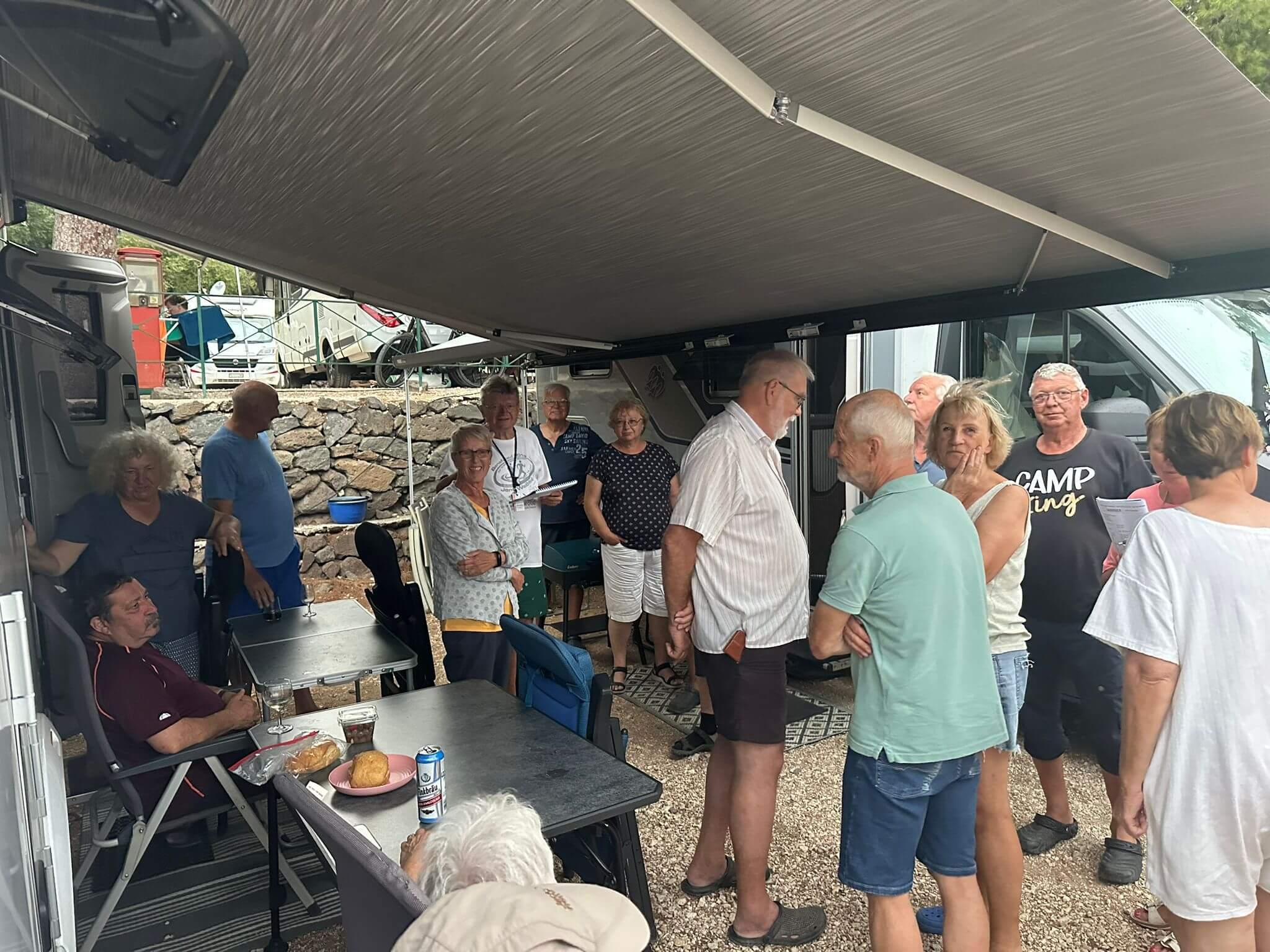 Im Laufe des Vormittags fuhren wir gut ausgeruht mit unseren Campern gegen Süden zu unserem neuen Stützpunkt. Auf der Strecke versorgten wir uns an den verschiedensten Supermärkten oder Spezialgeschäften mit dem Nötigsten. Als Erstes fuhren wir zu der Burganlage Posada. Wer den Aufstieg auf den Turm wagte, wurde mit einem wunderschönen Ausblick auf die Gegend belohnt. Wunderschöne kleine Gastronomien luden zu einem Imbiss oder Getränk ein. Weiter ging es über Orosei. Diese Stadt gehört zum Nationalpark Gennargentu und Golf von Orosei. Ein wunderschönes kleines Städtchen. Danach passieren wir den Marmorsteinbruch mit gigantischen Ausmaßen. Dann würde eine Grotte auf uns warten. Leider war diese heute geschlossen. So fuhren wir über eine bezaubernde Berglandschaft runter zu unserem neuen Camp Palmasera. Hier wollten wir eine kleine Campertafel machen. Leider hatten wir Pech mit dem Wetter. Denn genau zu diesem Zeitpunkt begann es zu regnen. So machten wir es uns unter den Markisen bequem und wanderten von einem zum anderen Wohnmobil und versuchten verschiedene Spezialitäten.