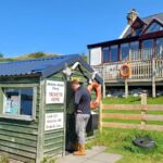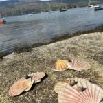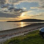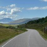 Mit 103 km haben wir heute einen kurzen Fahrtag vor uns. Aber wir fahren fast die ganze Strecke auf Single-Track-Roads. Es gibt nur eine Fahrbahn und regelmäßig eine Bucht, um Fahrzeuge passieren zu lassen. Das Wichtigste ist jedoch die wunderschöne Landschaft. Seit einigen Tagen genießen wir entlang der Nordküste Schottlands eine berauschende Abwechslung: grüne, sanfte Berge mit Wiesen, durchzogen von Bächen, moorig braun und in stille Lochs mündend oder sich tief ins Land einschneidende Fjorde, die sich von den Seen nur durch die an den Ufern sichtbaren Gezeiten unterscheiden. Bei diesen wundervollen Ausblicken muss trotzdem viel Aufmerksamkeit der Straße gewidmet werden. Die Fahrbahnen hier im Norden sind doch alle in einem – vorsichtig ausgedrückt – kritischen Zustand. Unser CP in der Nähe von Ullapool ist herrlich gelegen. Alle Stellplätze befinden sich unmittelbar am Wasser. Dazu kommt strahlender Sonnenschein, sodass man fast baden gehen möchte. Aber das steinige Ufer und das kalte Wasser schrecken dann doch bis auf einige Hartgesottene ab. Ein Spaziergang lohnt sich jedoch am Ufer, um Ausschau nach Jakobsmuscheln zu halten. Bei unserer abendlichen Teilnehmerbesprechung wird nicht nur der morgige Fahrtag besprochen, sondern auch die nächsten anstehenden Feiermöglichkeiten. Am Abend länger draußen zu sitzen, ist nicht angebracht. Die Mücken schlagen erbarmungslos zu.