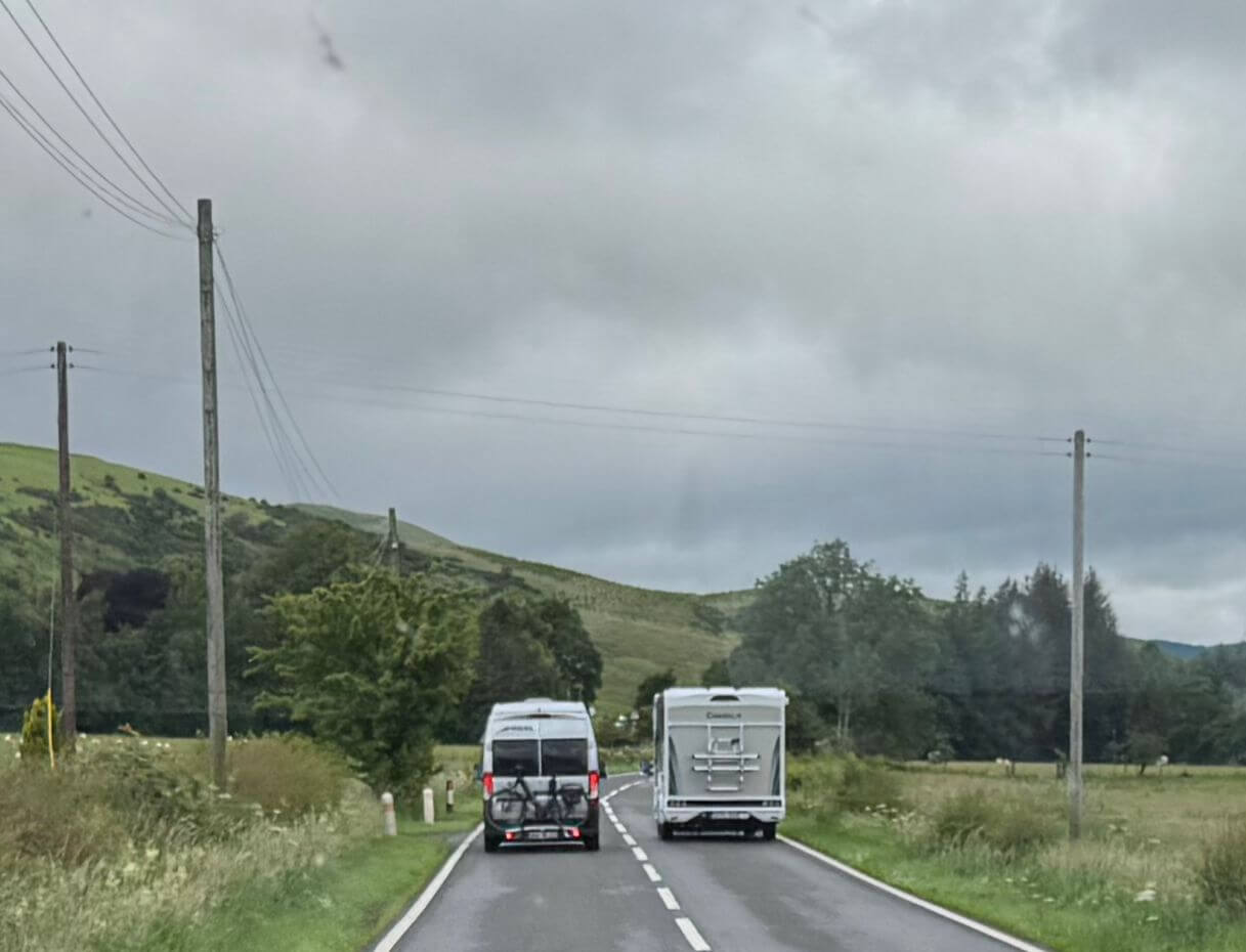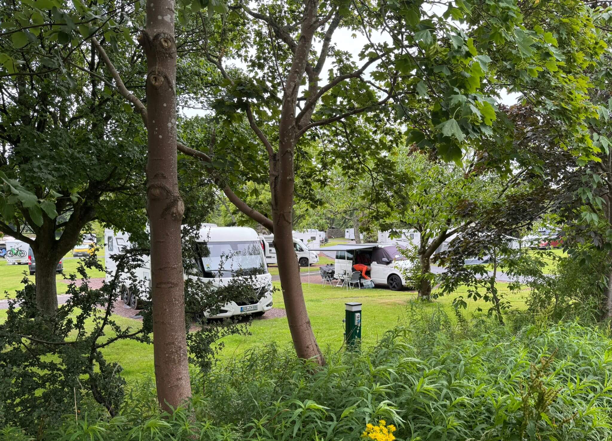 Unser dritter Fahrtag führt uns zunächst nach Gretna Green. Dort hat ein schottischer Schmied die Gelegenheit genutzt, britischen Verliebten, die in ihrer Heimat England dazu zu jung waren, eine Heirat nach schottischem Recht zu ermöglichen. Es war sicher nicht zu seinem Schaden. Noch heute nutzen die Nachfahren diese Idee, um viele Menschen zur Besichtigung, zum neuen Eheversprechen und natürlich zum Shoppen anzulocken. Danach stehen die Border Abbeys auf dem Stoppplan unserer Tour nach Edinburgh. In Jedburgh und Melrose wird erst besichtigt und fotografiert und dann geht es natürlich auch in die Woollen Mills. Schließlich befinden wir uns mit Hawick im Home of Cashmere und fahren durch Galashiels auf dem Woollen Trail. Wenn man die vielen Schafe auf den Weiden sieht, scheint es jedenfalls keine Rohstoffprobleme zu geben. In Peebles kann noch einmal das Flair einer schottischen Kleinstadt an einem Sonntag erfahren werden und dann sind wir schon in Edingburgh auf unserem komfortablen Campingplatz. Das Wetter zeigt sich leider heute von der wechselhaften Seite. Die 35° von unserer Anreise pegeln sich heute bei ca. 15° C ein.