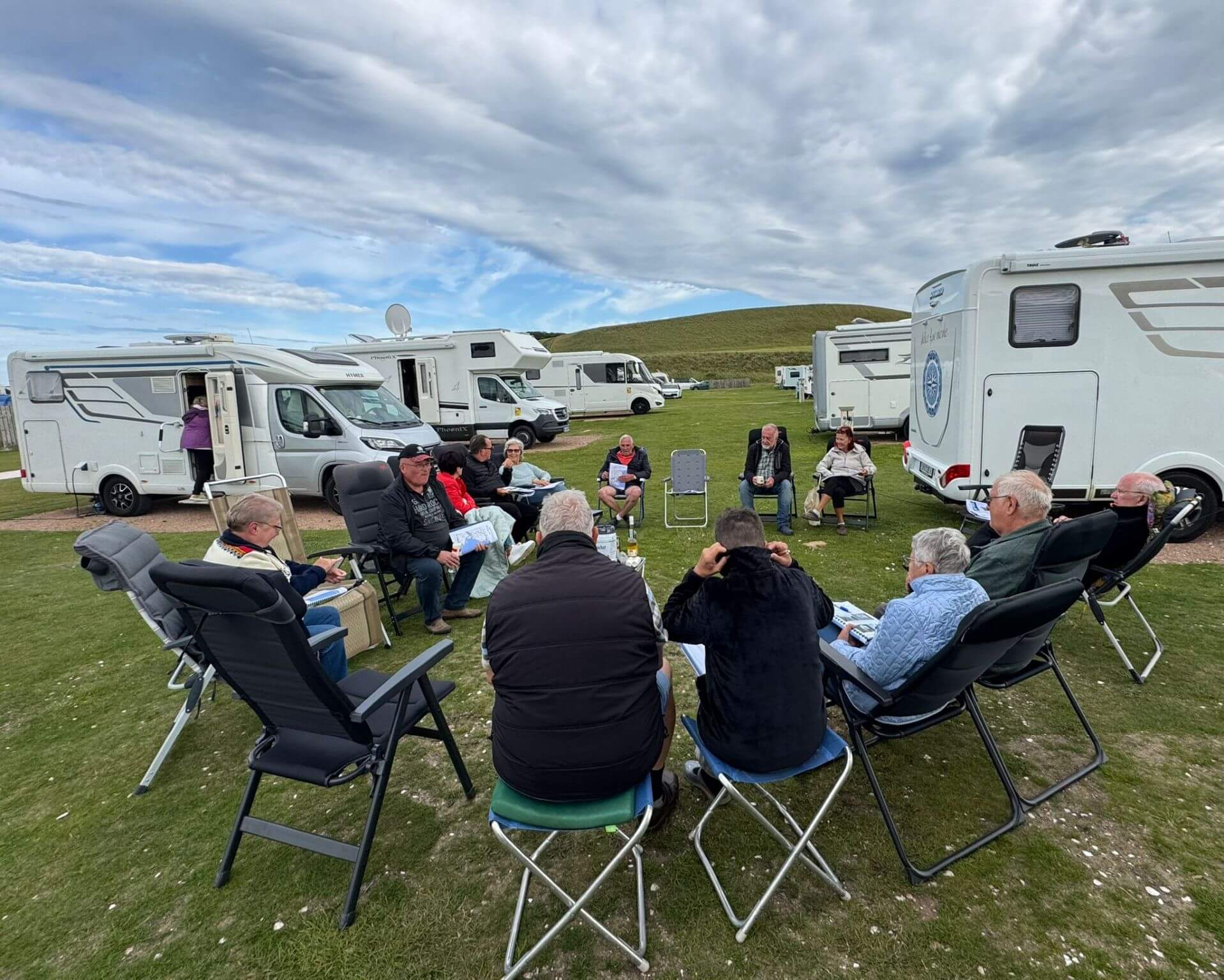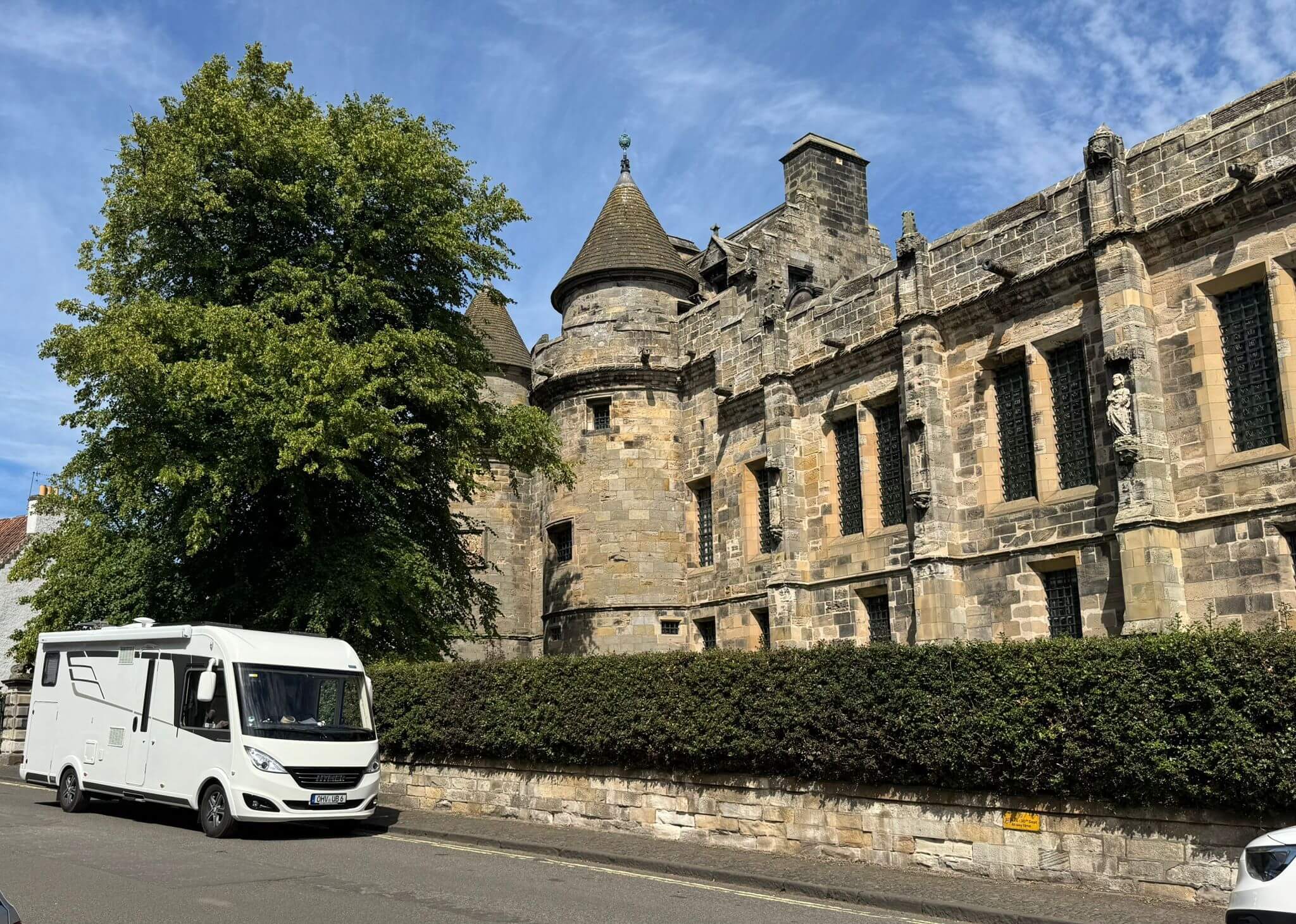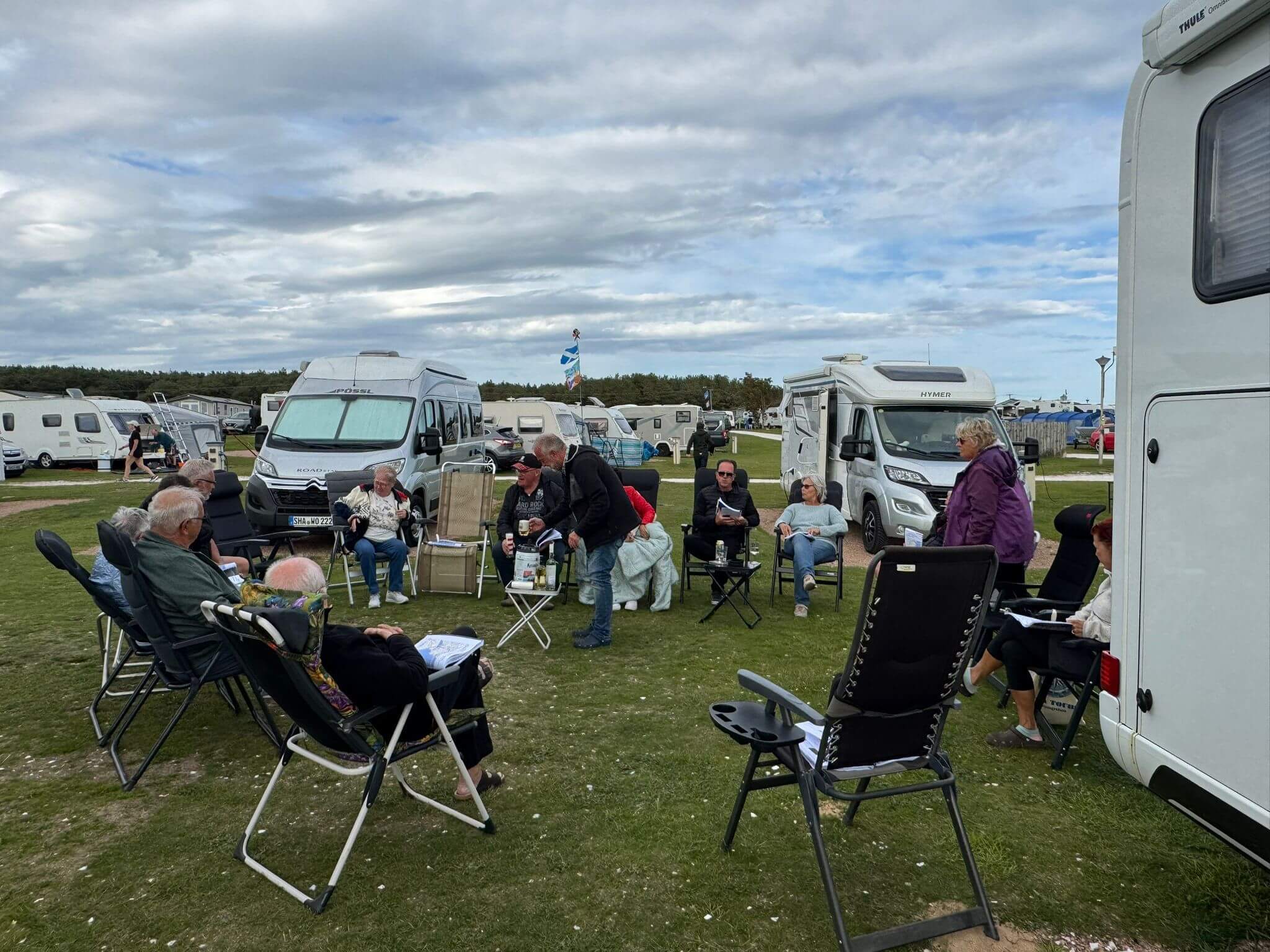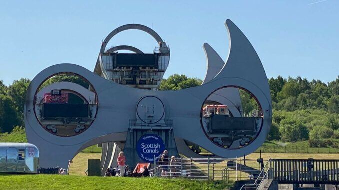 Heute haben wir eine erlebnisreiche Tagesetappe vor uns. Nach Verlassen von Edinburgh fahren wir durch das Städtchen South Queensferry, das fast am Ende des Firth of Forth liegt. Wir haben einen Stopp, um die drei Brücken über den Forth zu fotografieren, die Forth Road Bridge, die Forth Bridge und die Queensferry Crossing. Die gigantische Hängebrücke über den Firth of Forth ist ca. 2,5 km lang. Unser nächster Halt ist ein Besuch bei Falkirk Wheel, dem einzigen rotierenden Schiffshebewerk der Welt. Am Loch Leven hat jeder nach dem ersten Teil unserer Tour einen Kaffee verdient. Eine kleine Insel liegt in dem See, auf der die schottische Königin Mary Stuart fast ein Jahr lang als Gefangene des schottischen Parlamts lebte. Unser Weg auf der Halbinsel Fife führt uns dann über Leslie nach Falkland. Dort bietet sich ein Besuch des Palace, aber insbesondere des Gartens an. Im Vorbeifahren können wir noch einen Blick auf eine Destille werfen, die u. a. die bekannten Marken Smirnoff und Gordons produziert. Unser Camp liegt an der Nordsee und zeigt uns mit der Sonne seine freundliche Seite. Wir halten unsere Teilnehmerbesprechung im Sonnenschein und doch frischem Nordseewind ab. Nach dem Abendessen gibt es trotz der steifen Brise von der Nordsee noch eine gemütliche Runde mit interessanten Gesprächen. Dank warmer Kleidung und zahlreicher geistiger Spenden ist das Wetter dann auch ziemlich egal.