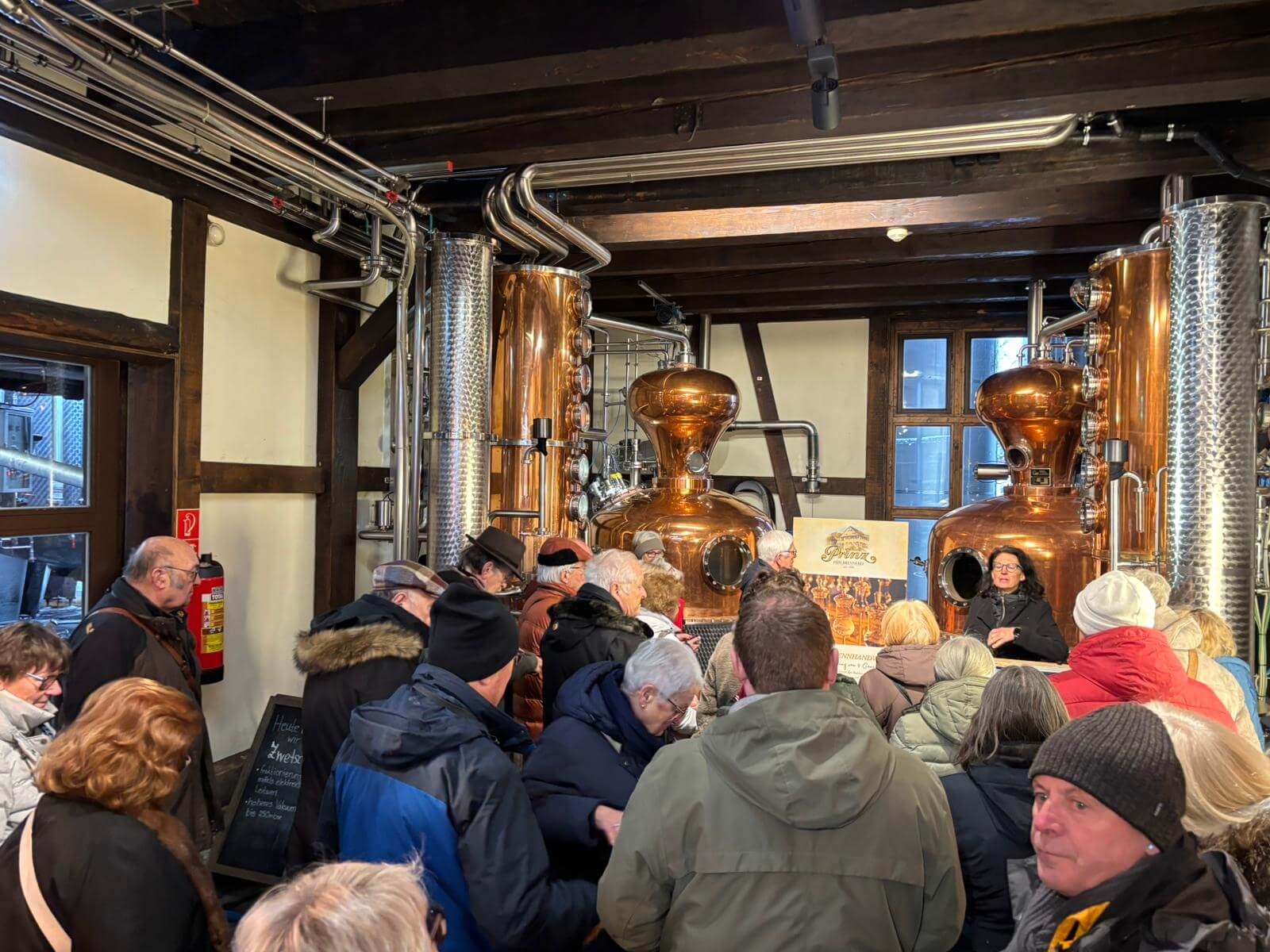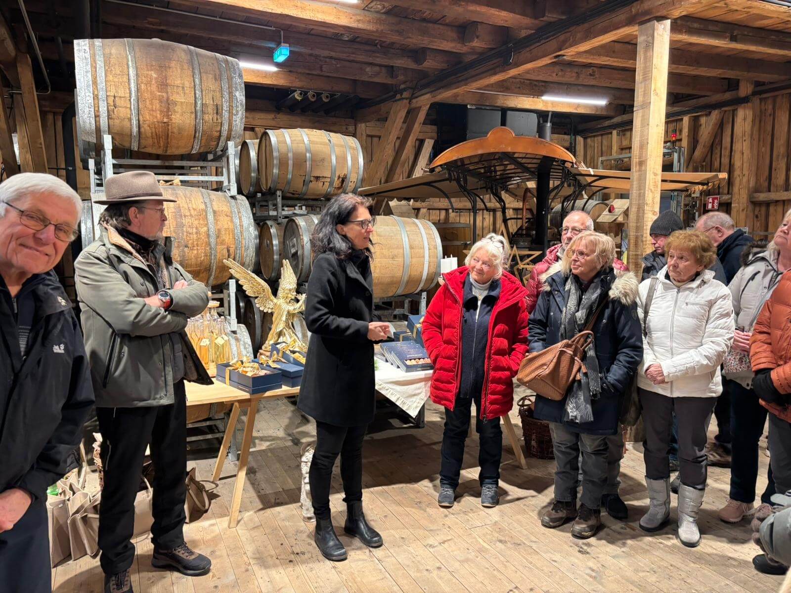 Mit dem Bus ging es los nach Hörbranz zur Schnapsbrennerei Prinz. Wir wurden sehr freundlich von einer Mitarbeiterin der Brennerei begrüßt. Sie führte uns sehr fachkundig durch die Brennerei und am Schluss der Führung durften wir noch eine Vielzahl von sehr edlen Produkten verkosten. Die vielen Angebote regten uns natürlich auch zum Kauf an. So, dann ging es weiter mit dem Bus nach Bregenz. Hier warteten schon zwei sehr fachkundige Guides auf uns. So erfuhren wir, dass Bregenz die Landeshauptstadt von Vorarlberg ist. Wir erfuhren, wie sich die Bregenzer Festspiele entwickelten und wir durften auch noch viele Besonderheiten der Stadt erleben, so auch die Geschichte vom Seebrünzler, die uns sehr zum Lachen animierte. Dann ging es aber hoch hinauf auf 1064 Meter zum Pfänder. Glück hatten wir auch noch mit dem Wetter und so konnten wir noch eine herrliche Aussicht nach Lindau und auf die Schweizer Berge genießen. Sehr deutlich war auch der Zulauf des Rheines in den Bodensee zu erkennen. In der Pfänder Dohle kehrten wir bei Wirt Alexander ein. Mit der Seilbahn ging’s dann wieder runter und mit dem Bus fuhren wir ins Kloster Mehrerau. Der Abt Vinzenz begrüßte uns sehr herzlich und anbei besichtigten wir auch noch die schöne Klosterkirche. Aber jetzt wartete schon unser Abschiedsessen im Gasthof Lamm auf uns. Der Wirt Peter Schenk kochte ein sehr vorzügliches Drei-Gänge-Menü für uns. Begrüßt wurden wir auch von dem Senior Helmut Schenk und von Daniel Schenk. Sie erzählten uns die Geschichte, wie dieser Gasthof entstand und sich zu einem der führenden Restaurants im Bregenzer Umfeld entwickelte. Viel zu schnell waren die Zeit und auch schon unsere Reise vorbei. Die Reiseleiter verabschiedeten sich und sagten Dank für das gute Miteinander. Wir alle freuten uns über die vielen Bekanntschaften und die neuen Freundschaften, die sich dabei entwickelt hatten. Im Namen der Firma KUGA bedankten sich die Reiseleiter nochmals für die Buchung und das KUGA-Team freut sich, wenn wir uns mal wieder auf einer KUGA-Reise treffen können.