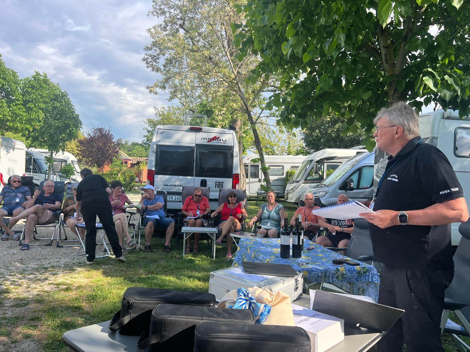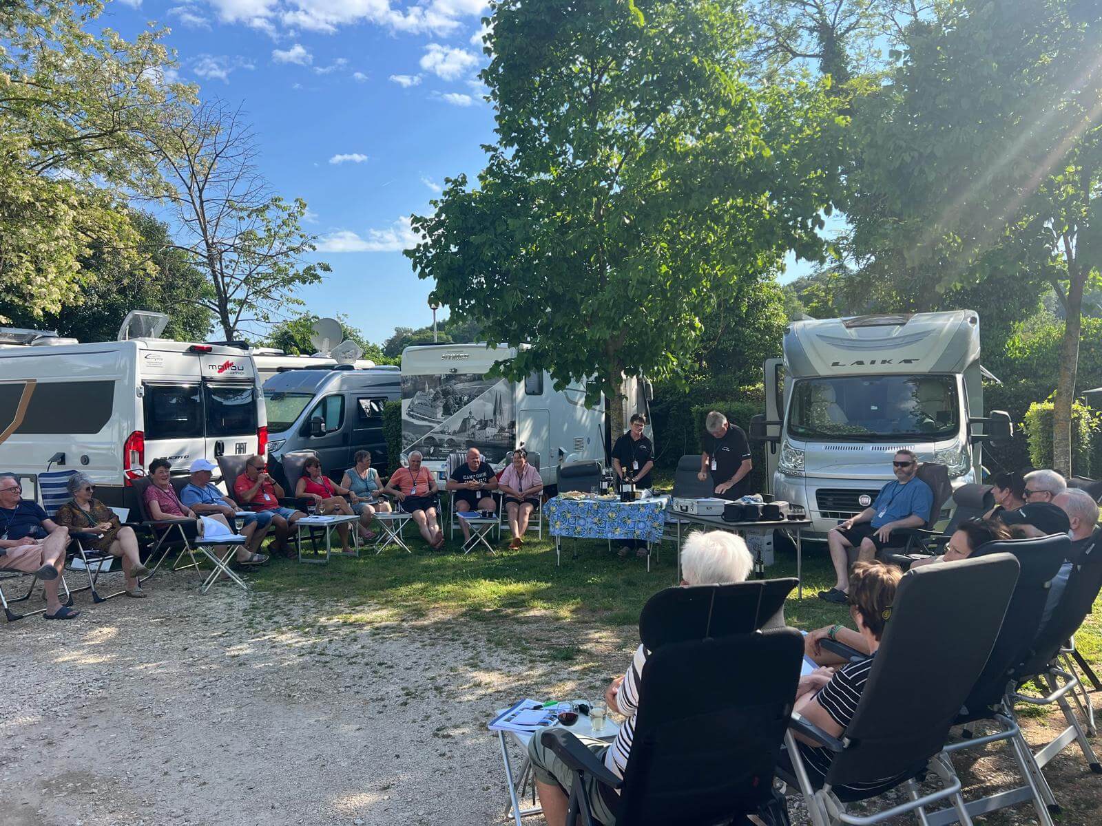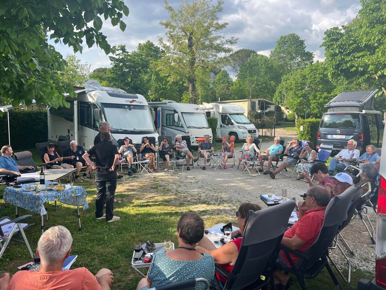 Am frühen Nachmittag sind alle Teilnehmer wohlbehalten auf unserem Campingplatz in Rom eingetroffen. Bis zur Begrüßung haben wir die Sonne in unseren Liegestühlen genossen. Im nahegelegenen Supermarkt wurden noch diverse Dinge eingekauft und schon ging’s los mit der Begrünung durch den Guide. Christine hatte einige kleine Häppchen vorbereitet und dazu gab es Rot- und Weißwein. Die Navis, auf denen die gesamte Reise abgespeichert ist, wurden ausgeteilt und erklärt. Dann die Audioguides verteilt. Damit wurde jeder mit den notwendigen Utensilien für unsere tolle Reise ausgestattet. Claudia blies uns mit ihrem Horn noch ein Eröffnungsständchen. Danach gingen wir zur Gaststätte zum gemeinsamen Abendessen. Herrlich anzusehen war, wie sich die Teilnehmer schon sehr angeregt miteinander unterhalten haben. Alle freuen sich auf unsere gemeinsamen Tage.