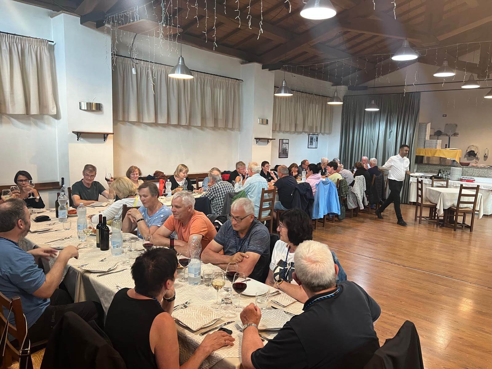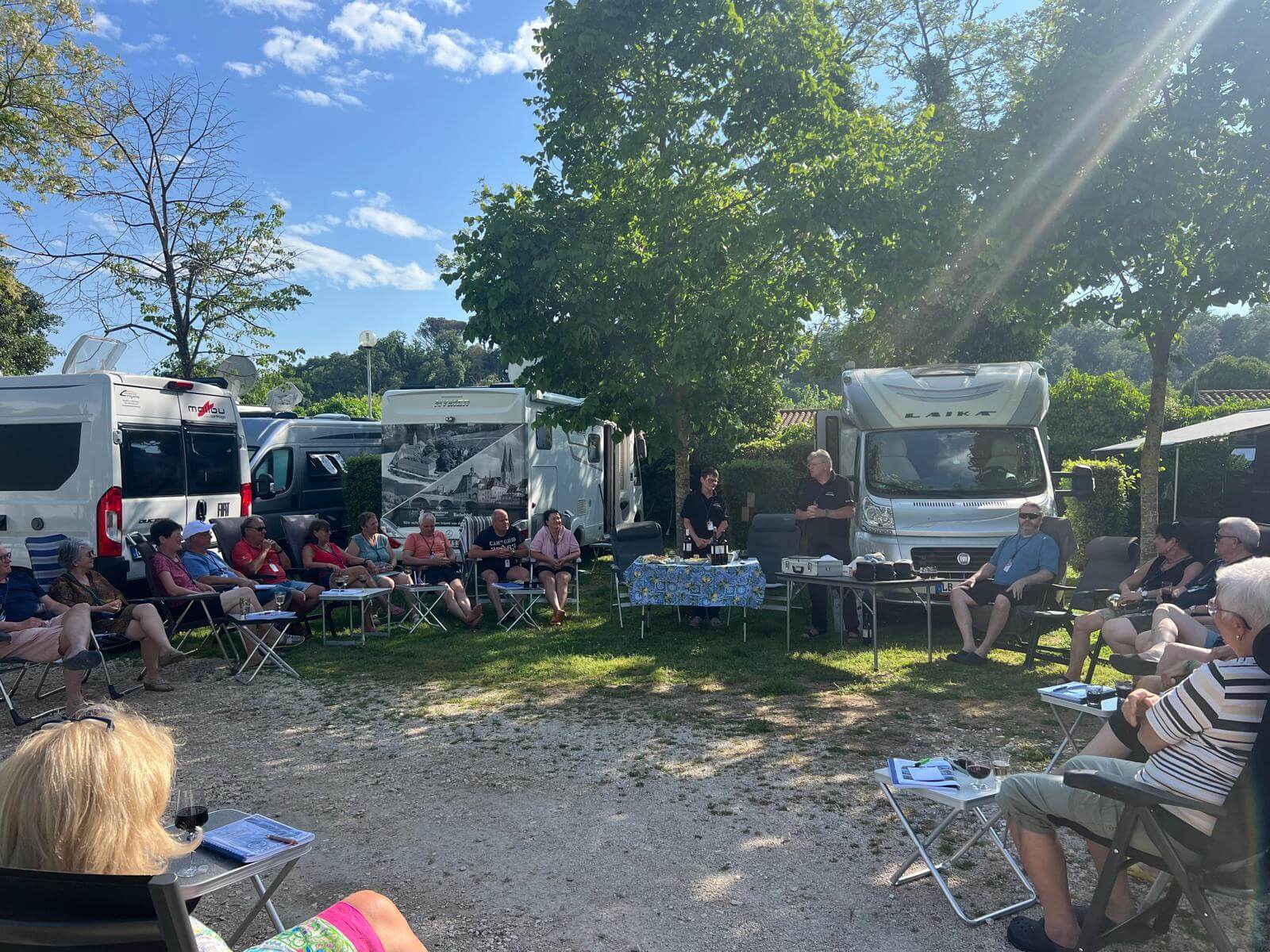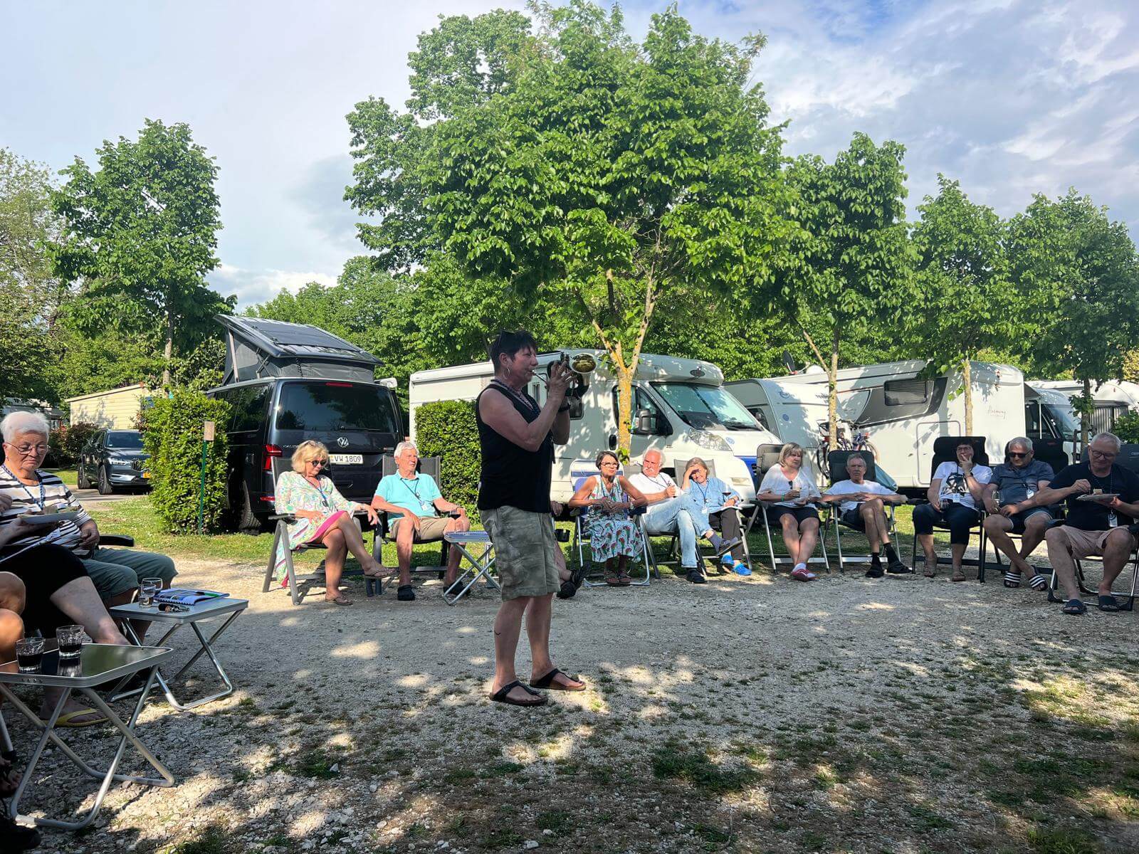 Am frühen Nachmittag sind alle Teilnehmer wohlbehalten auf unserem Campingplatz in Rom eingetroffen. Bis zur Begrüßung haben wir die Sonne in unseren Liegestühlen genossen. Im nahegelegenen Supermarkt wurden noch diverse Dinge eingekauft und schon ging’s los mit der Begrünung durch den Guide. Christine hatte einige kleine Häppchen vorbereitet und dazu gab es Rot- und Weißwein. Die Navis, auf denen die gesamte Reise abgespeichert ist, wurden ausgeteilt und erklärt. Dann die Audioguides verteilt. Damit wurde jeder mit den notwendigen Utensilien für unsere tolle Reise ausgestattet. Claudia blies uns mit ihrem Horn noch ein Eröffnungsständchen. Danach gingen wir zur Gaststätte zum gemeinsamen Abendessen. Herrlich anzusehen war, wie sich die Teilnehmer schon sehr angeregt miteinander unterhalten haben. Alle freuen sich auf unsere gemeinsamen Tage.