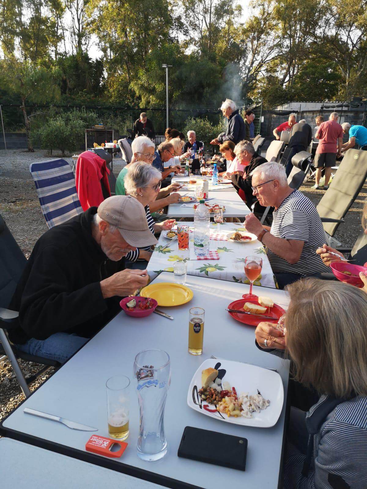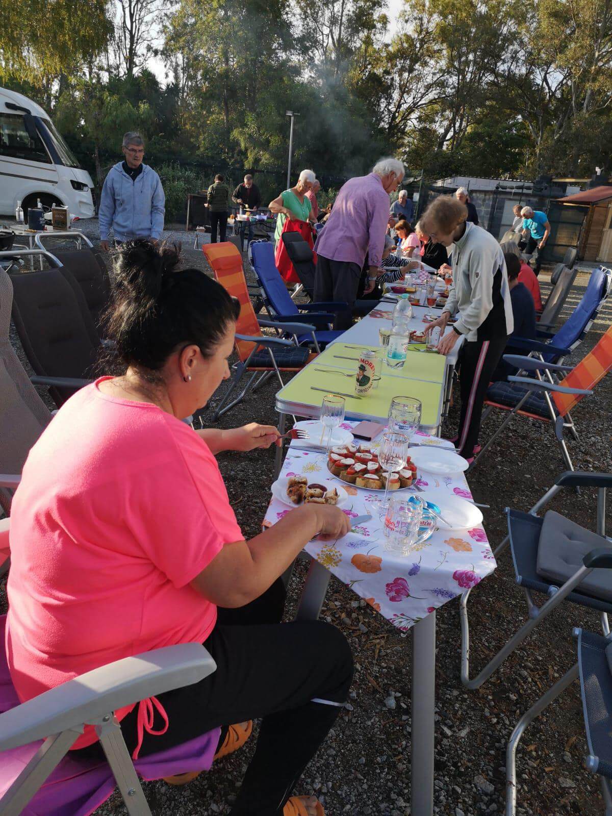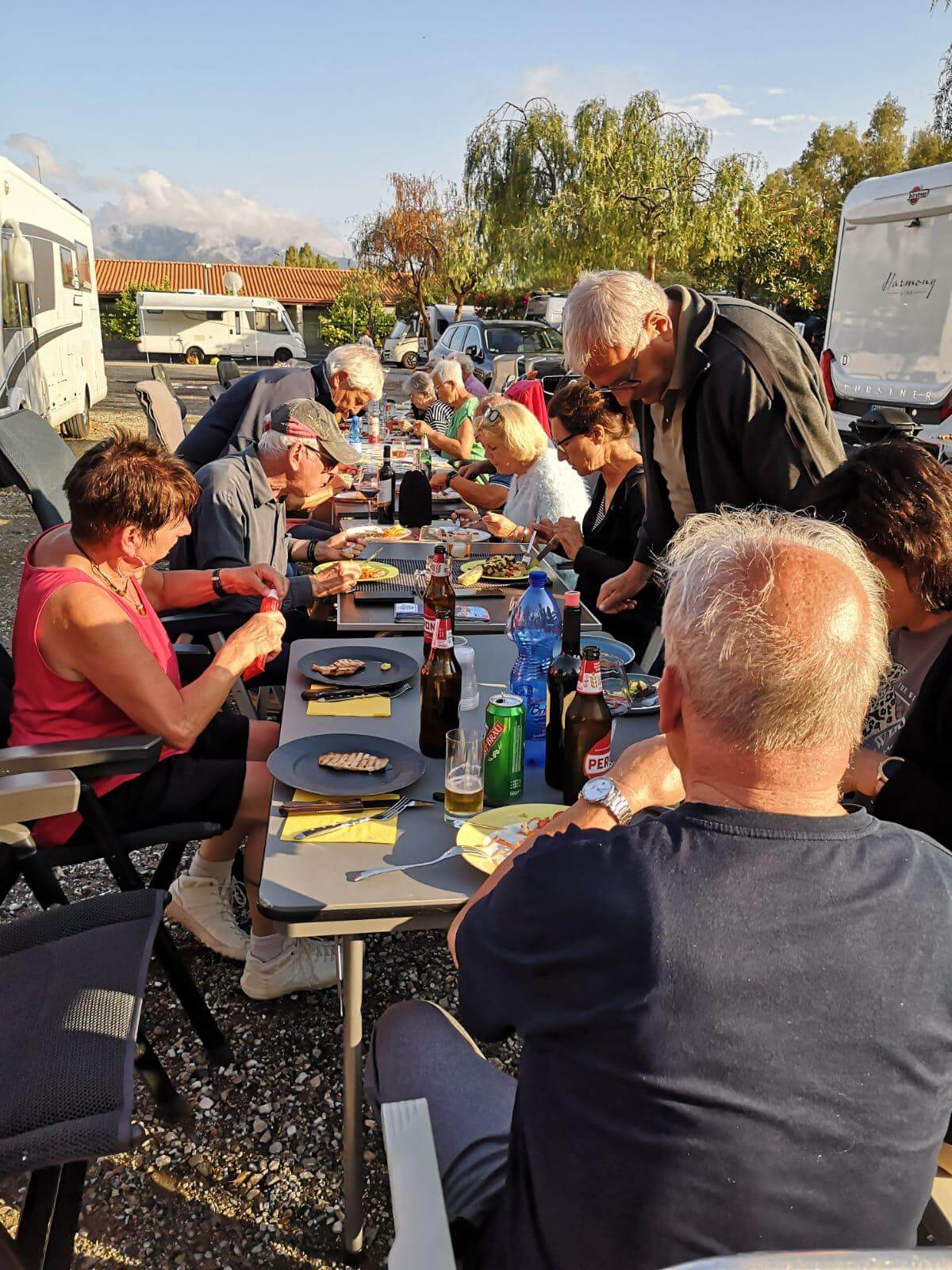 Am Vormittag haben einige ihr Auto wieder in Ordnung gebracht, insbesondere die Frontscheibe gereinigt. Einige genossen das Bad im angrenzenden Meer oder sind Rad gefahren nach Tinderi zum Kloster der schwarzen Madonna. Am Nachmittag gingen dann schon die Vorbereitungen zu unserer ersten Campertafel los. Nervös waren wir Alle, ob diese überhaupt stattfinden kann, denn den ganzen Nachmittag hat es viel geregnet. Doch pünktlich um 17:00 Uhr kam die Sonne wieder hervor und trocknete alles. Sodann wurde aufgetischt, dass sich die Tische gebogen haben. Die Griller standen bereit, um die Steaks, Involtinis zu grillen und selbst an köstliche Nachspeise wurde gedacht. Letztendlich wurde das umfangreiche Essen mit verschiedenen Schnäpsen, Wein und Bier beendet.