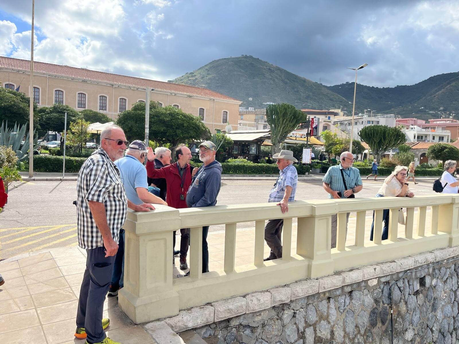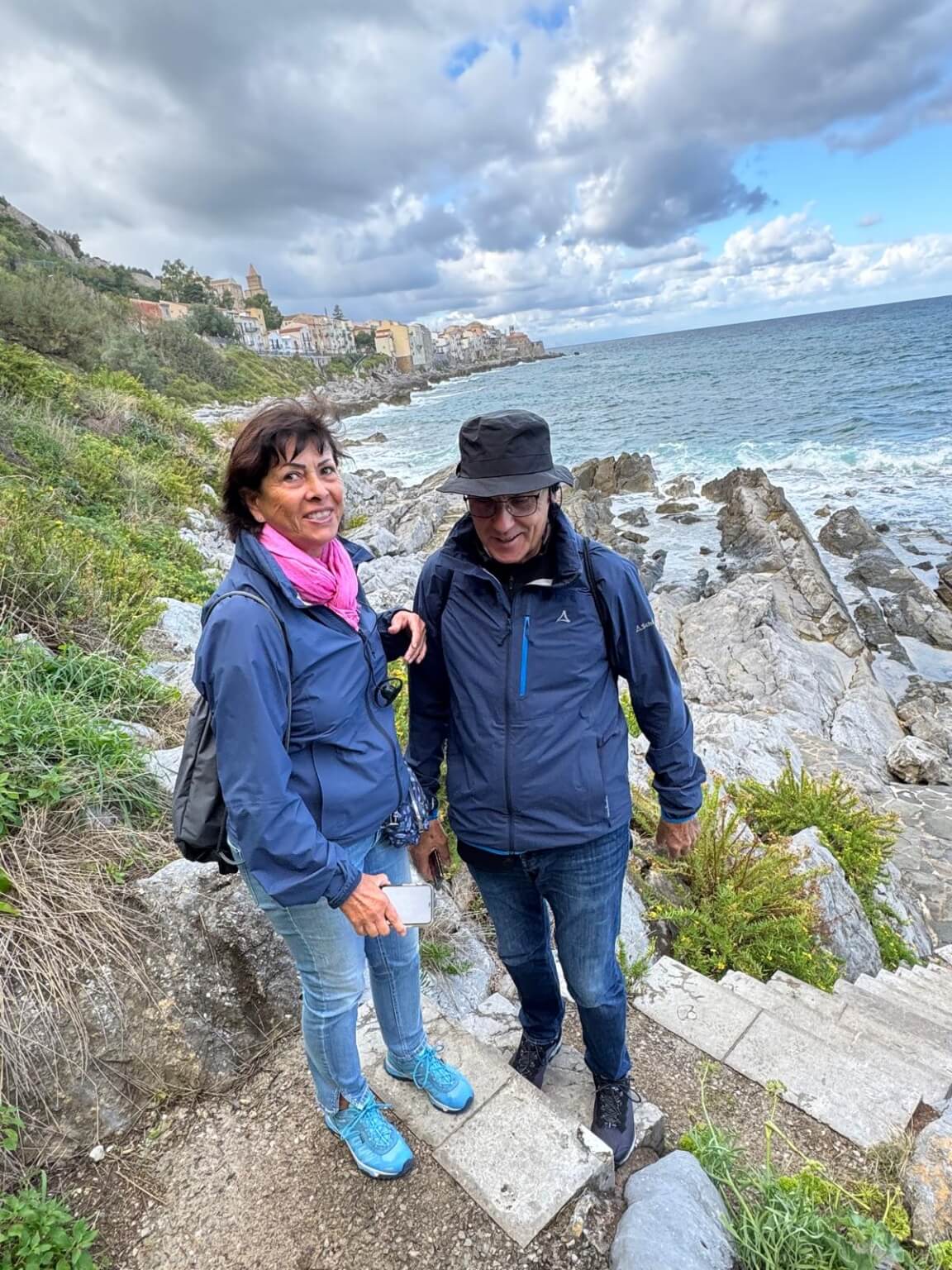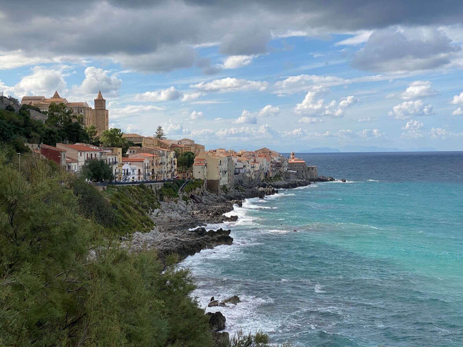 Der Bus brachte uns heute zum Leuchtturm von Cefalu, wo wir unseren Führer Gino trafen. Die Gruppe teilte sich. Ein Teil ging auf der Straße mit Gino Richtung Kathedrale und der andere Teil nahm mit Reiseleiter Michael den schöneren Weg über die Klippen direkt am Meer entlang. Nach 10 Minuten vereinigten sich beide Gruppen wieder und wir gingen gemeinsam durch die Stadt, vorbei am mittelalterlichen Waschhaus, hinauf auf eine der Bastionen, an den alten Hafen bis zur neuen Stadt und an den Badestrand. Der Rundgang durch die teils engen Gassen endete an der Kathedrale. Innen erinnerte uns vieles an die von Monreale, nur eben eine Nummer kleiner. Gino ging zunächst auf die Entstehungsgeschichte ein und erklärte die verschiedenen Mosaike, Glasfenster und Steinkunstwerke. Eine einstündige Erkundung auf eigene Faust schloss sich an. Um 13 Uhr trafen wir uns dann zum Abschiedsessen im Nna Principi. Es gab Pasta mit einer Scampisoße, und als Hauptgang besonders panierten Schwertfisch mit Salat. Alle genossen den gut dazu passenden Weißwein. Den Abschluss bildeten ein letztes Canolo und ein Espresso, bevor uns der Bus zurück zum Campingplatz brachte. Am späten Nachmittag schlossen sich die letzte Fahrerbesprechung, ein Resümee der Tour von Michael, der Dank der Gruppe an ihn und das Anstoßen mit einem Grappa oder Williams an. Alle Teilnehmer waren sich darüber einig, dass die Tour sehr schön war und sie in den letzten vier Wochen sehr viel sehen und erleben konnten.