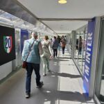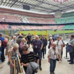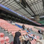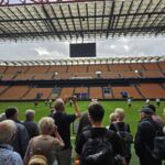 Danach liefen wir ins Stadion ein. Währenddessen erfuhren wir, dass eine Umgestaltung des Stadions in die Vereinsfarben der beiden Clubs (rot-schwarz für AC, blau-schwarz für Inter) jedes Mal drei Tage beansprucht.