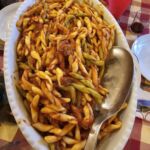 dann Primo Piatti mit dreifarbigen Strozzapreti, mit Hirtenragout, mit Bruchfleisch aus eigener Erzeugung,