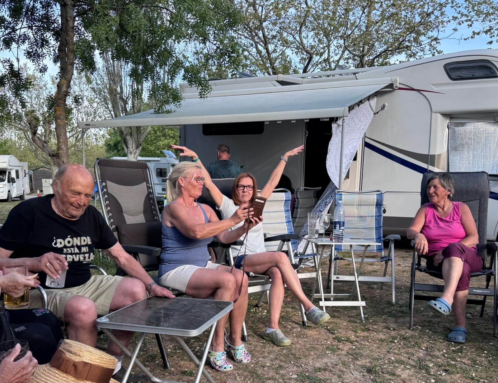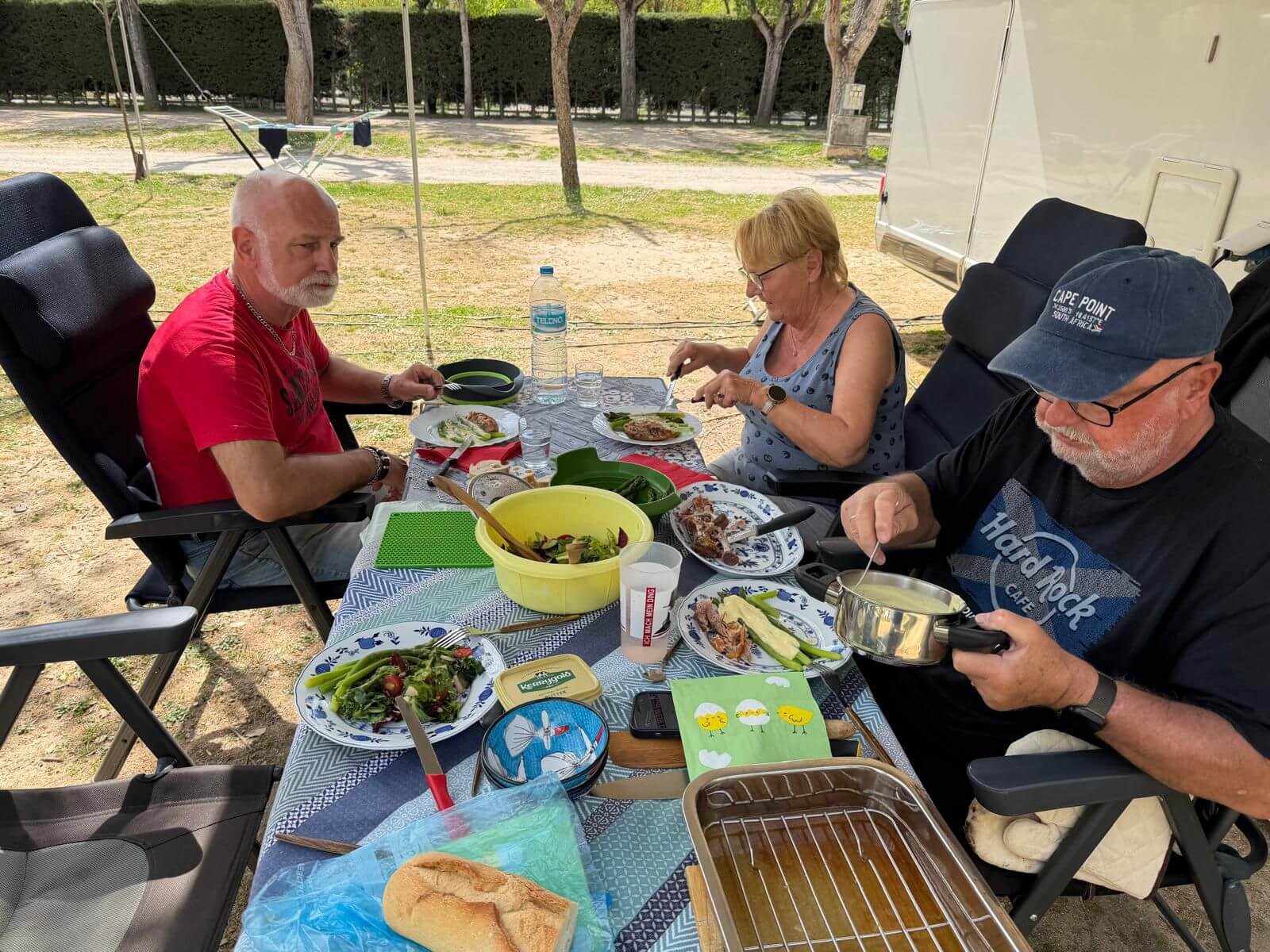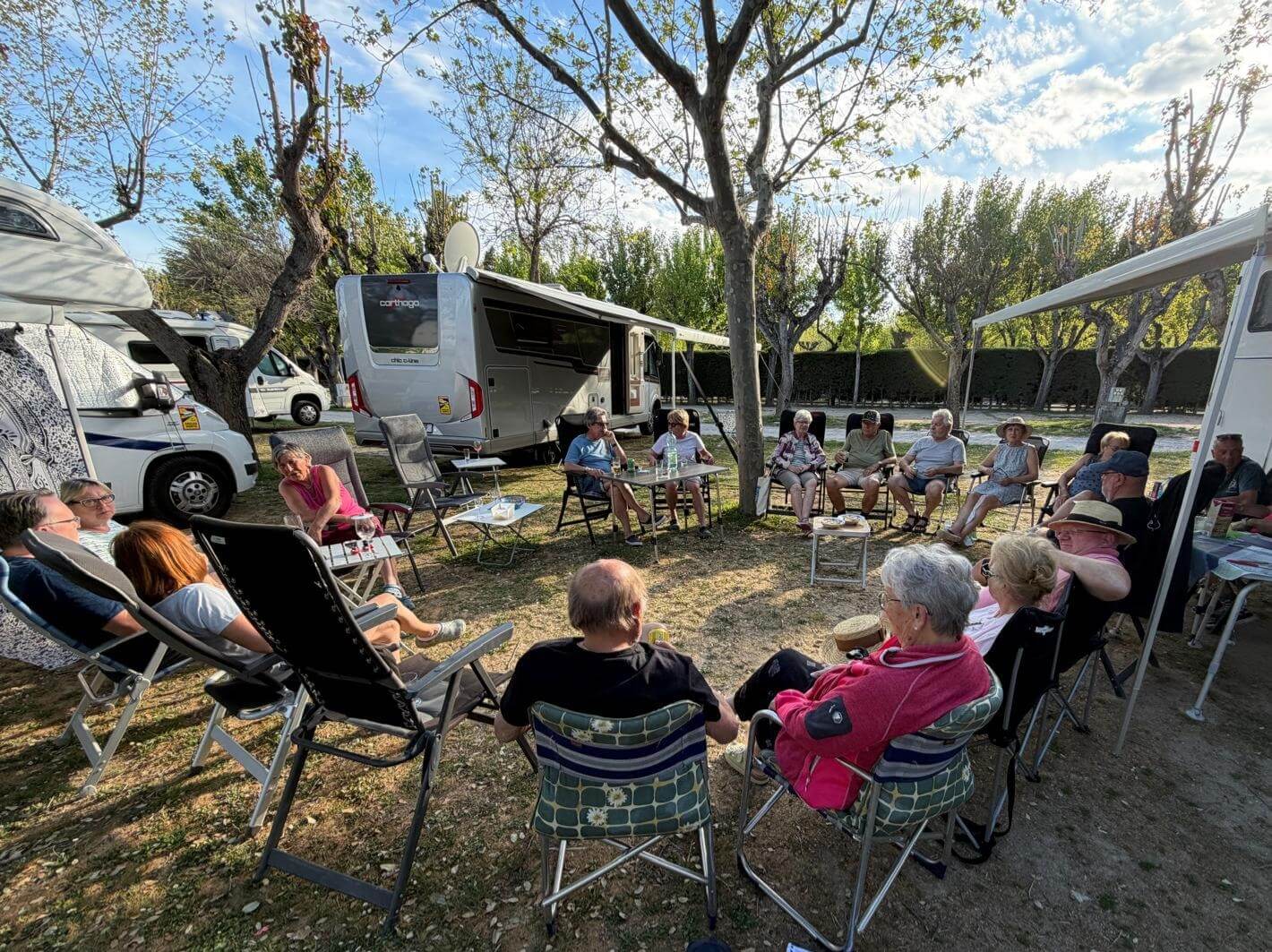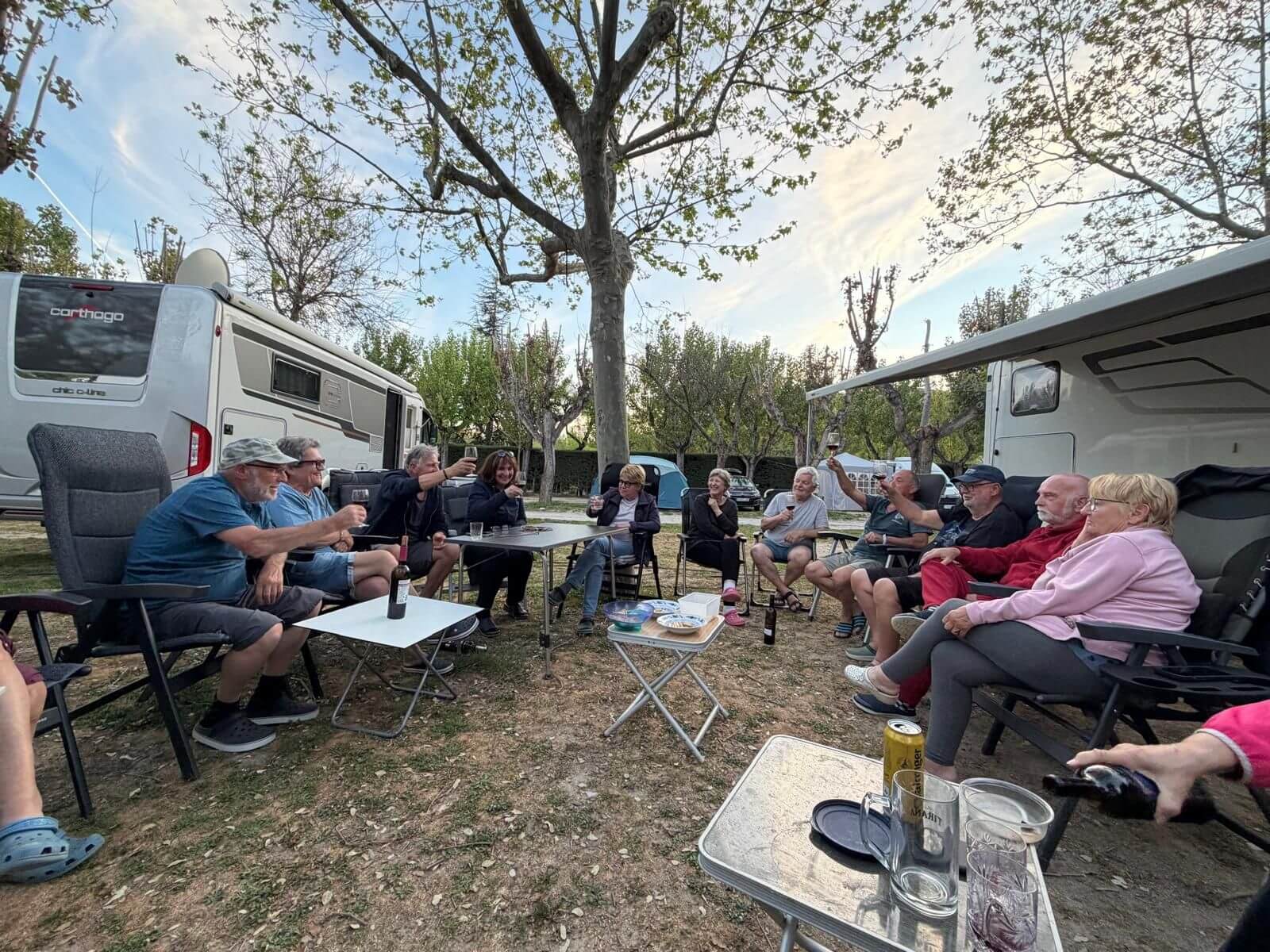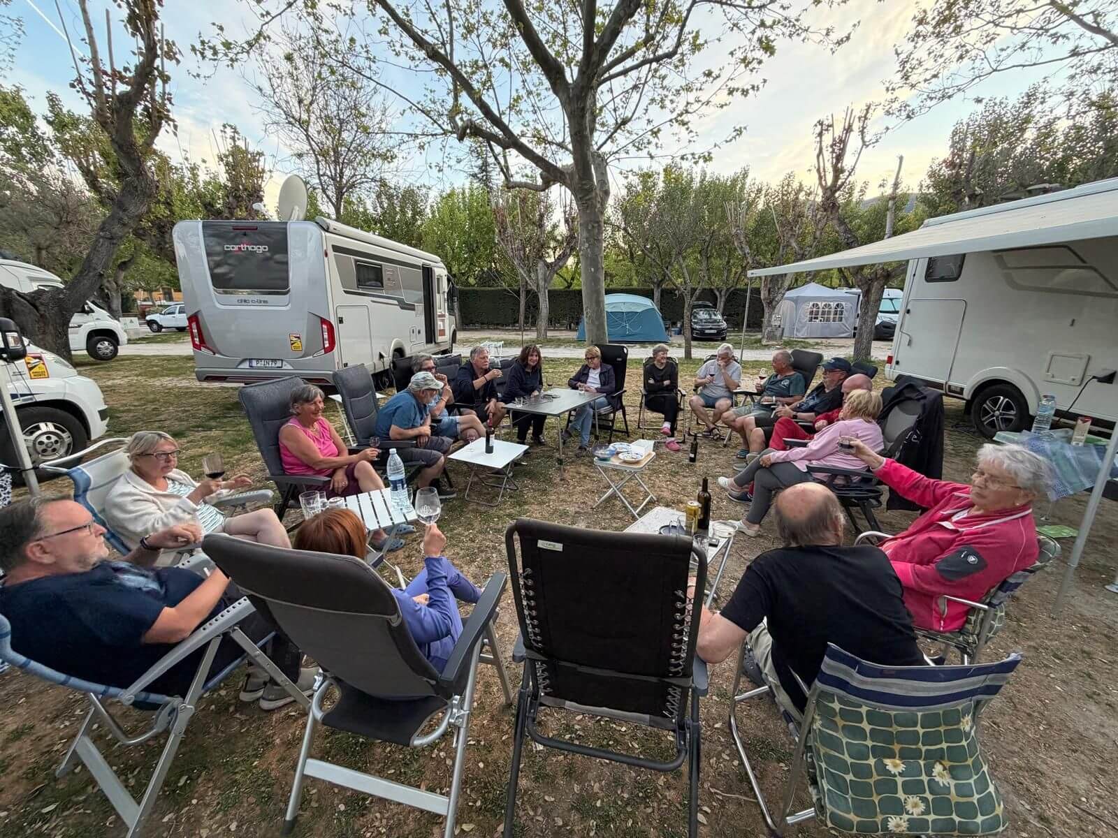 Wir haben wieder einen Tag der Ruhe. Am Morgen kann man solche Tage noch mit Ausschlafen und gemütlichem Frühstücken genießen. Danach zeigt dann häufig die To-Do-Liste an, dass es nun genug der Ruhe ist. Das Wetter zeigt sich von der sonnig-warmen Seite und deshalb gibt es keine Ausrede, die das Wuseln im und am Auto verhindert. Am Nachmittag ist jedoch bei den meisten Relaxen angesagt. Nach unserer Besprechung des nächsten Fahrtages feiern wir mit gemischten Gefühlen die Halbzeit unserer Reise. Leider ist schon die Hälfte der gemeinsamen Reisetage vorüber. Andererseits haben wir aber noch eine ganze Menge interessanter Erlebnisse vor. Bei gutem Wein aus dem Womo-Keller und lustigen Geschichten hält die gute Stimmung uns bis in die Dunkelheit zusammen. Der morgige Tag führt uns zwar nach Madrid, aber mit einer kurzen Tour, die gelassen bewältigt werden kann.