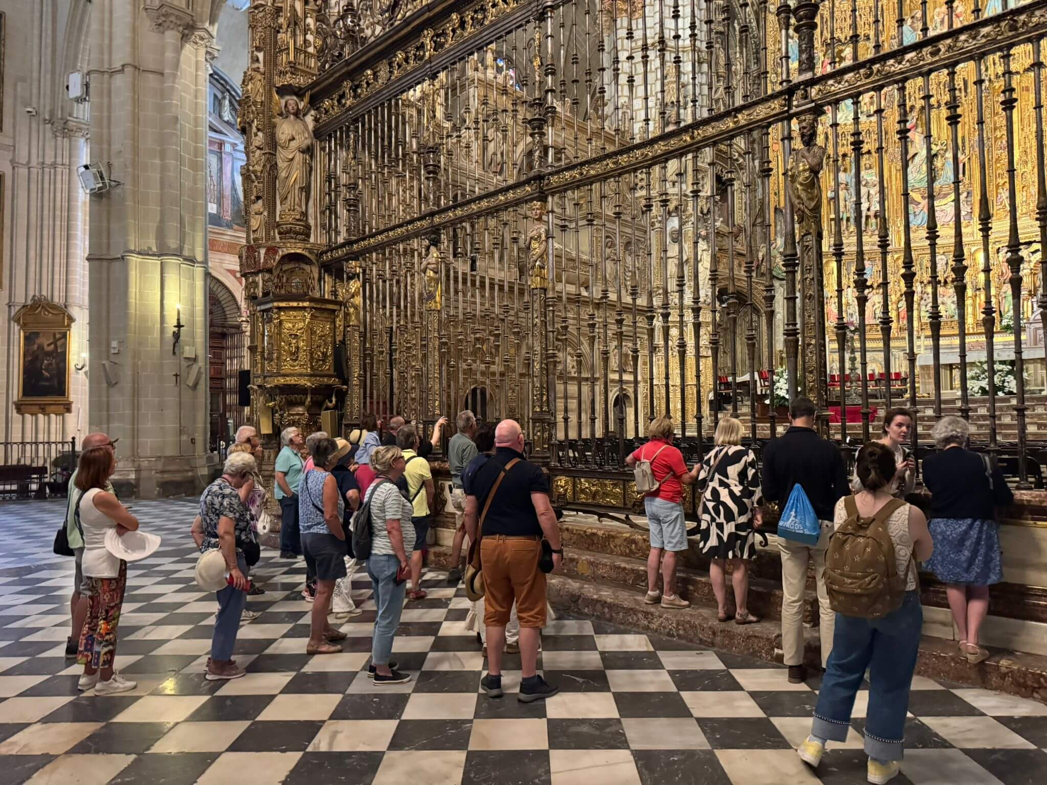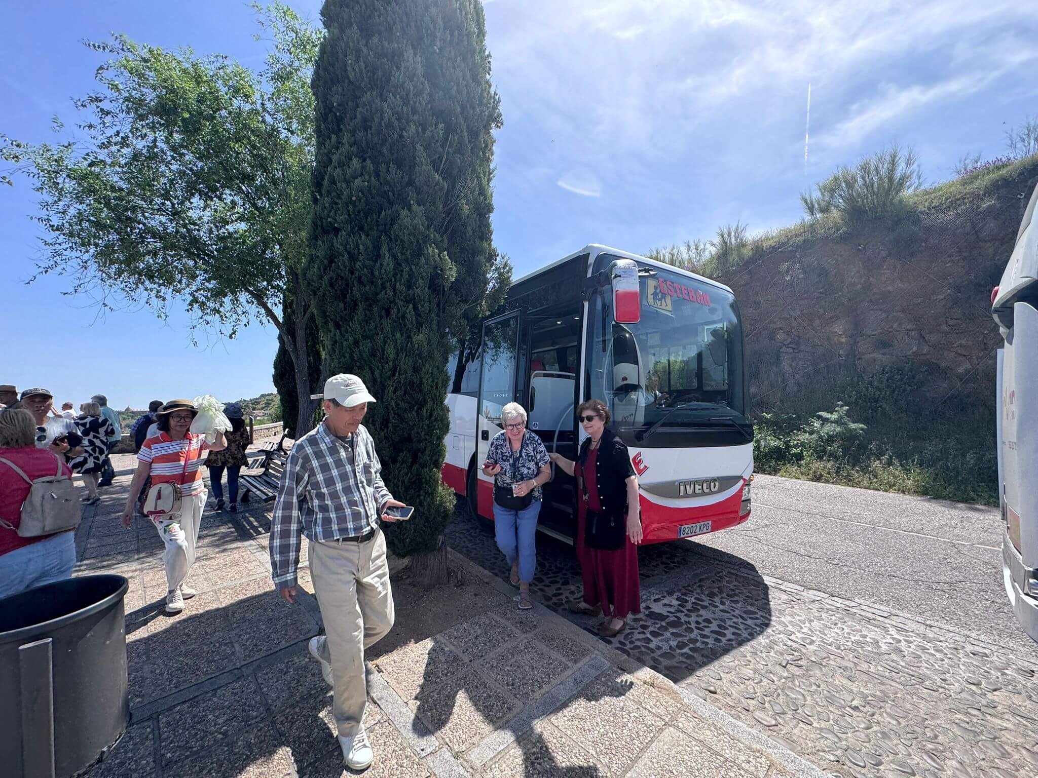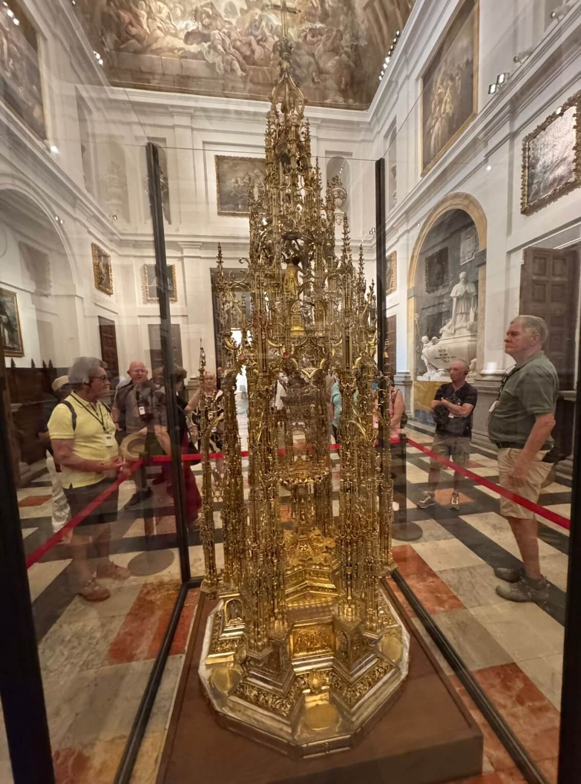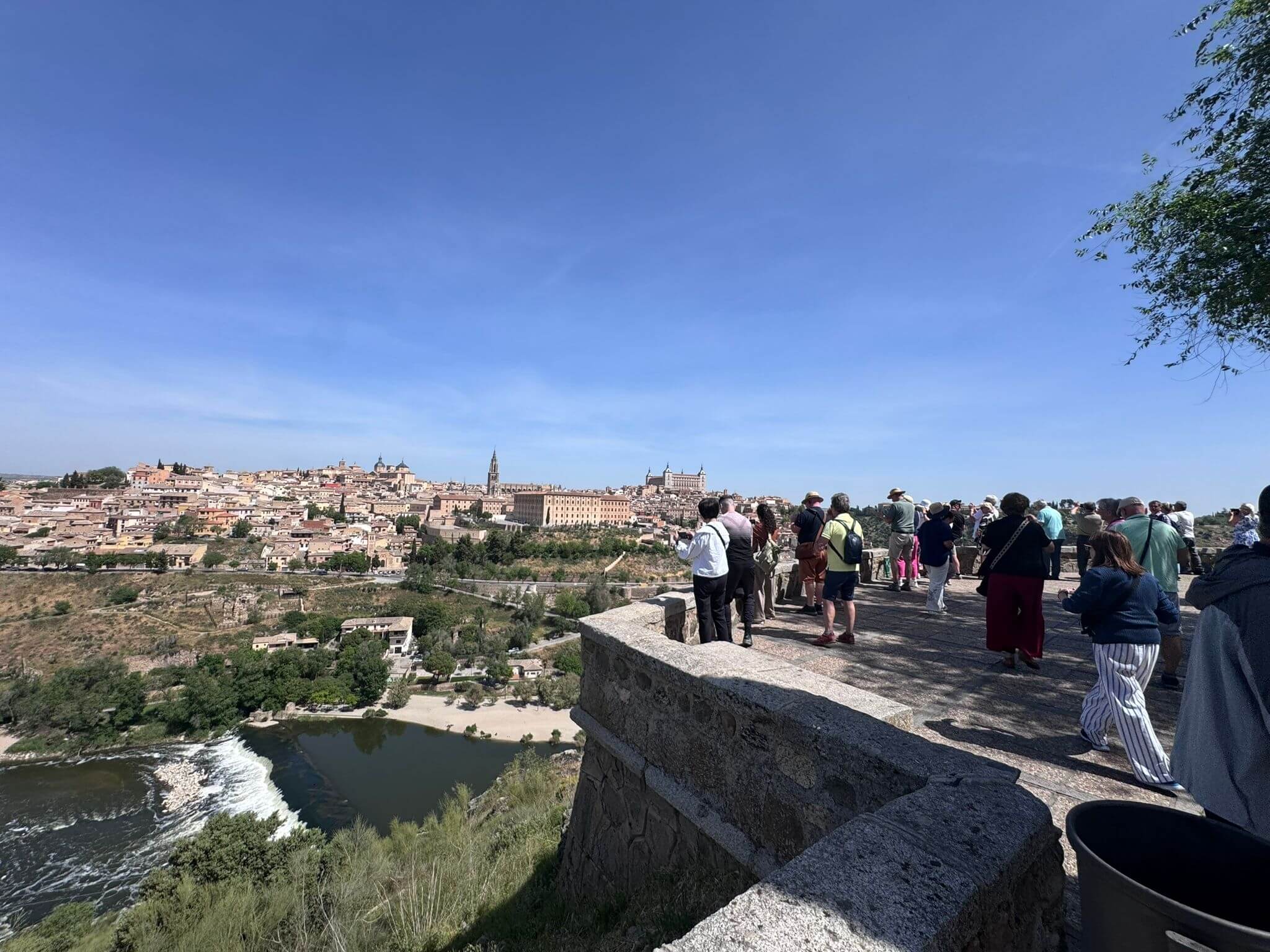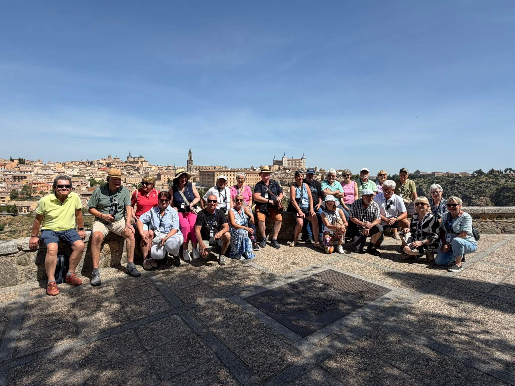 Von Madrid geht es in die autonome Gemeinschaft Kastillien – La Mancha. Unser Ziel ist ihre Hauptstadt Toledo. Die Fahrt nach Süden bringt uns auch in das Land des „sinnreichen Edelmanns Don Quijote von der Mancha“. Wir werden jedoch nicht auf seinen Spuren wandeln. Auch unsere Fortbewegung auf der Autobahn ist nicht zu vergleichen mit einem Ritt auf Rosinante. Der kurze Fahrtag ermöglicht es, kurz nach Mittag zur Stadtbesichtigung von Toledo mit einem Bus und unserem Guide zu starten. Um zu sehen, wie die Stadt sich auf einem Granitfelsen zwischen 400 und annähernd 700 m erhebt , von der Flusswendung „Torno del Taja“ fast umschlossen und der restliche Teil von der teilweise doppelten Stadtmauer geschützt wird, umfahren wir die Stadt. Ein Fotostopp ermöglicht uns einen Blick auf die beeindruckende Ansicht der Altstadt mit dem Alcázar und der Kathedrale. Auch aufgrund der Hinterlassenschaften der verschiedenen Herrscher, von Goten über Mauren bis zu den christlichen Königen, ist Teledo heute UNESCO-Weltkulturerbe. Zu diesem kulturellen Erbe gehört auch die Handwerkskunst der Herstellung von Schwertern und Messern. Wir besichtigen eine Werkstatt für Stahlklingen und für wertvolle Gold- und Silbereinlegearbeiten, in der auch Damaszener-Stahl verarbeitet wird. Auf einer Rolltreppe geht es hinauf in die Altstadt und dort spazieren wir durch enge Gassen vom Plaza de Zocodover mit dem Arco de la Sangre (Blutbogen) zur Kathedrale. Dieses Bauwerk beeindruckt durch seine vielen Baustile, da es von Generationen erstellt wurde. Der 1504 beendete Hauptaltar ist ein Wunderwerk der Schnitzkunst, Vergoldung und Bemalung. Neben diesen kirchlichen Aspekten sind auch die ausgestellten im Besitz der Kathedrale befindlichen Meisterwerke u. a. von El Greco, Goya oder Titzian zu bewundern. Nach diesem Ausflug in vergangene Jahrhunderte verlangt der Körper sein Recht. In der kurzen Freizeit genießen viele die vielfältigen Angebote an Speisen und Getränken in der Altstadt, bevor uns der Bus zurück zum Camp bringt. Dort sorgt der Sonnenschein mit seiner großen Wärme über 25 °C zum Relaxen. Wir haben morgen einen Ruhetag, der abends zum längeren Verweilen vor den Womos einlädt.