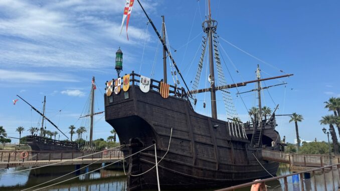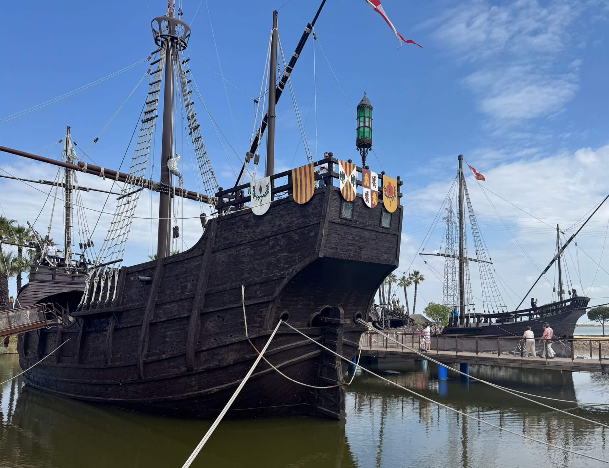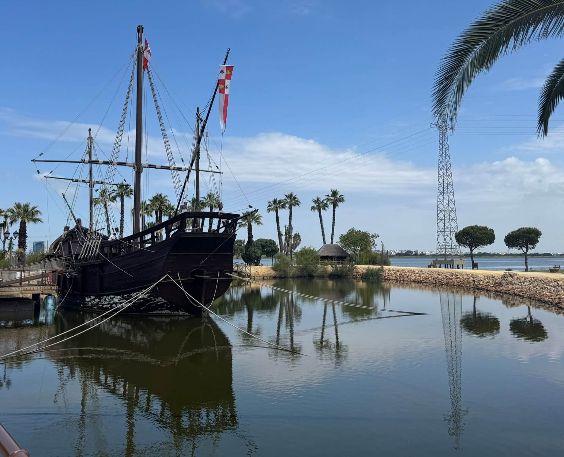 Unser heutiges Ziel ist zwar ein Campingplatz südlich der Hauptstadt der autonomen Region Andalusien. Aber wir fahren zunächst durch den Norden Sevillas hindurch und weiter nach Westen in die Provinz Huelva. Wir sind im Land der Entdecker Amerikas. Da kommt man an Kolumbus und seinen Bemühungen, Unterstützung für seine Idee, Indien auf dem westlichen Seeweg zu erreichen, nicht vorbei. Südlich der Stadt Huelva befindet sich an der Atlantikküste das Kloster La Rabida. Hier verwarf Kolumbus seinen Plan, Frankreich um finanzielle Mittel für seine Pläne zu bitten. Letztlich einigten sich das Königspaar Ferdinand II. und Isabella I. mit Kolumbus und er startete am 3. August 1492 in der Nähe von Huelva zu seiner ersten Entdeckungsreise. Wir können die Nachbauten der drei Schiffe von Christoph Kolumbus – La Santa María, La Pinta und La Niña – im Museumshafen Muelle de las Carabelas besichtigen. Eine mächtige Gedenksäule erinnert daran, dass von hier Seeleute unter Führung von Christoph Kolumbus aufgebrochen sind, um die Neue Welt zu entdecken. Auf dem Rückweg nach Sevilla fahren wir zunächst parallel zur Atlantiküste, um dann wieder ins Landesinnere abzubiegen. Wir passieren El Rocio, einen Wallfahrtsort, in dem die heilige Jungfrau von El Rocio (Blanco Paloma – weiße Taube) verehrt wird. Durch die kaum befestigten Straßen, die hauptsächlich von Pferdefuhrwerken befahren werden, und den Baustil der Gebäude hat man den Eindruck, sich in einer Westernstadt zu befinden. Nachdem im Camp alle ihren Platz gefunden haben, treffen wir uns am Abend zu einer Geburtstagsfeier. Ein Teilnehmer unserer Reisegruppe hat eingeladen und wir erleben gemeinsam einen vergnüglichen Abend, der bis weit in die Nacht mit Lachen gefüllt ist.
