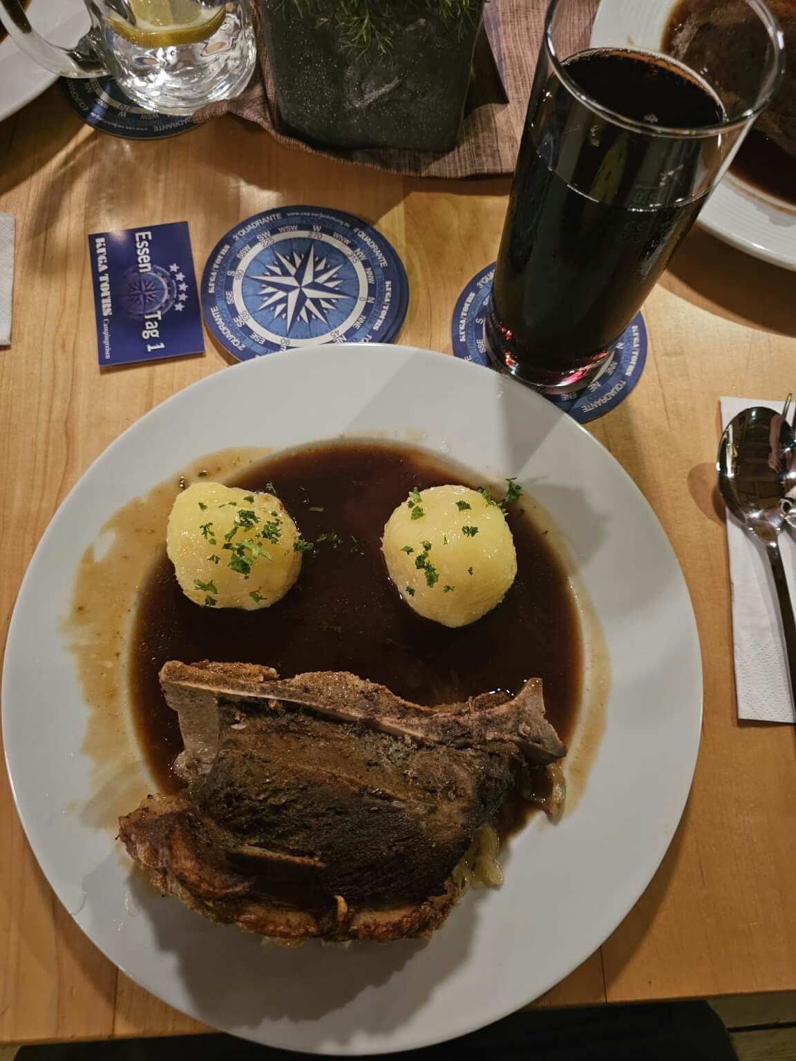 gab es dann das Begrüßungsessen: Leberknödelsuppe, gefolgt von Schäuferle mit richtig krosser Schwarte, fränkischen Klößen und Sauerkraut.