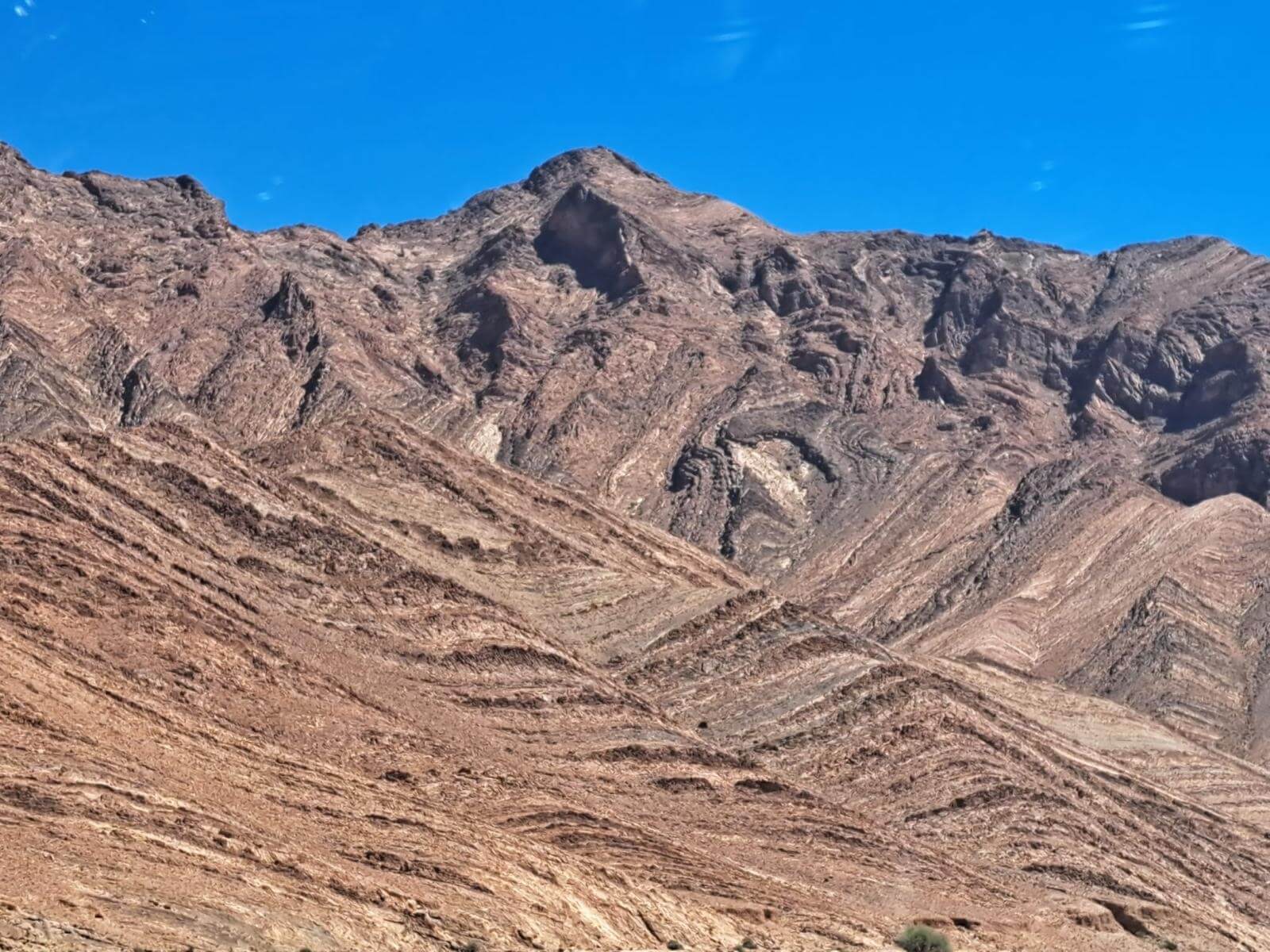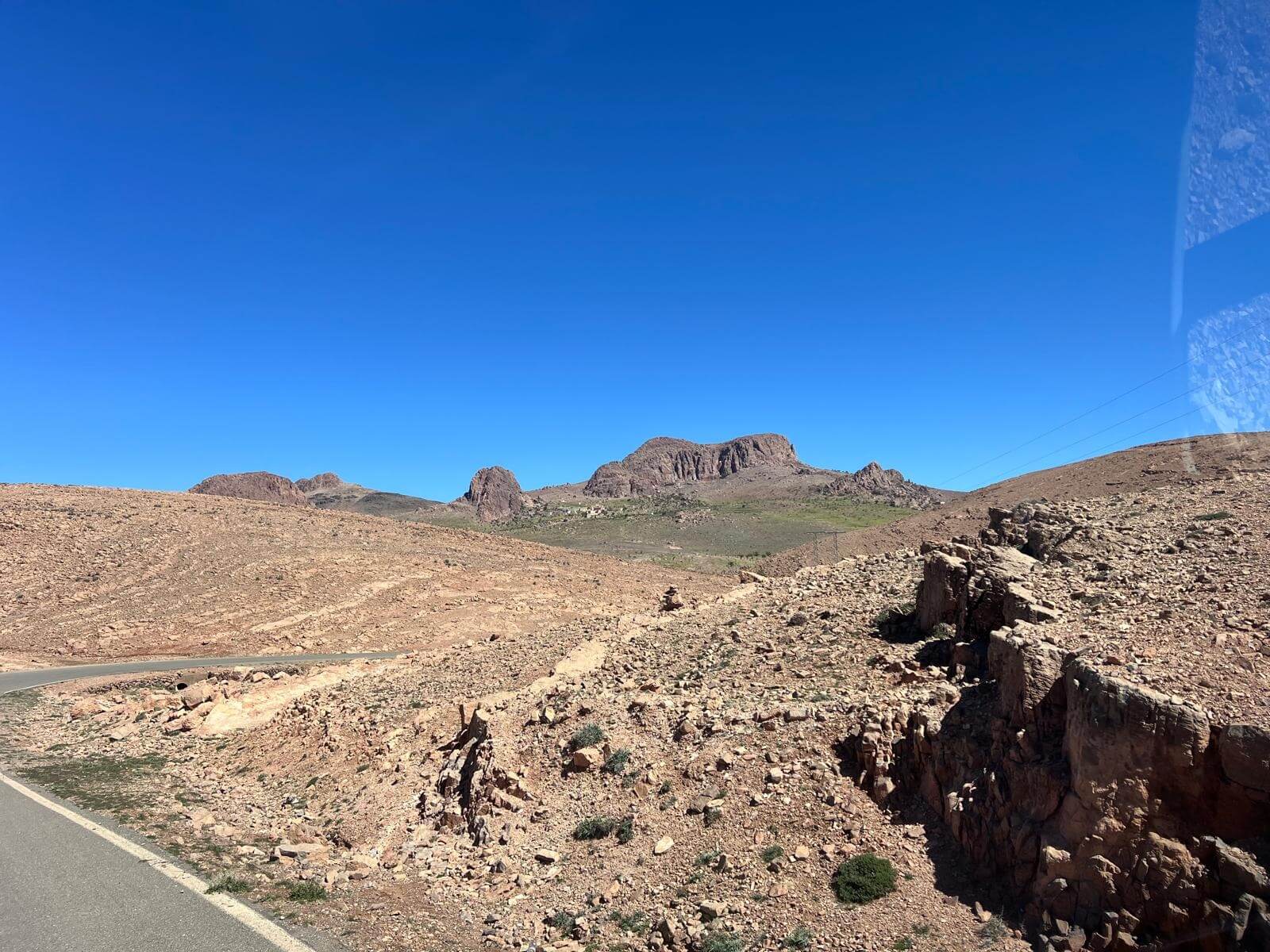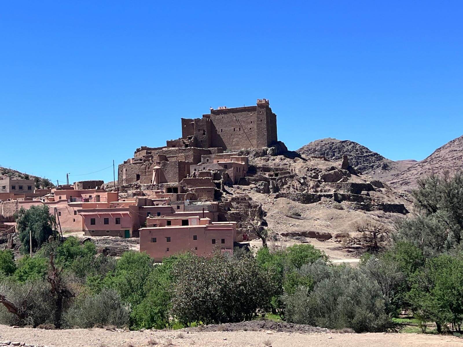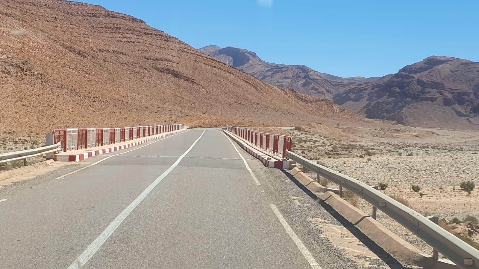 Die Berge zeigen sich unterwegs in den unterschiedlichsten Farbtönen von Ocker, Rot und Braun, die im Sonnenlicht besonders intensiv leuchten. Immer wieder eröffnen sich neue Ausblicke auf bizarre Felsformationen, trockene Flussbetten (Oued) und kleine Oasen mit Palmenhainen, die wie grüne Inseln in der kargen Landschaft wirken.