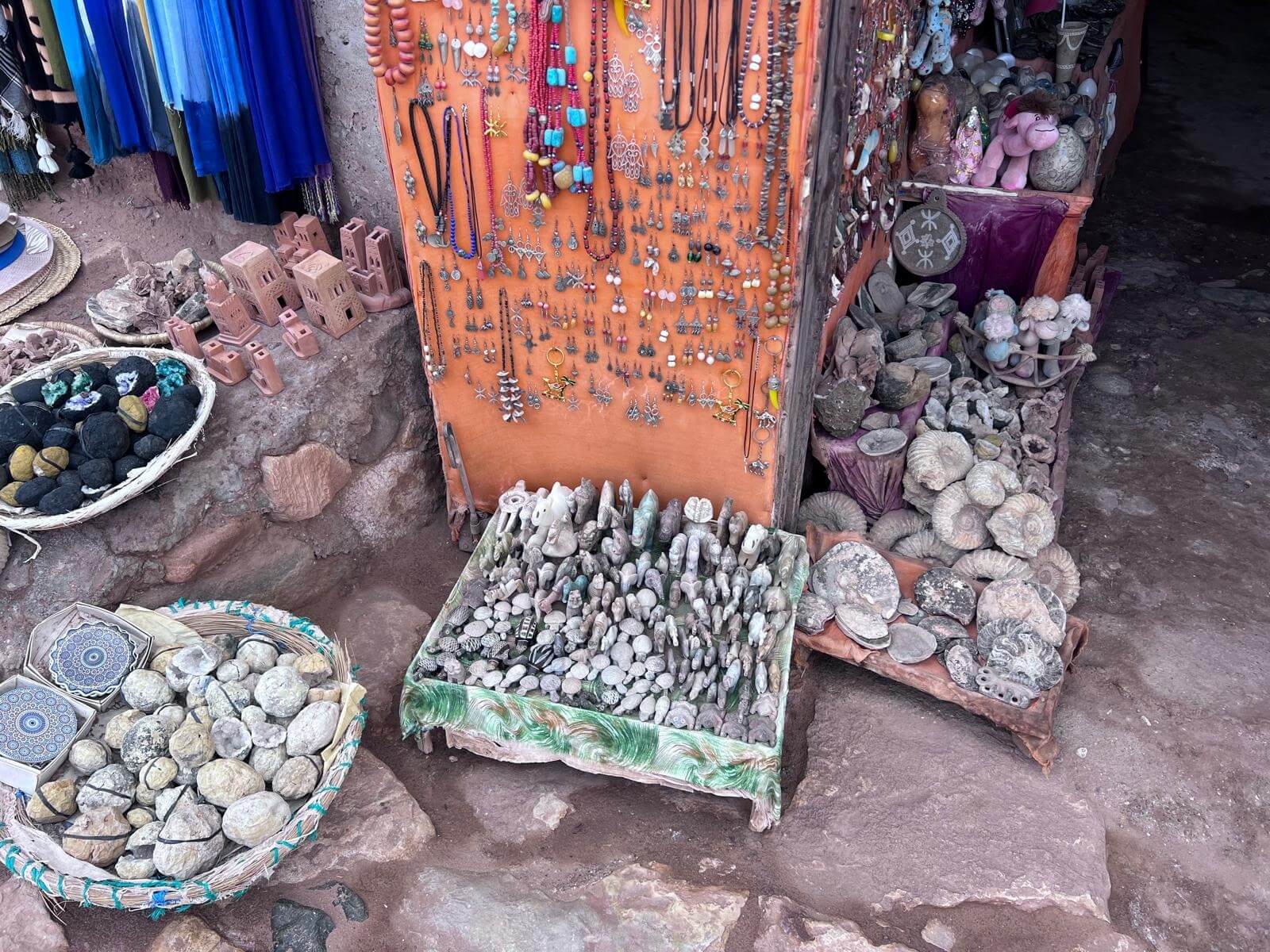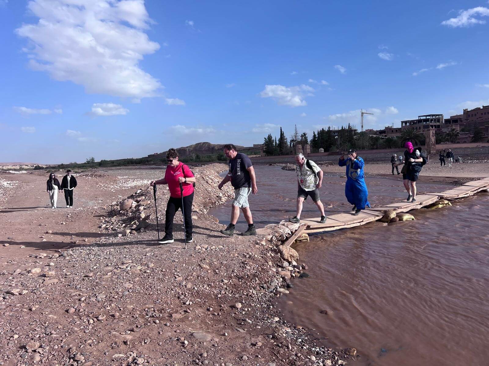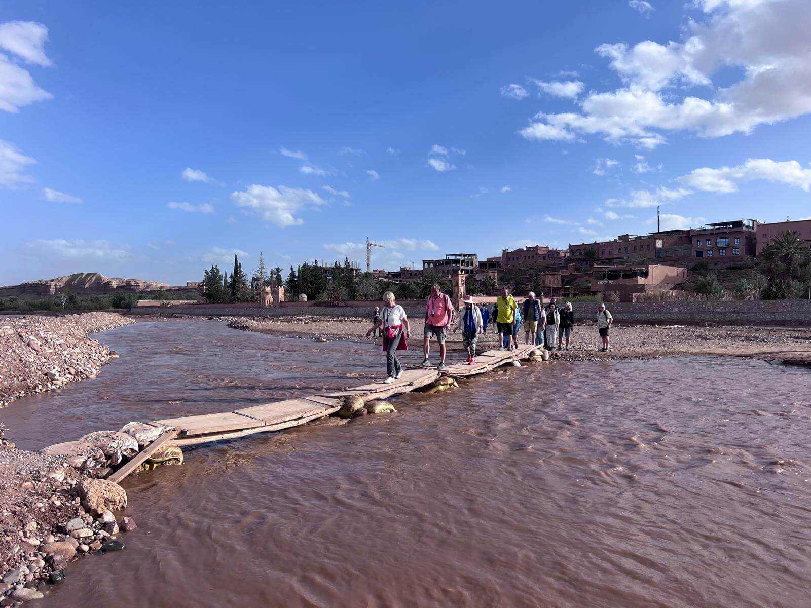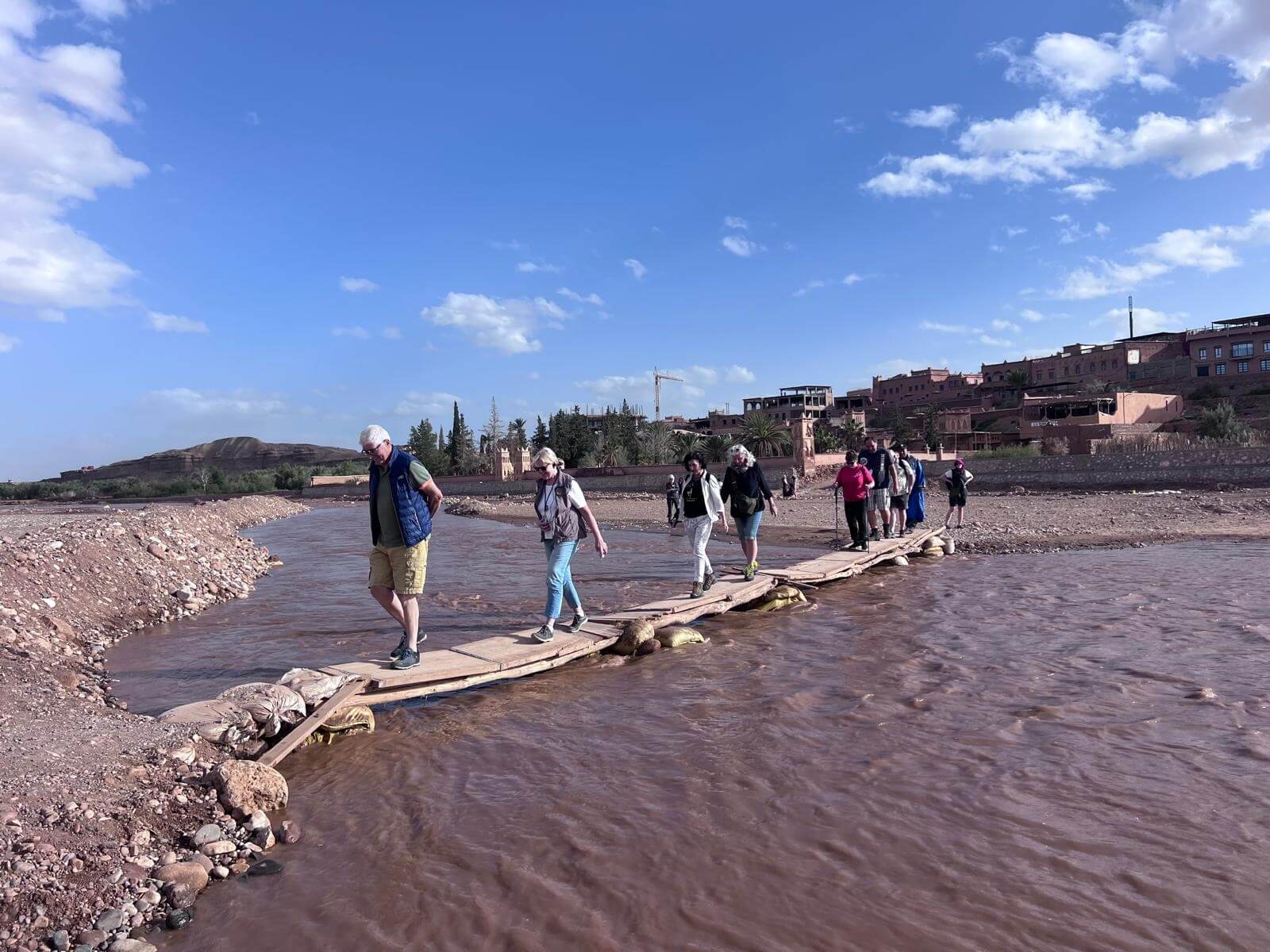 Nachdem wir auf dem Campingplatz angekommen sind, besichtigen wir am Nachmittag gemeinsam Ait-Ben-Haddou. Wir gehen über einen Behelfsweg hinüber in das Ksar und gelangen durch die engen Gassen ins Innere. Auf dem Rückweg nutzen wir die Brücke, von der aus wir noch einmal einen schönen Blick auf das gesamte Dorf haben.