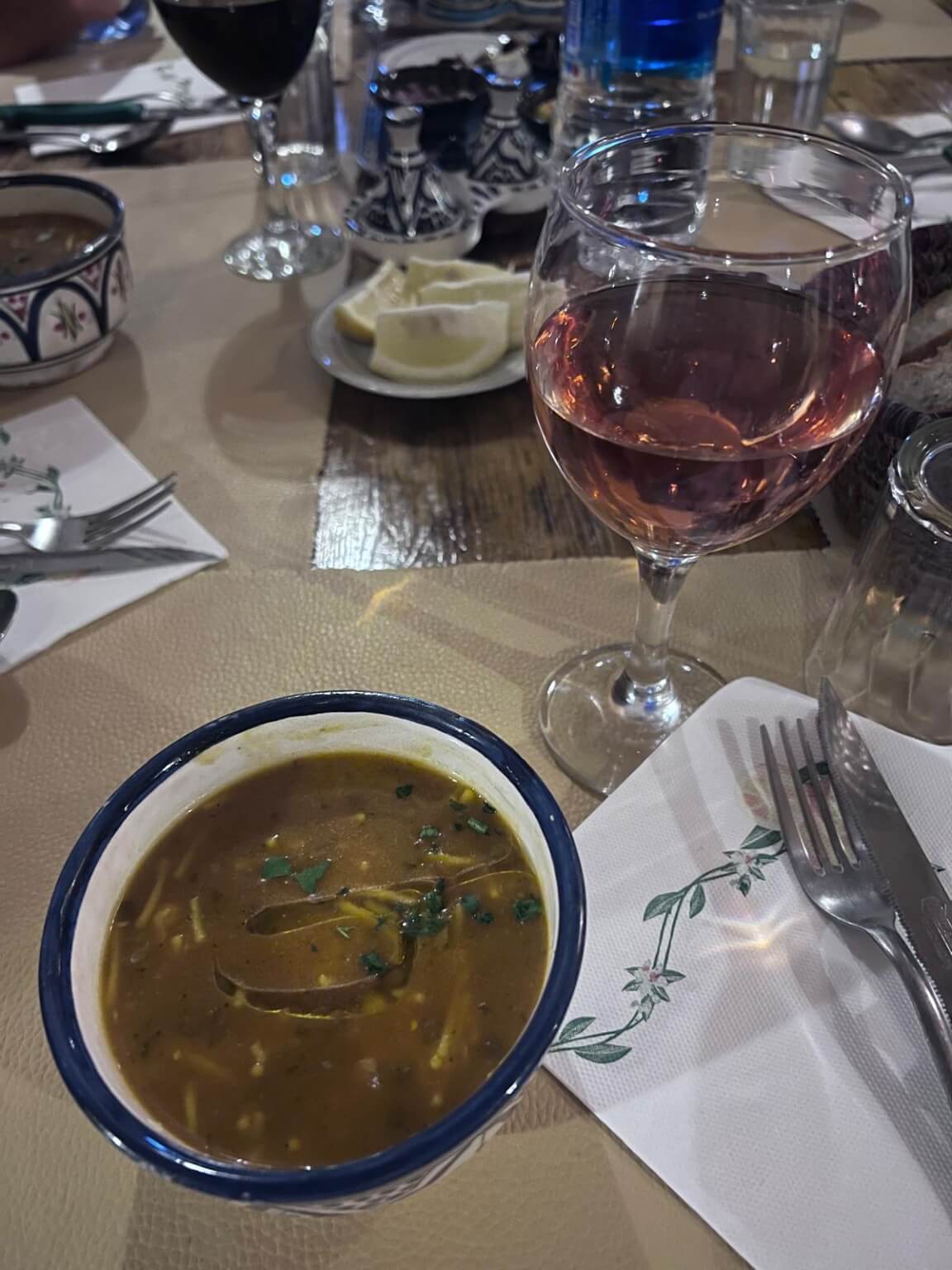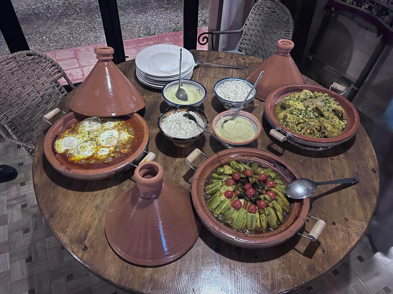 Nach unserer Routenbesprechung geht ein Teil der Gruppe noch gemeinsam essen. Es gibt ein Tajine-Buffet – einfach gut.