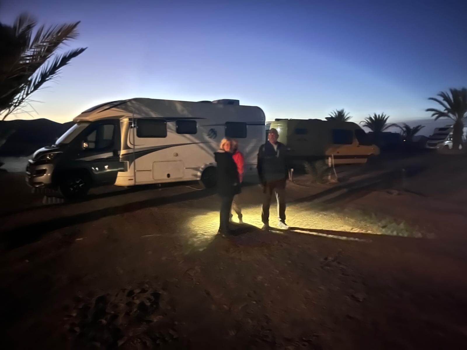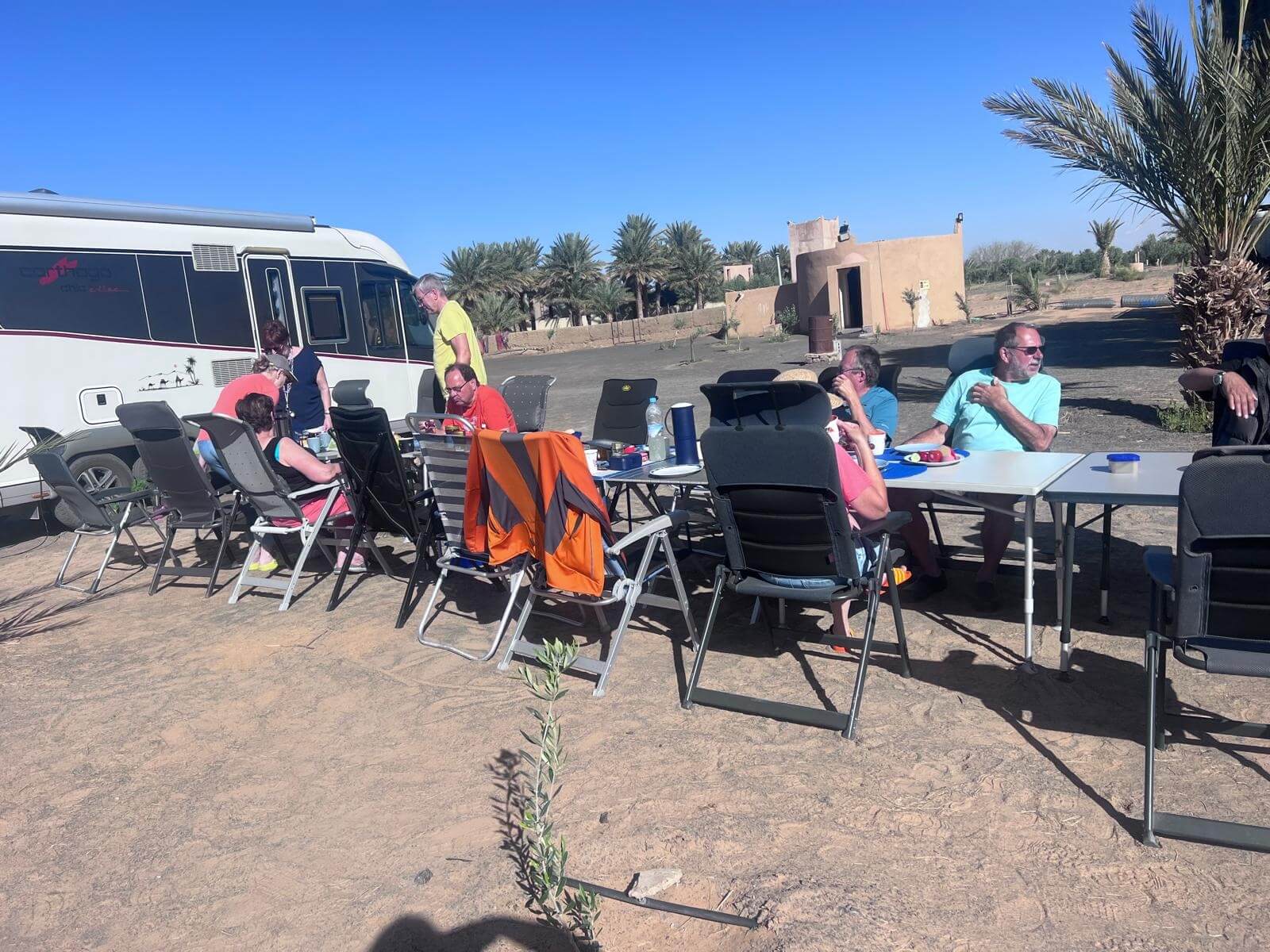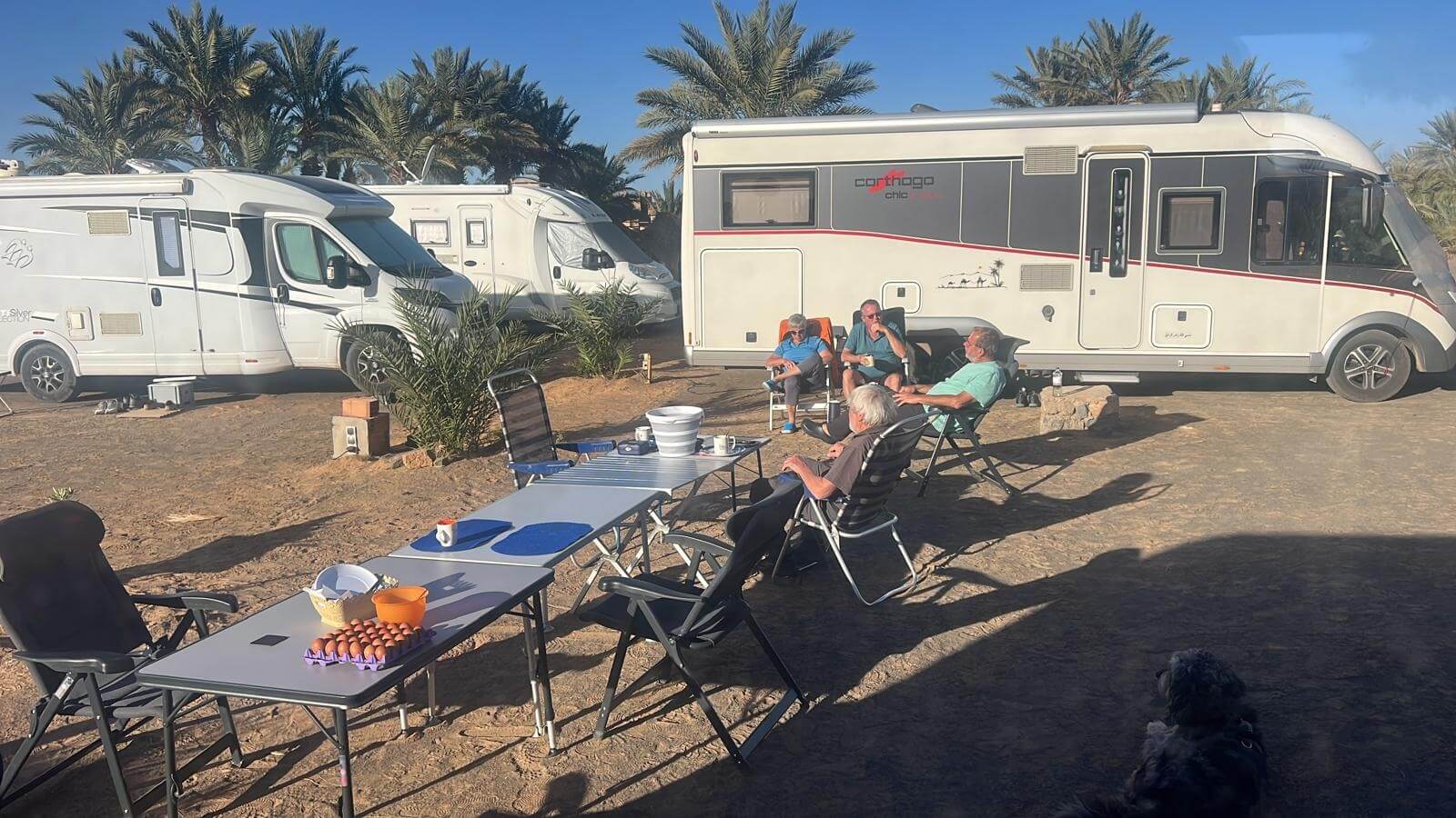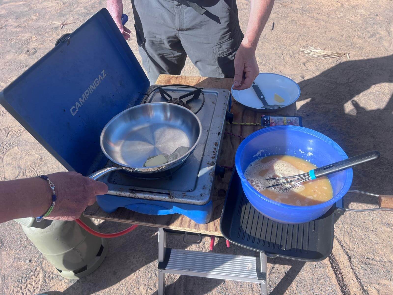 Im Anschluss treffen wir uns zum gemeinsamen Frühstück. Es gibt frisches Rührei, und mit einem Glas Sekt stoßen wir auf diesen besonderen Morgen in der Wüste an.