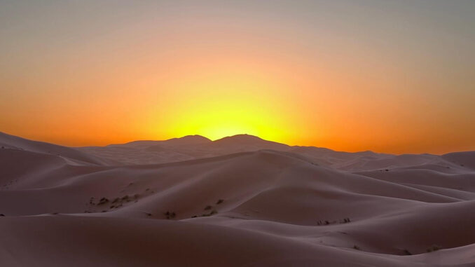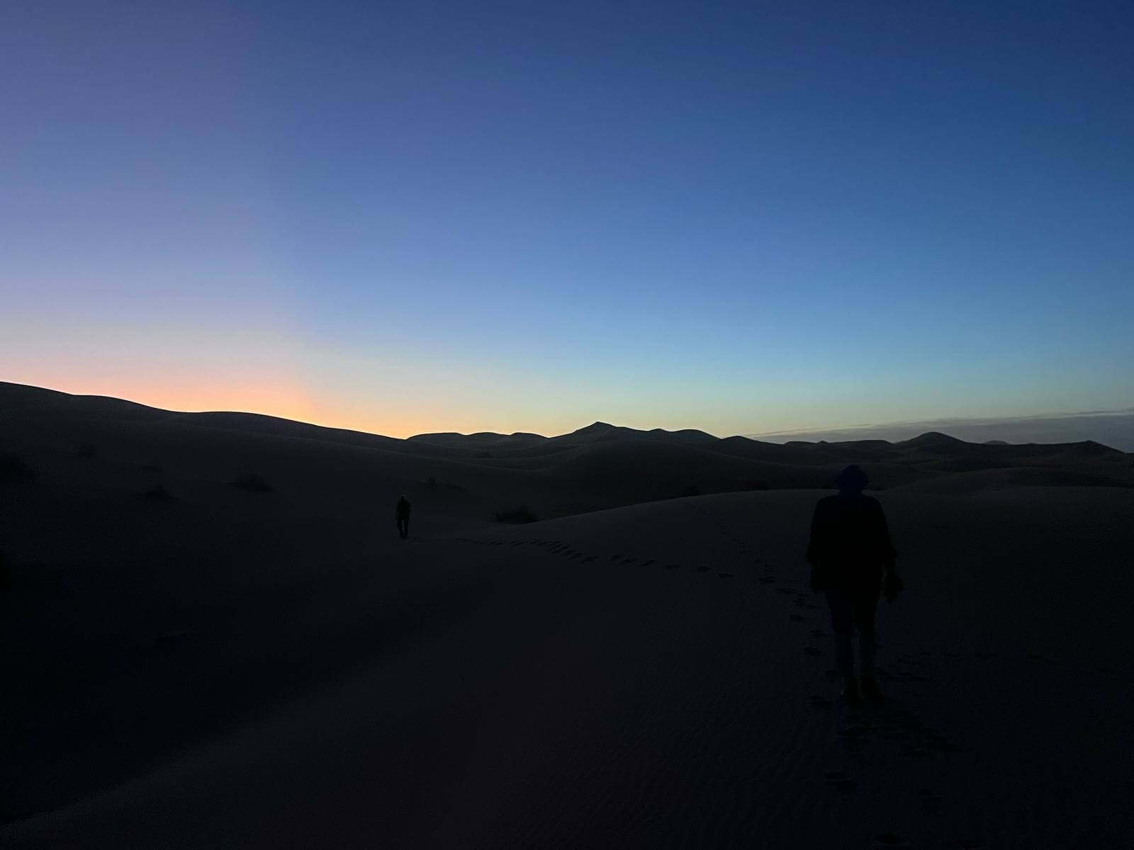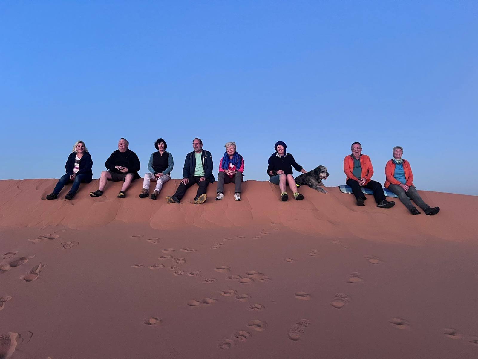 Heute steht ein entspannter Ruhetag in der Wüste auf dem Programm. Direkt an den beeindruckenden Dünen des Erg Chebbi hat jeder die Möglichkeit, den Tag ganz nach seinen eigenen Wünschen zu gestalten – ob aktiv oder einfach nur zum Genießen der besonderen Umgebung. Einige von uns starten bereits früh in den Tag: Noch vor Sonnenaufgang geht es hinauf auf eine der großen Dünen. Oben angekommen erleben wir, wie die Sonne langsam aufgeht und die Landschaft in warme Farben taucht – begleitet von einem leichten Wind, der den Sand über die Dünen wehen lässt.