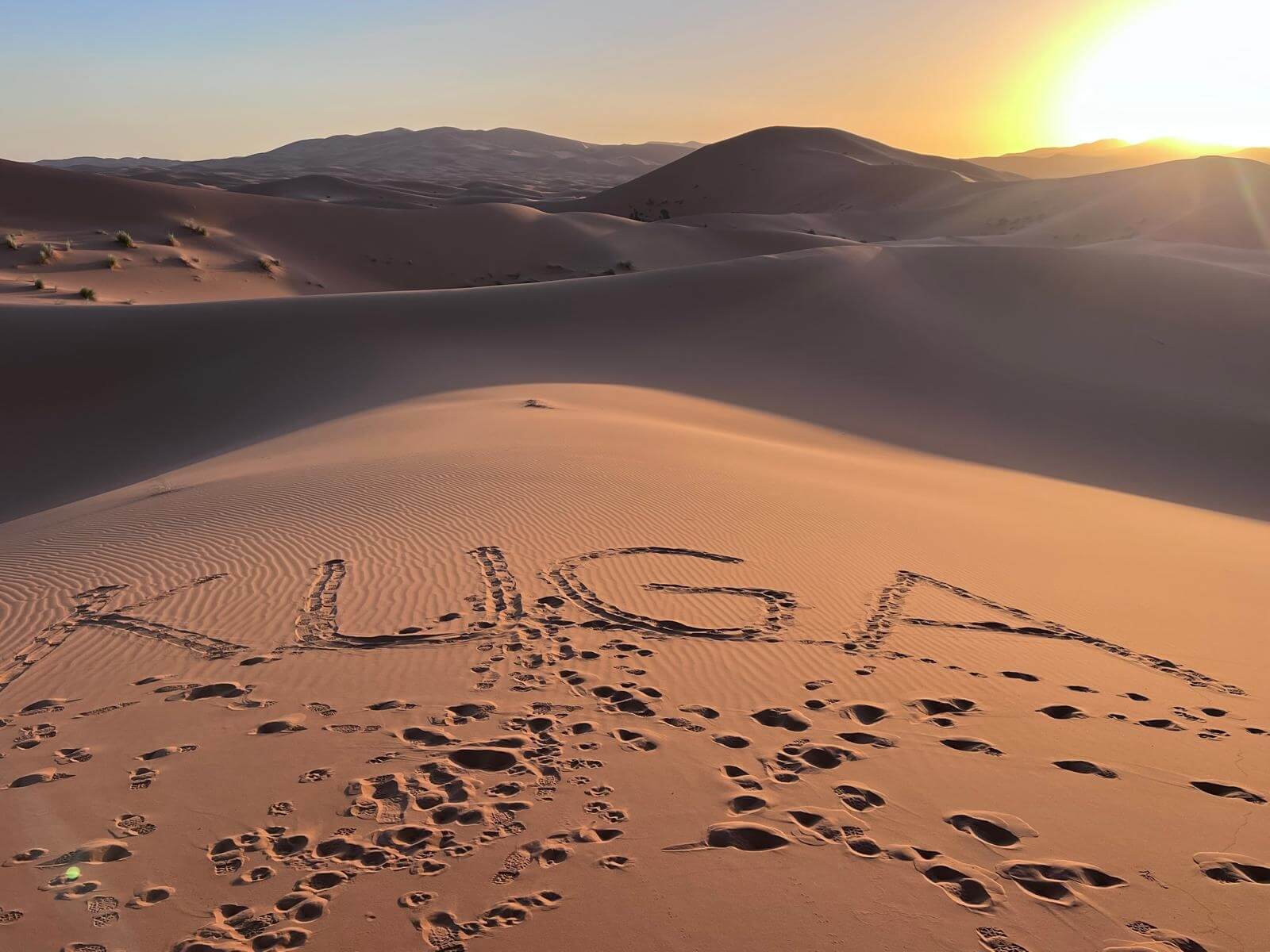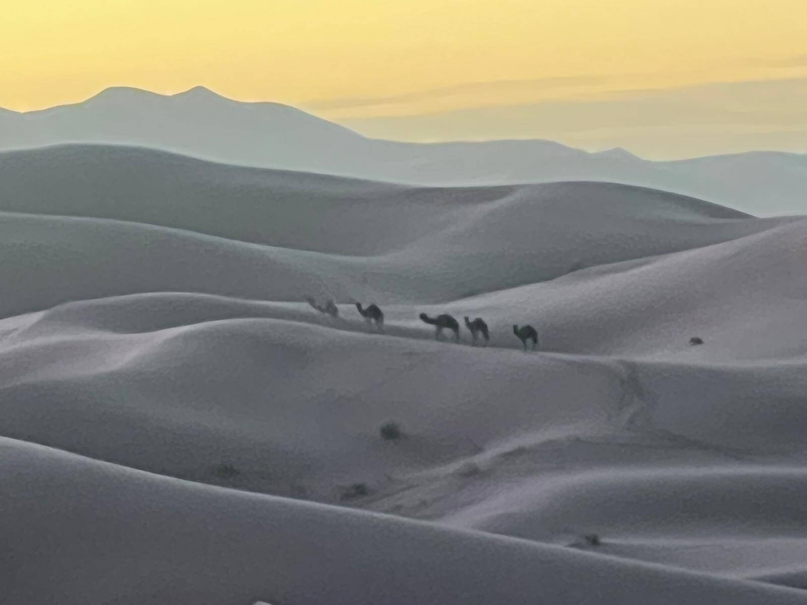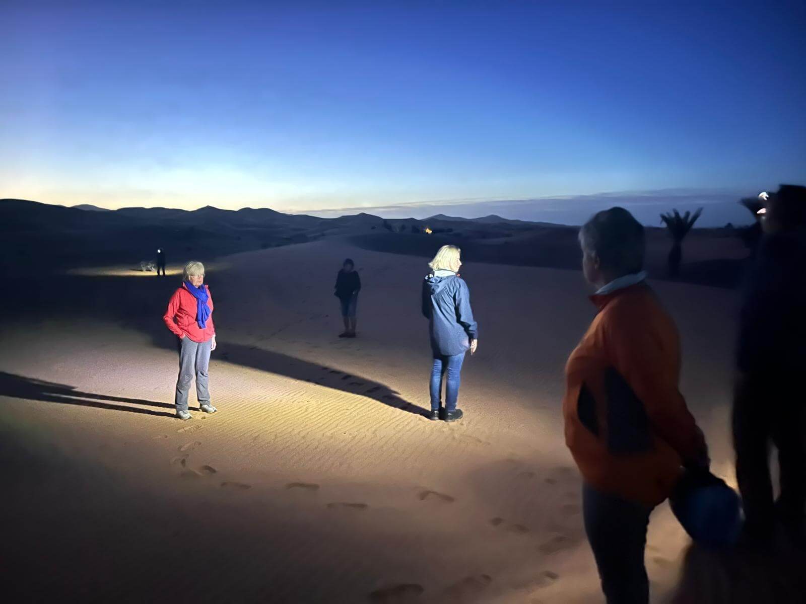 Heute steht ein entspannter Ruhetag in der Wüste auf dem Programm. Direkt an den beeindruckenden Dünen des Erg Chebbi hat jeder die Möglichkeit, den Tag ganz nach seinen eigenen Wünschen zu gestalten – ob aktiv oder einfach nur zum Genießen der besonderen Umgebung. Einige von uns starten bereits früh in den Tag: Noch vor Sonnenaufgang geht es hinauf auf eine der großen Dünen. Oben angekommen erleben wir, wie die Sonne langsam aufgeht und die Landschaft in warme Farben taucht – begleitet von einem leichten Wind, der den Sand über die Dünen wehen lässt.