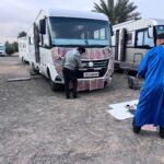 Auch heute beginnt unser Ruhetag etwas anders als gewohnt. Mit dem Ende des Ramadan wird in Marokko die Uhrzeit wieder umgestellt – eine Stunde zurück. Während des Fastenmonats gilt eine angepasste Zeit, damit sich der Tagesrhythmus besser an die Essenszeiten nach Sonnenuntergang anpasst. Nach dem Ramadan kehrt man wieder zur gewohnten Zeit zurück. Am Morgen kommen zunächst die Lackierer zu uns auf den Platz und führen bei einigen Fahrzeugen noch kleine Schönheitsreparaturen durch.