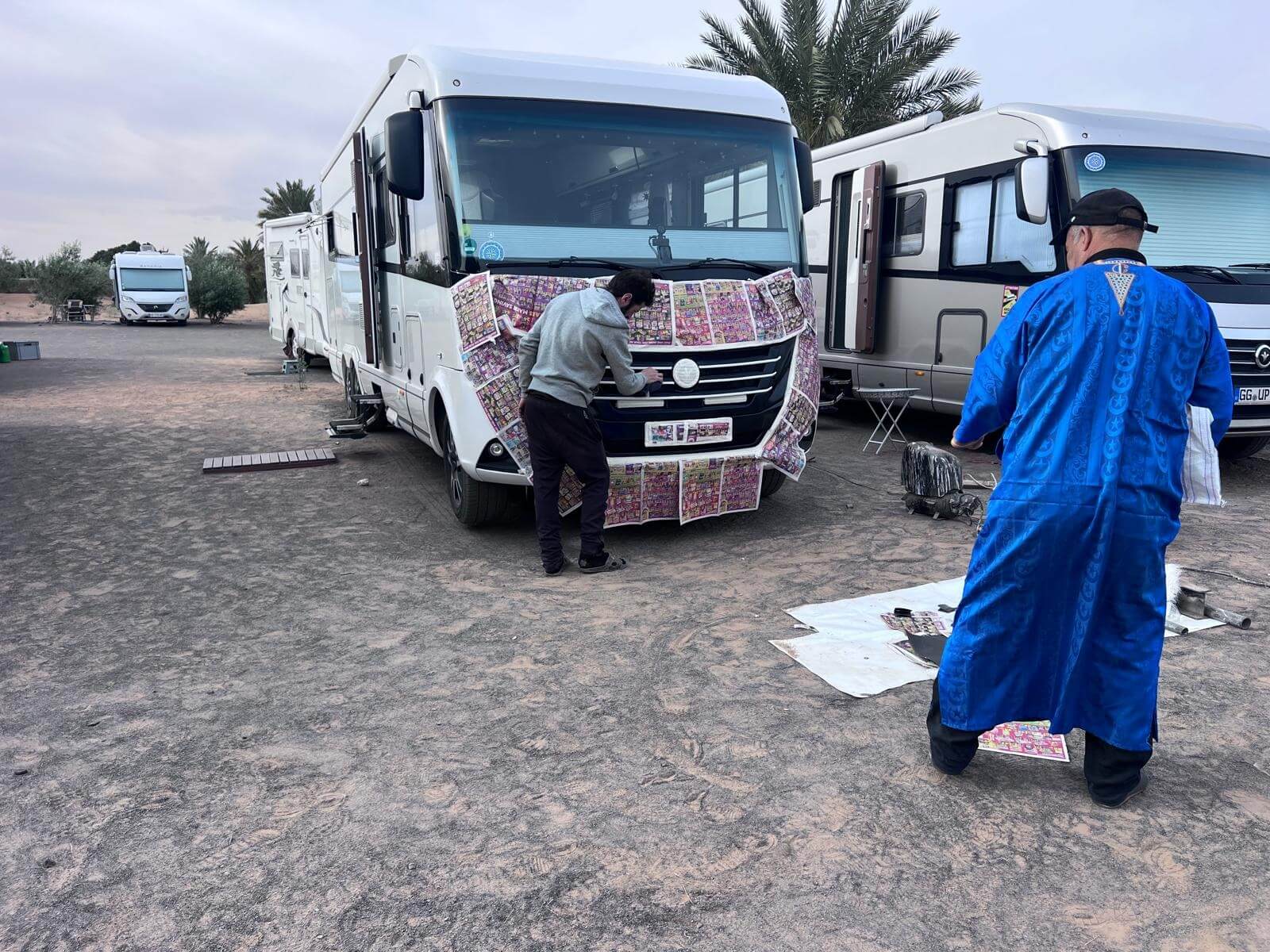 Auch heute beginnt unser Ruhetag etwas anders als gewohnt. Mit dem Ende des Ramadan wird in Marokko die Uhrzeit wieder umgestellt – eine Stunde zurück. Während des Fastenmonats gilt eine angepasste Zeit, damit sich der Tagesrhythmus besser an die Essenszeiten nach Sonnenuntergang anpasst. Nach dem Ramadan kehrt man wieder zur gewohnten Zeit zurück. Am Morgen kommen zunächst die Lackierer zu uns auf den Platz und führen bei einigen Fahrzeugen noch kleine Schönheitsreparaturen durch.