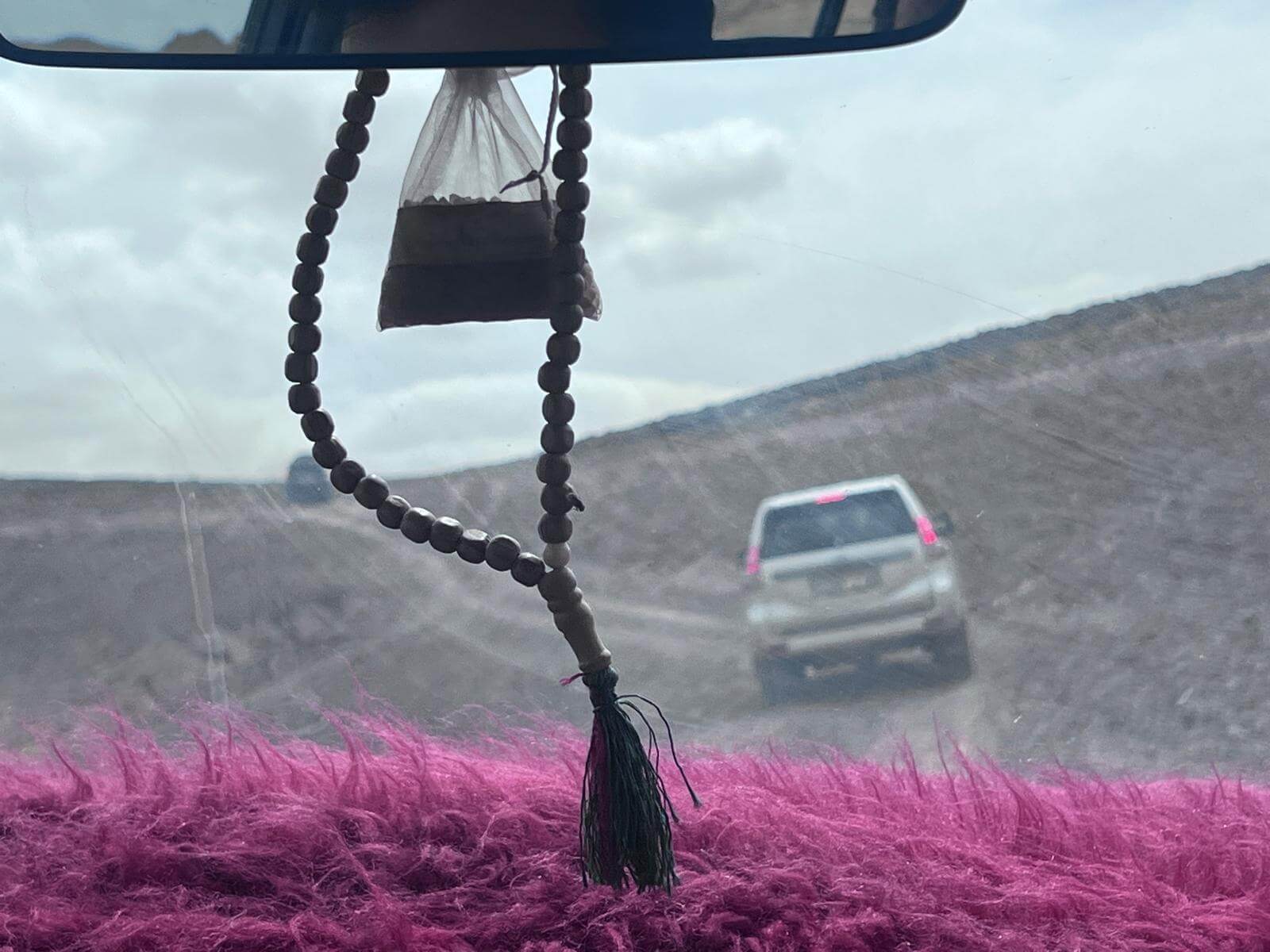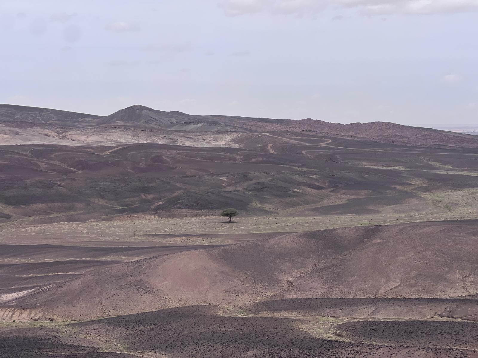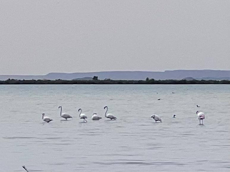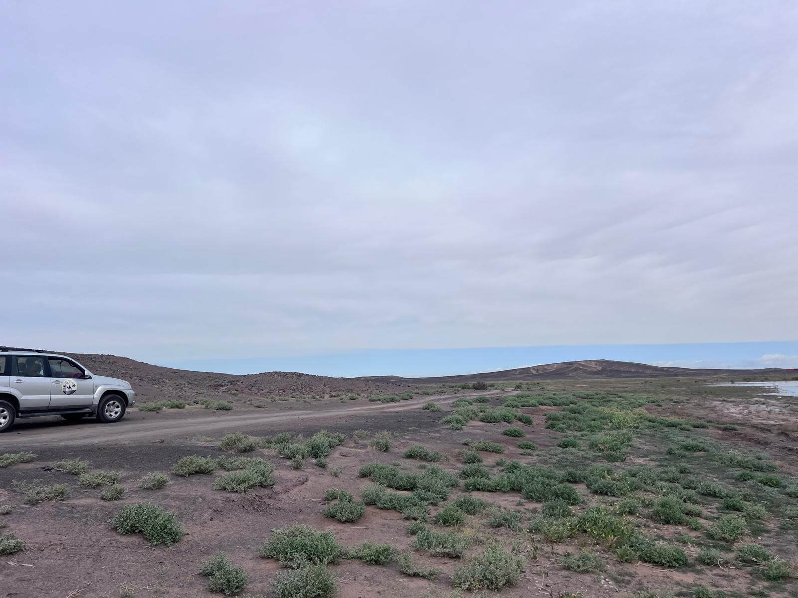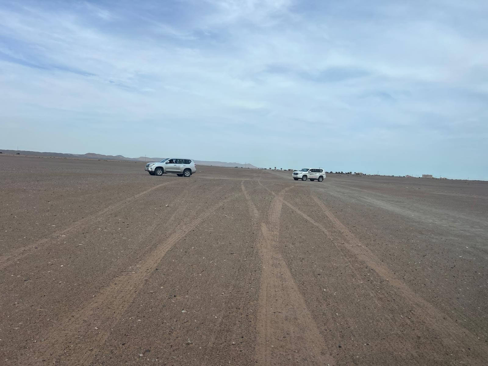 Um 09:30 Uhr werden wir von mehreren Jeeps abgeholt – heute steht ein gemeinsamer Ausflug auf dem Programm, und die ganze Gruppe ist dabei. Es geht hinaus in die abwechslungsreiche Landschaft rund um die Wüste. Unsere Fahrt führt uns durch die „schwarze Wüste“, die mit ihren dunklen Gesteinen einen spannenden Kontrast zu den goldenen Sanddünen bildet. Unterwegs entdecken wir einen See mit Flamingos, die in dieser Umgebung einen besonderen Anblick bieten.