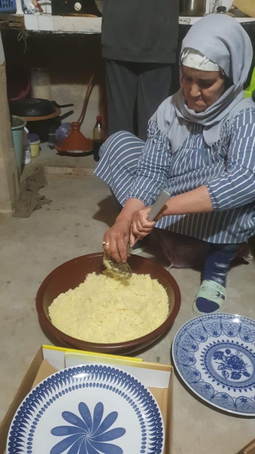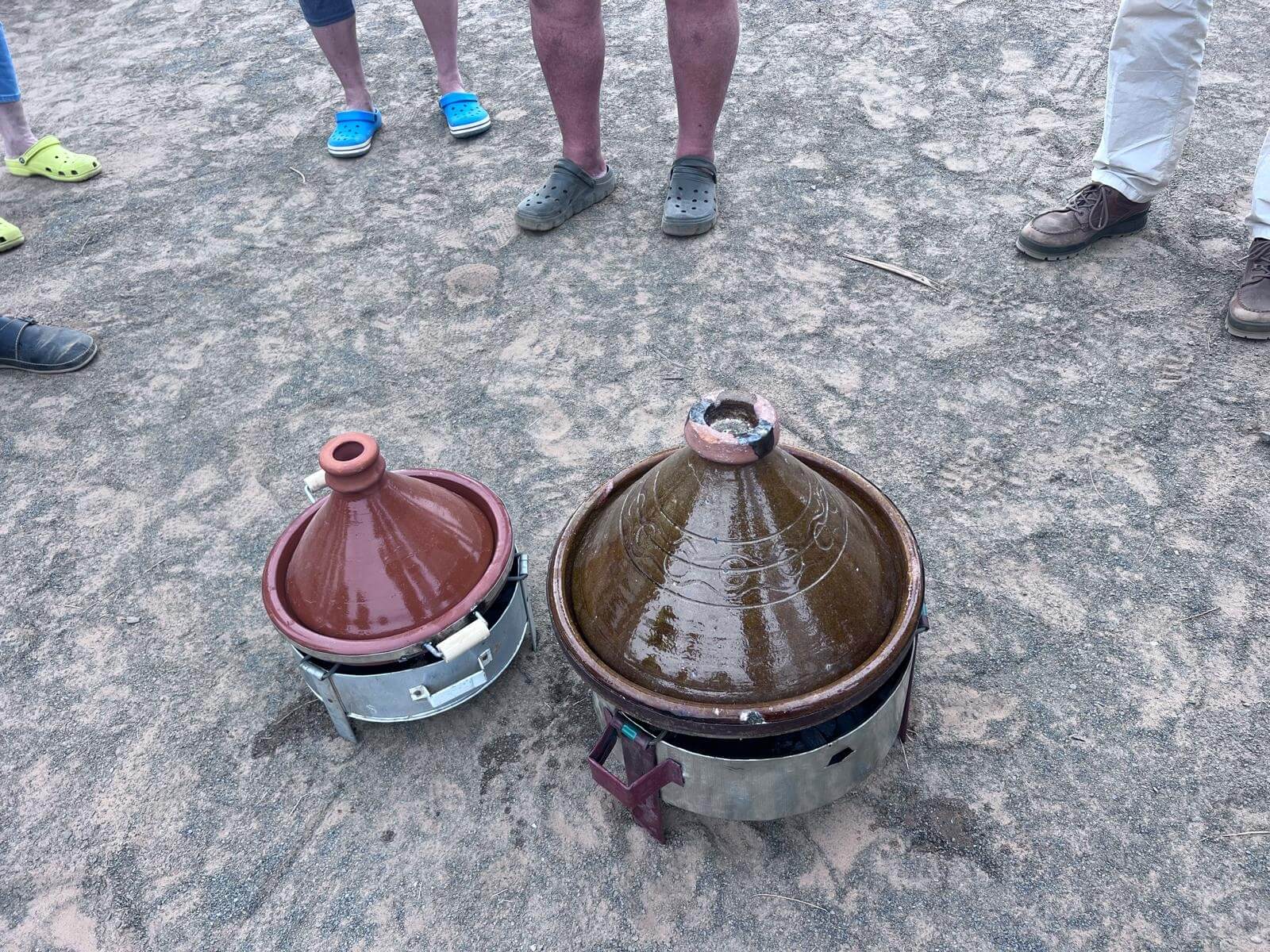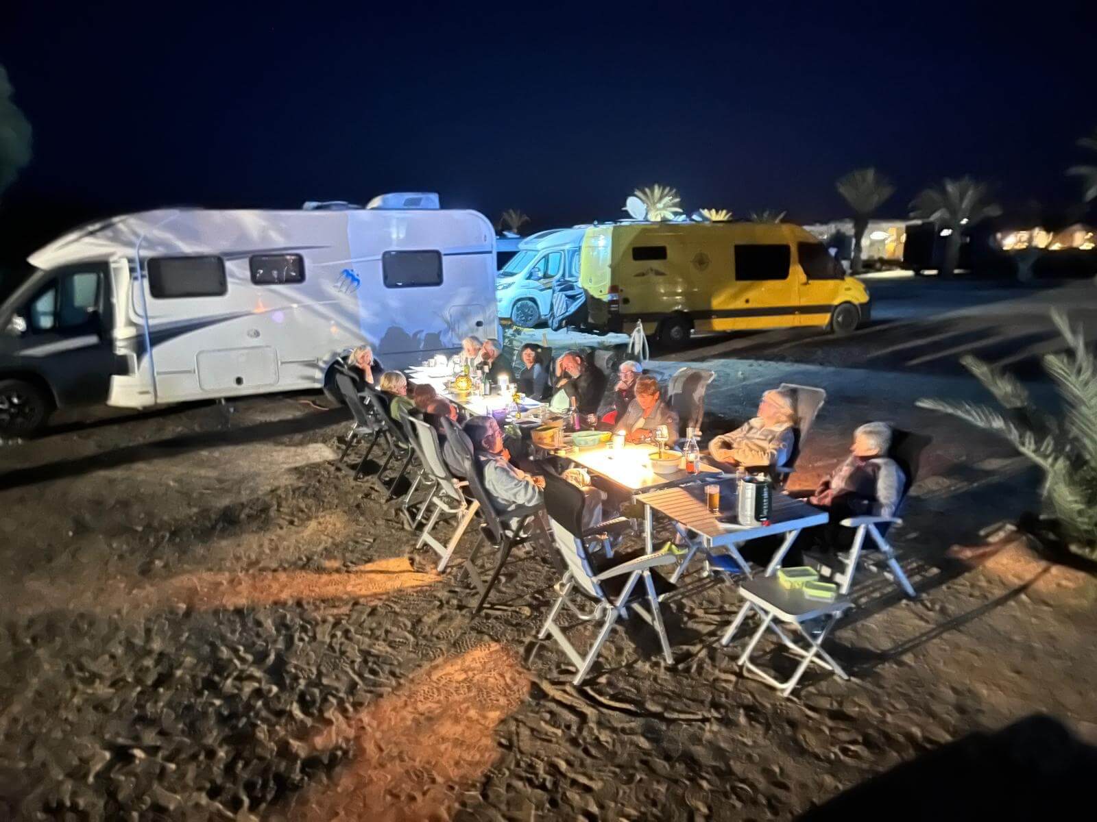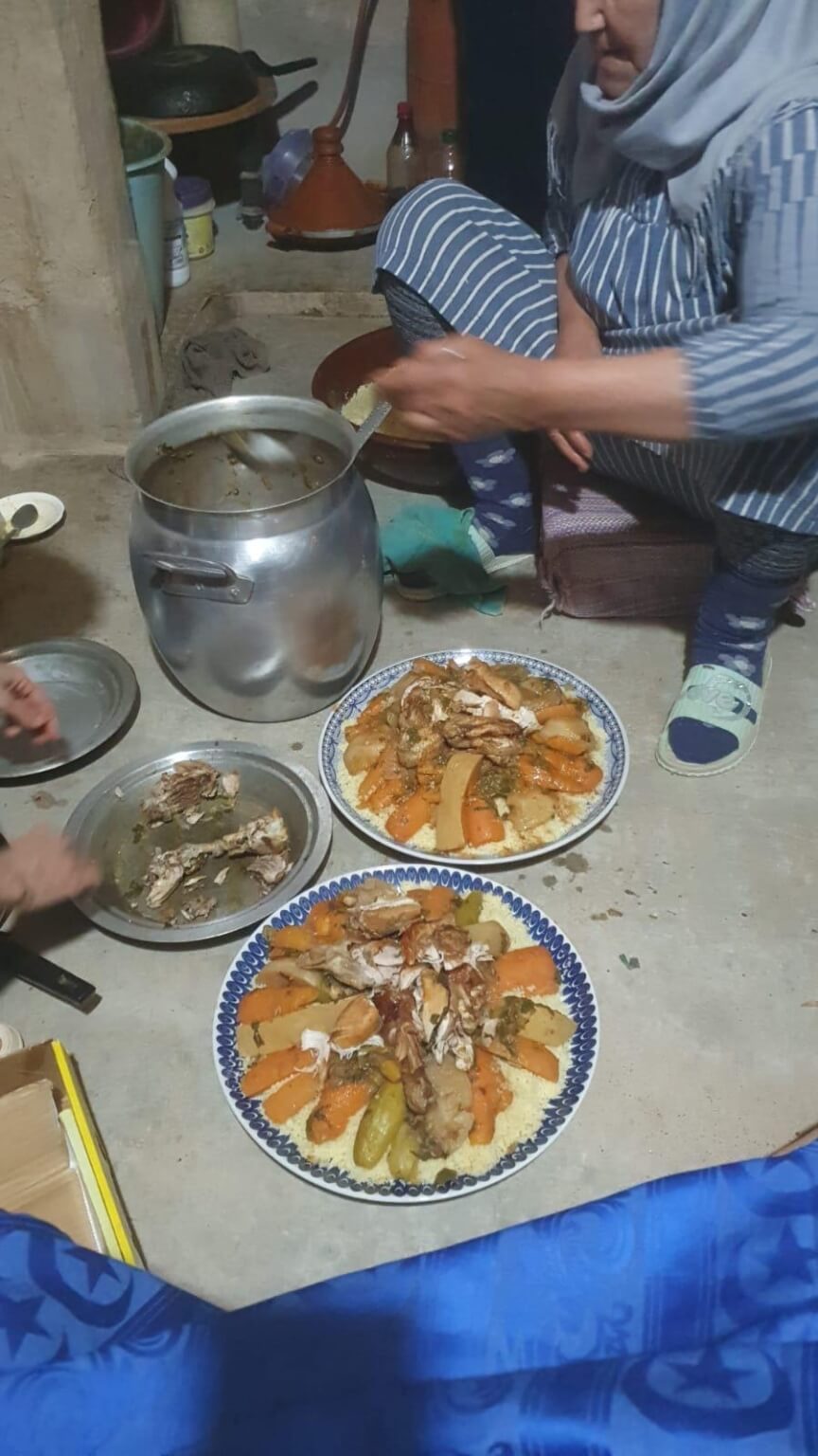 Dort angekommen treffen wir uns zur Routenbesprechung für die nächsten Tage. Am Abend wird gemeinsam gekocht: Es gibt eine leckere Hackfleisch-Tajine, die wir in geselliger Runde genießen – die beste Tajine, die wir auf dieser Reise gegessen haben. Ein großes Dankeschön an die Gruppe! Außerdem gab es Couscous, der uns frisch geliefert wurde ein herzliches Dankeschön an Zaid und seine Familie. Zusätzlich bereiteten wir zusätzlich einen frischen Obstsalat zu.