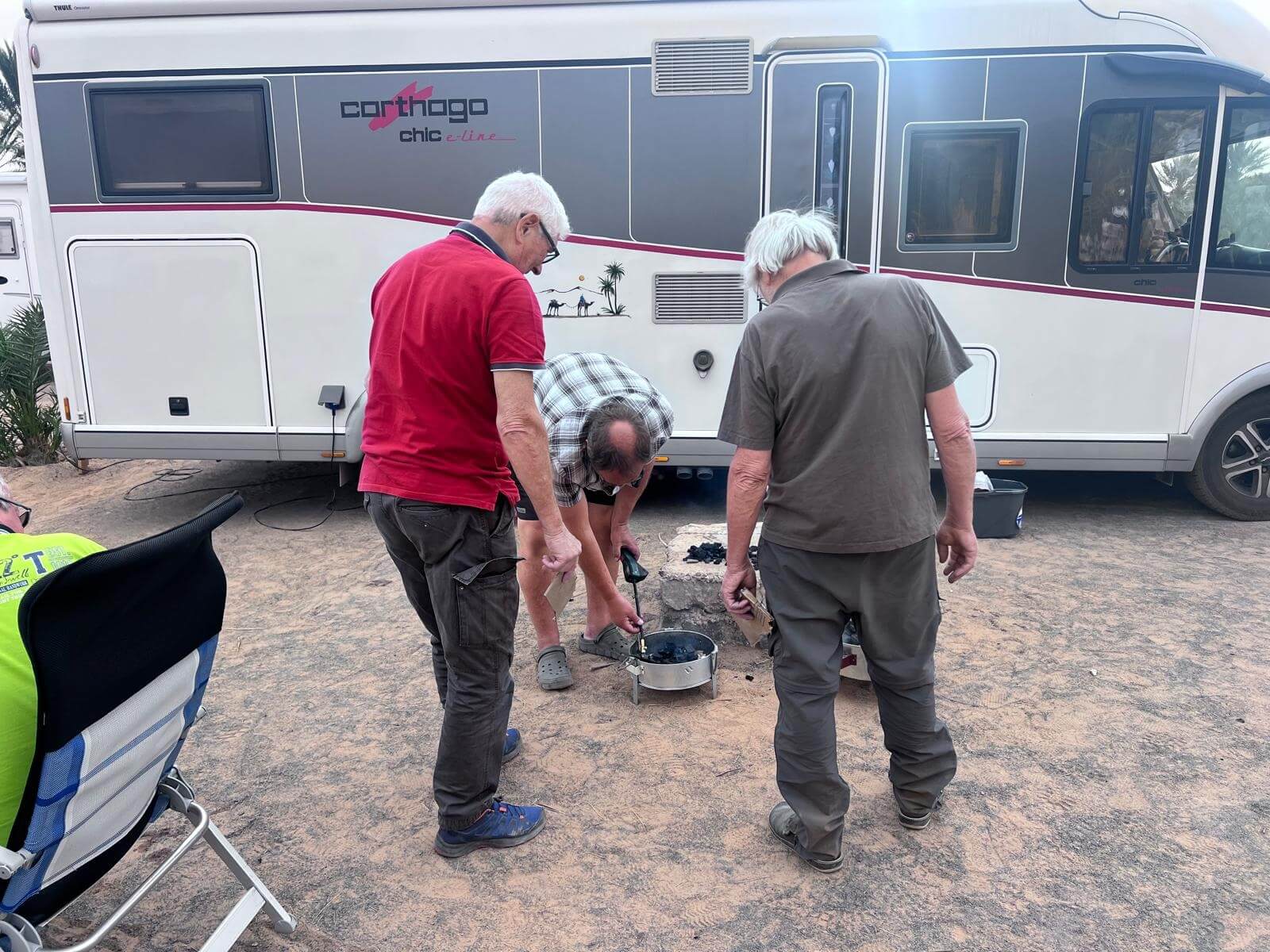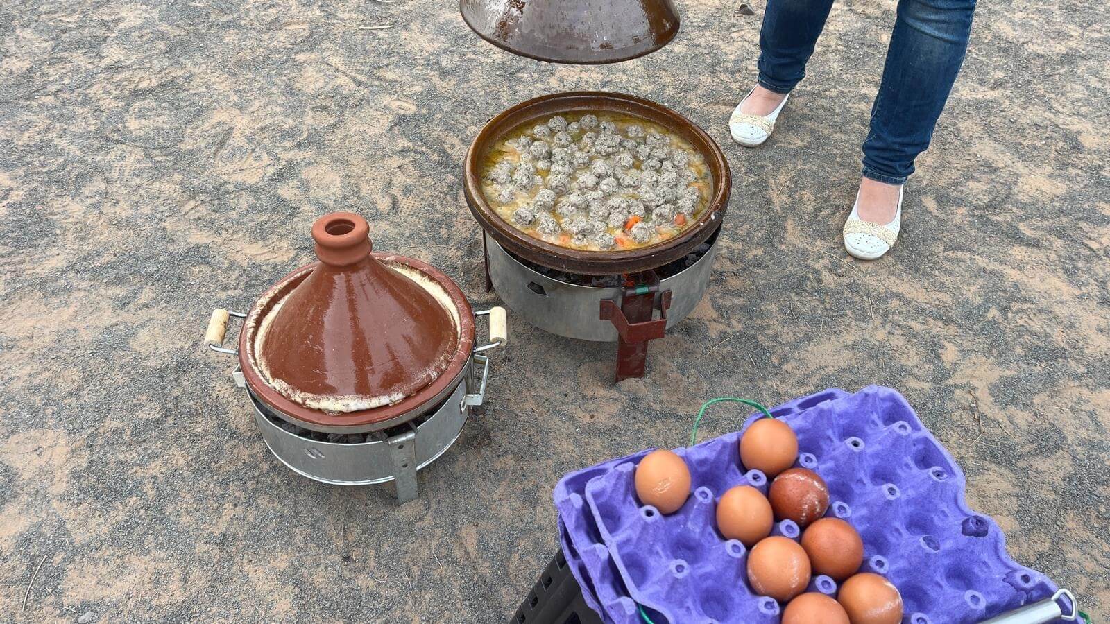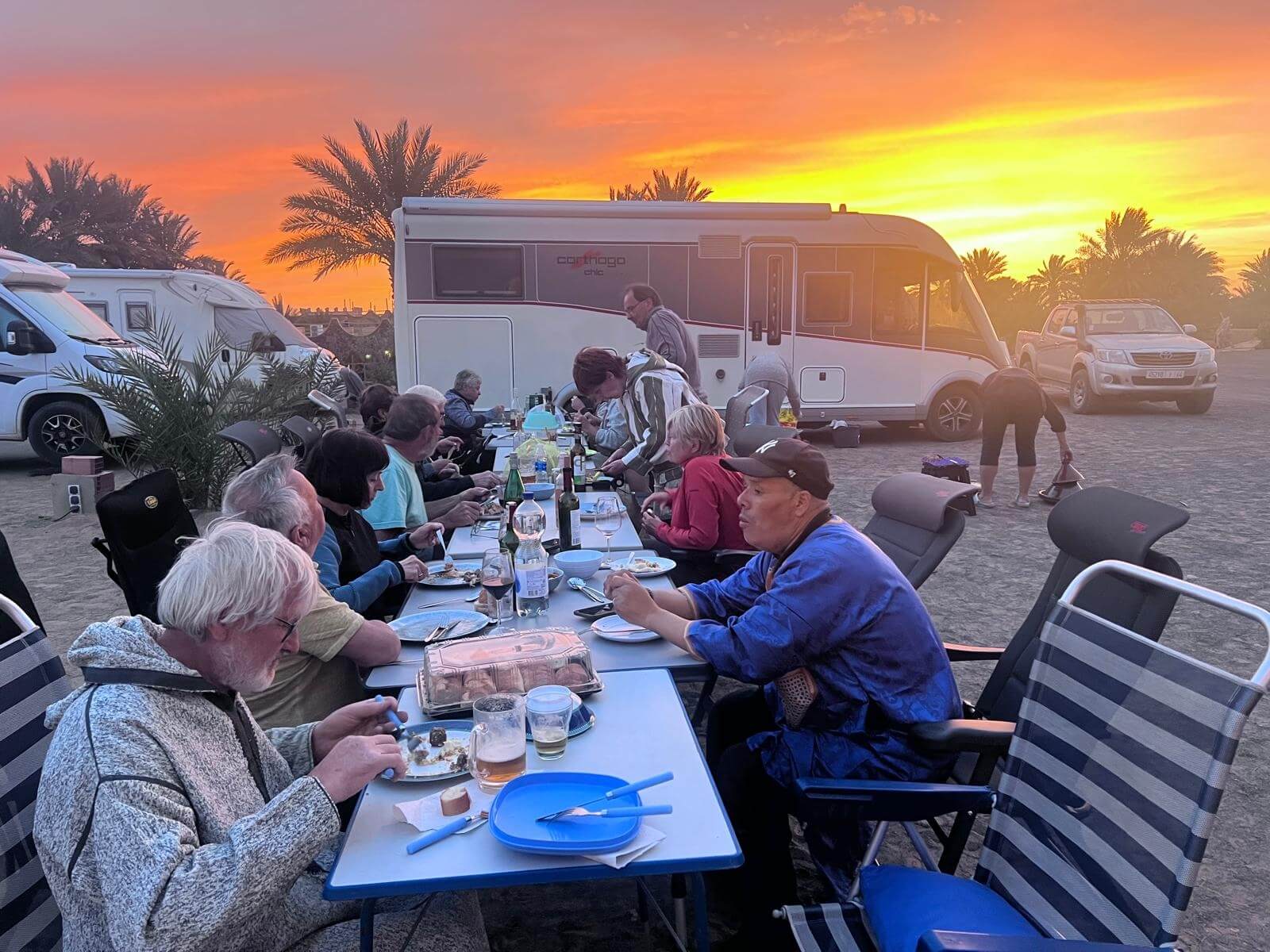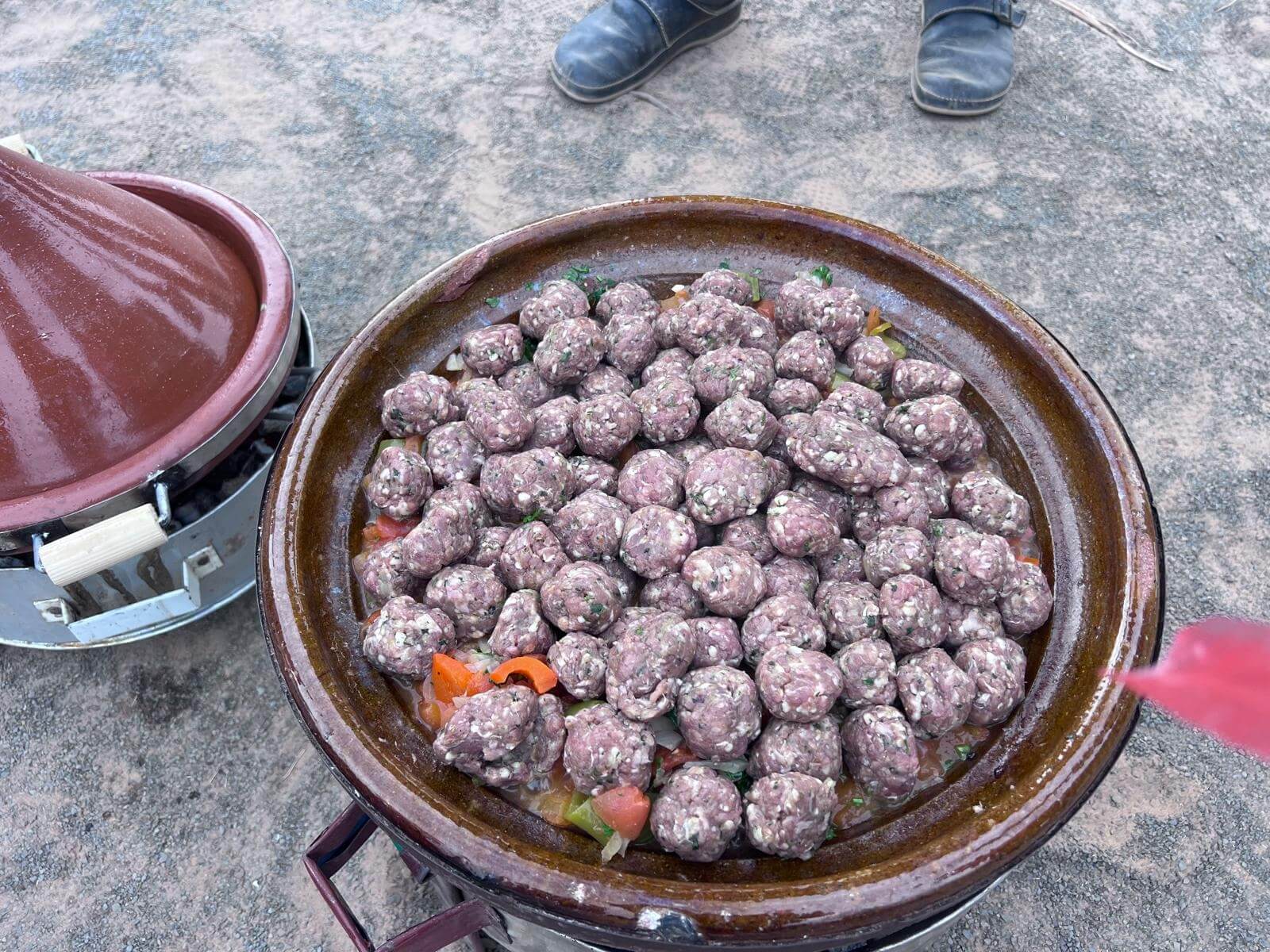 Dort angekommen treffen wir uns zur Routenbesprechung für die nächsten Tage. Am Abend wird gemeinsam gekocht: Es gibt eine leckere Hackfleisch-Tajine, die wir in geselliger Runde genießen – die beste Tajine, die wir auf dieser Reise gegessen haben. Ein großes Dankeschön an die Gruppe! Außerdem gab es Couscous, der uns frisch geliefert wurde ein herzliches Dankeschön an Zaid und seine Familie. Zusätzlich bereiteten wir zusätzlich einen frischen Obstsalat zu.