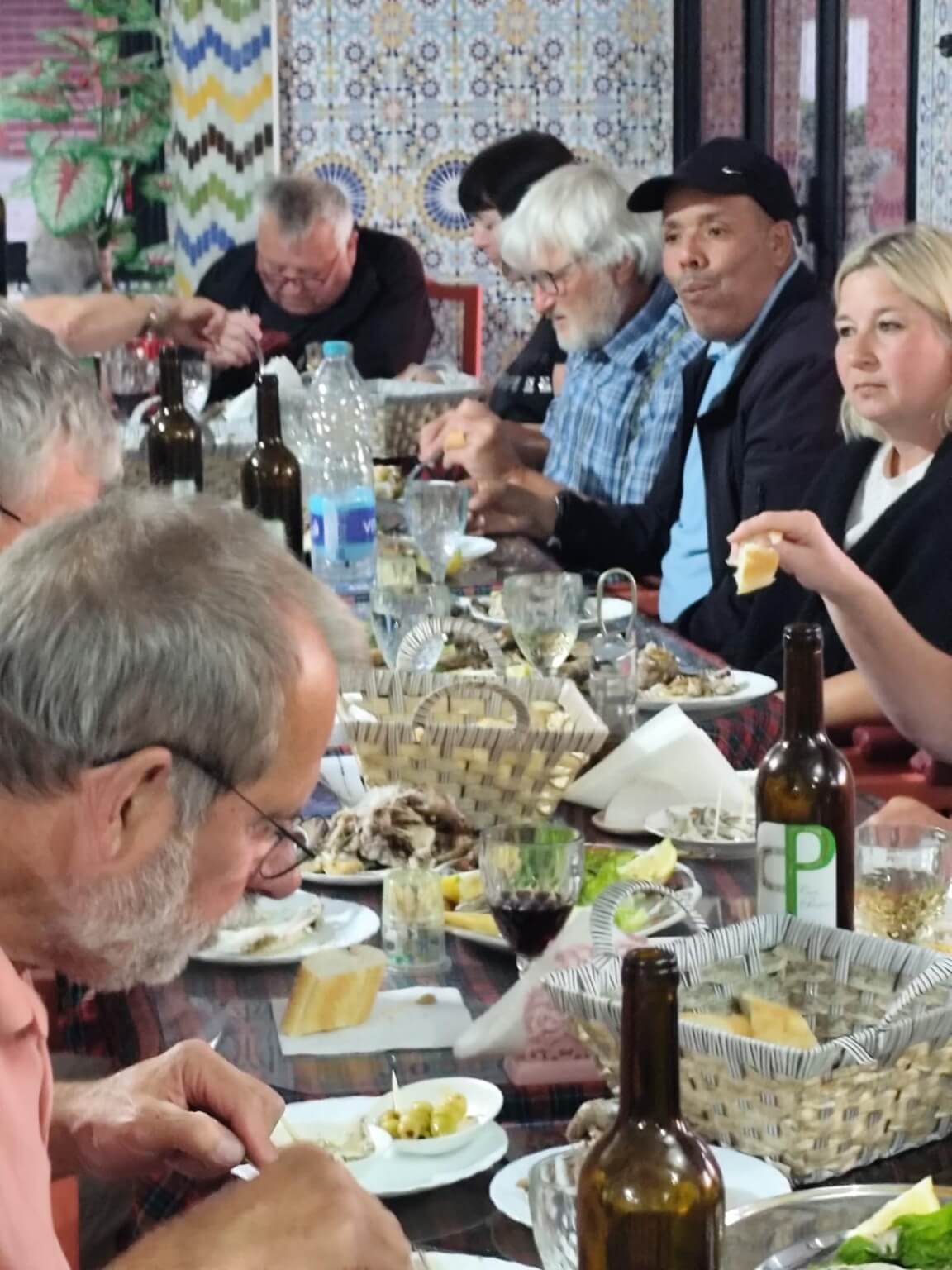Ein besonderer Moment des Abends ist das Gedicht von Ursula, das unsere gemeinsamen Erlebnisse auf wunderbare Weise widerspiegelt – vielen Dank dafür! Auch ein herzliches Dankeschön an Michael P., der stellvertretend für die Gruppe das Wort ergreift und die Reise noch einmal Revue passieren lässt. Und natürlich gilt unser besonderer Dank Zaid, der uns die letzten Wochen durch Marokko begleitet hat, immer für uns da war und es sogar in der Wüste geschafft hat, Dinge zu organisieren und möglich zu machen. Shukran!