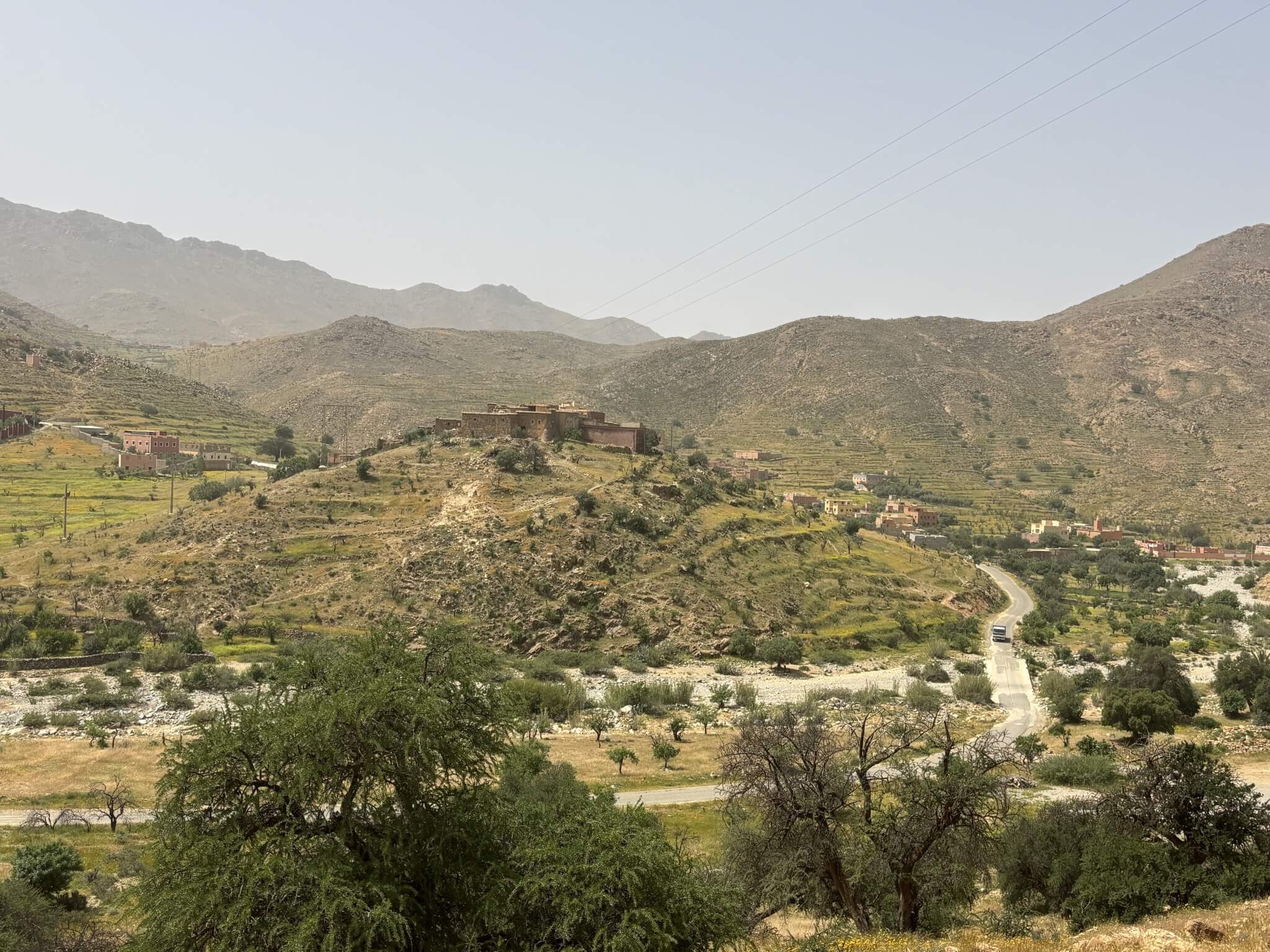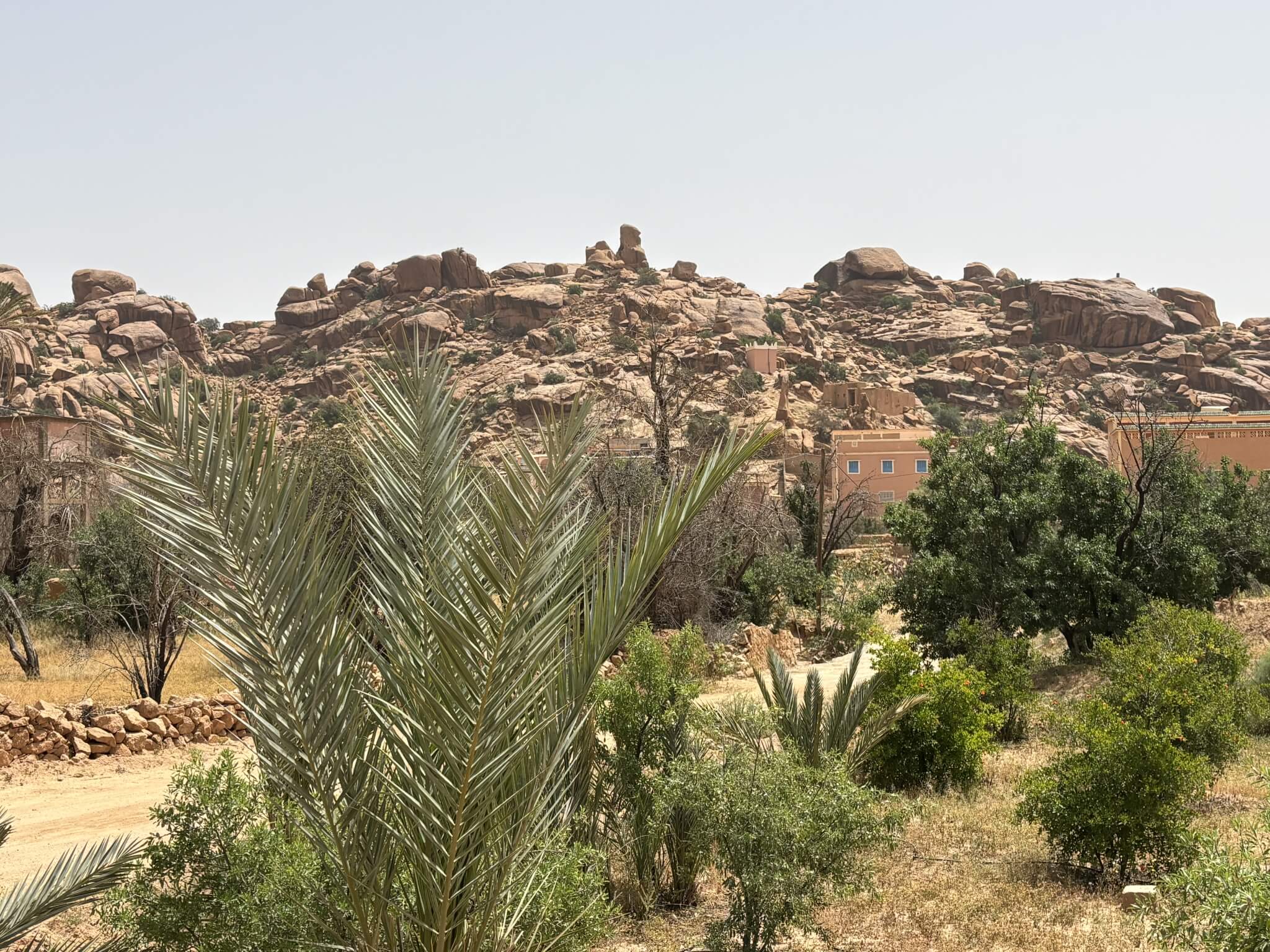 Wir beginnen unsere heutige Tagesetappe, indem wir zuerst bis Agadir fahren. Nachdem wir Agadir passiert haben, folgen wir der Nationalstraße N1 parallel zum Atlantik südwärts. Die Landschaft ist hier kahl und unspektakulär. Nach einhundert Kilometern erreichen wir die für die Silberschmuckherstellung bekannte Stadt Tiznit. Hier verlassen wir den Atlantik und fahren in den Antiatlas. Er bildet die südlichste der drei Bergketten des Atlasgebirges. Die Landschaft wird nach und nach abwechslungsreicher. Wir sehen viele kleine Dörfer, geschmiegt an die umliegenden Berge. Die Häuser sind unscheinbar lehmfarben oder in schönen Rot- oder Ockertönen gehalten. Langsam tauchen wir ein in das Marokko, wie man es sich außerhalb der Tourismusmetropolen vorstellt. Auf einer Passhöhe von 1.200 Metern Höhe machen wir in einem kleinen Café Pause und genießen den schönen Ausblick. Leider ist er, wie auf der gesamten heutigen Etappe, witterungsbedingt getrübt. Aber überall grünt und blüht es in den vielfältigsten Farben. Auf unserer Fahrt tauchen in dieser kargen Landschaft immer wieder grüne Palmenhaine (Oasen) vor uns auf. Schließlich erreichen wir das „Babuschenzentrum“ Marokkos, Tafraoute. Wir fahren durch den kleinen Ort und biegen ins Tal der Ammeln ab. Tafraoute, wie das gesamte Tal der Ammeln, ist umgeben von bizarr geformten Felsen. Das Tal trägt seinen Namen von dem Berberstamm der Region. Am Campingplatz angekommen richten wir uns ein und suchen einen schattigen Sitzplatz. Die Dreißig-Grad-Marke haben wir längst überschritten. Auf 17 Uhr hat der Platzbetreiber zum Begrüßungstee, dem sogenannten Berberwhisky, eingeladen. Danach treffen wir uns zu einem Umtrunk und stoßen gemeinsam auf Kai, unser heutiges Geburtstagskind, an. Gemeinsam verbringen wir einen schönen Abend.