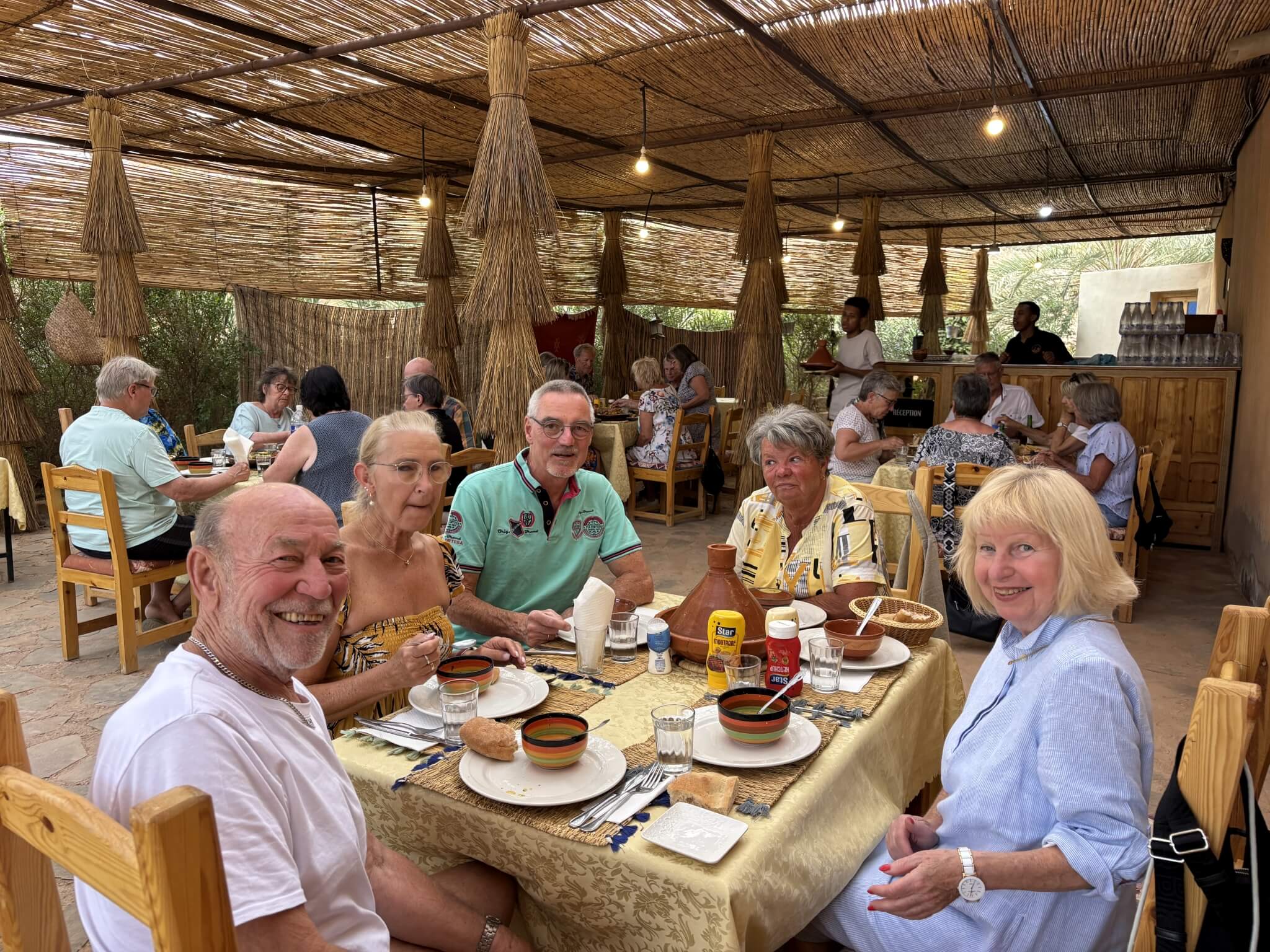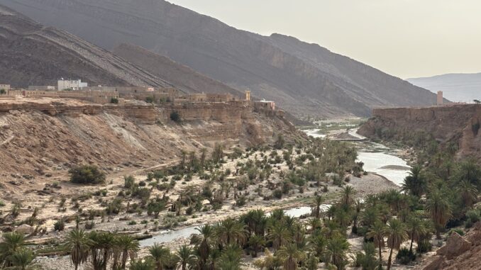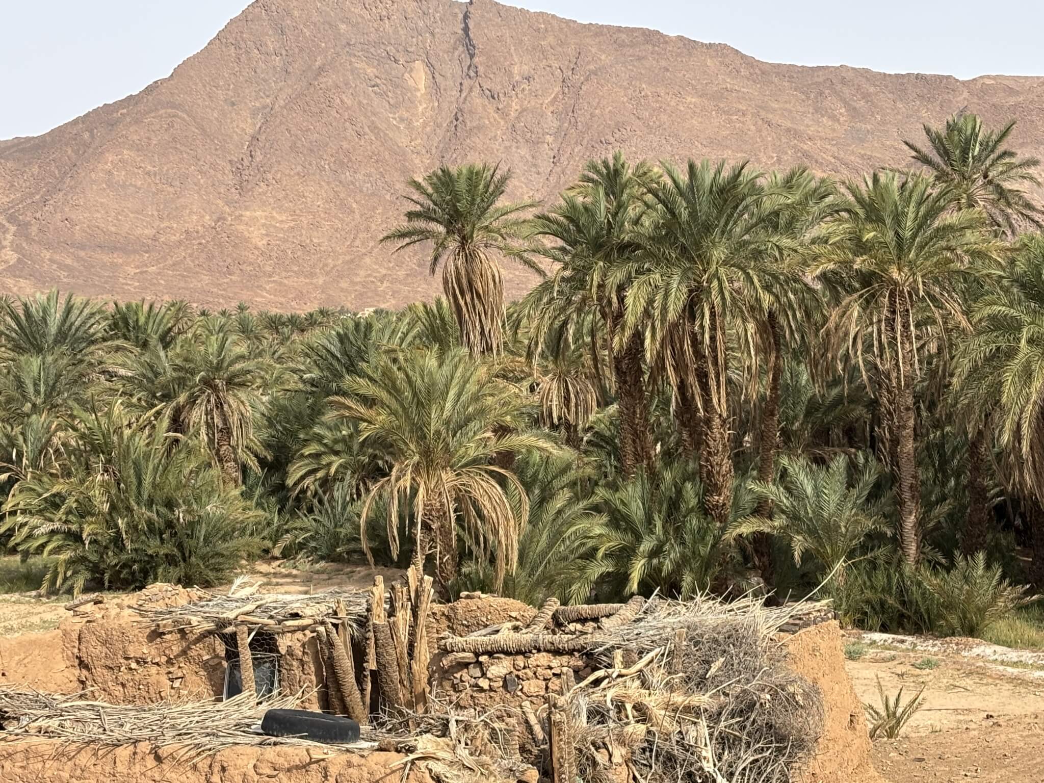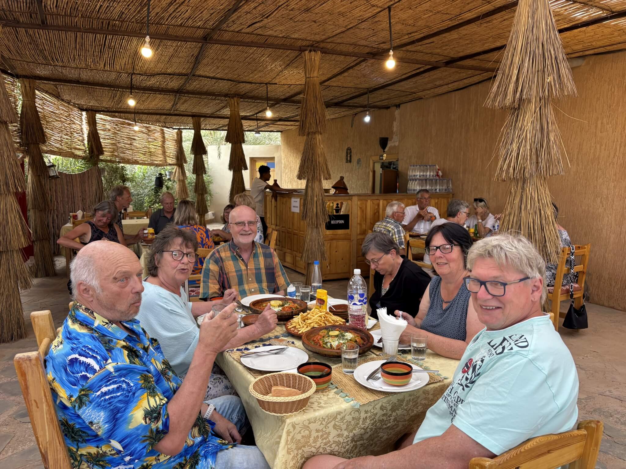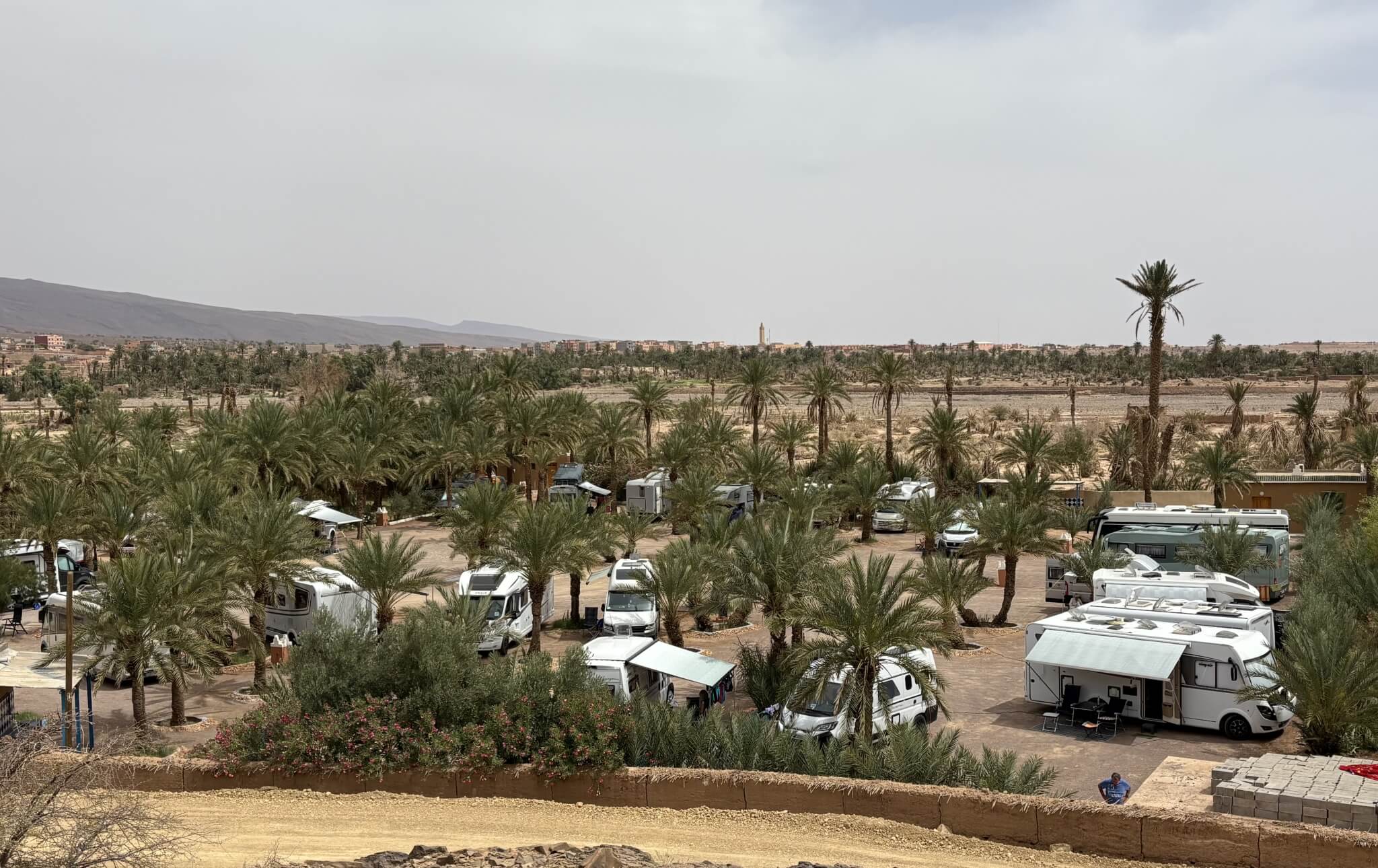 Heute liegen nur 140 Kilometer auf gut ausgebauter Straße vor uns. Wir werden also zügig vorankommen und können uns früh richtig Zeit lassen. Auf unserer Route gibt es wieder viele beschädigte Flussquerungen, die uns aber keine Probleme bereiten, da sie gut gesichert und schon im Sanierungsprozess sind. Bei einer weggespülten Brücke haben die Marokkaner eine Behelfsumfahrung angelegt. Wir staunen immer wieder, wie schnell sie ihre Frühjahrsschäden reparieren. Ansonsten ist die Landschaft heute eher karg, aber trotzdem beeindruckend. Gelegentlich sehen wir Plantagen mit Dattelpalmen, kleine Felder, Dromedare, Esel, Ziegen sowie kleine Dörfer und Siedlungen. Da Sonntag ist, erwacht das Leben erst nach und nach. Aufgrund der vorangegangenen Regenfälle findet sich in einigen Flussbetten noch genügend Wasser für die angrenzenden Bäume und Pflanzen. Auch können wir mehrere Palmenoasen entlang unserer Route sehen. Kurz vor Tissint gibt es einen schönen Aussichtspunkt, an dem wir einen Fotostopp mit Blick in eine große Oase und den Ort einlegen. Nach knapp drei Stunden erreichen wir unseren Campingplatz. Wir stehen unter Palmen und genießen den Nachmittag. Um 18 Uhr treffen wir uns zur Besprechung des nächsten Fahrtages, bevor wir ins Restaurant des Campingplatzes wechseln. Dort haben wir für uns ein Menü vorbestellt. Die Hauptspeise, Tajine Kefta, hat uns besonders gut geschmeckt. Da es ein sehr milder Abend ist, verbringen ihn die meisten noch etwas im angeregten Gespräch vor ihren Wohnmobilen. So geht wieder ein abwechslungsreicher Tag zu Ende. Leider musste ein Paar wegen technischer Probleme in die Werkstatt nach Zagora, unserem nächsten Tagesziel, geschleppt werden. Wir drücken ihnen die Daumen, dass die Reparatur schnell gelingt und sie ihre Fahrt bald mit uns gemeinsam fortsetzen können.