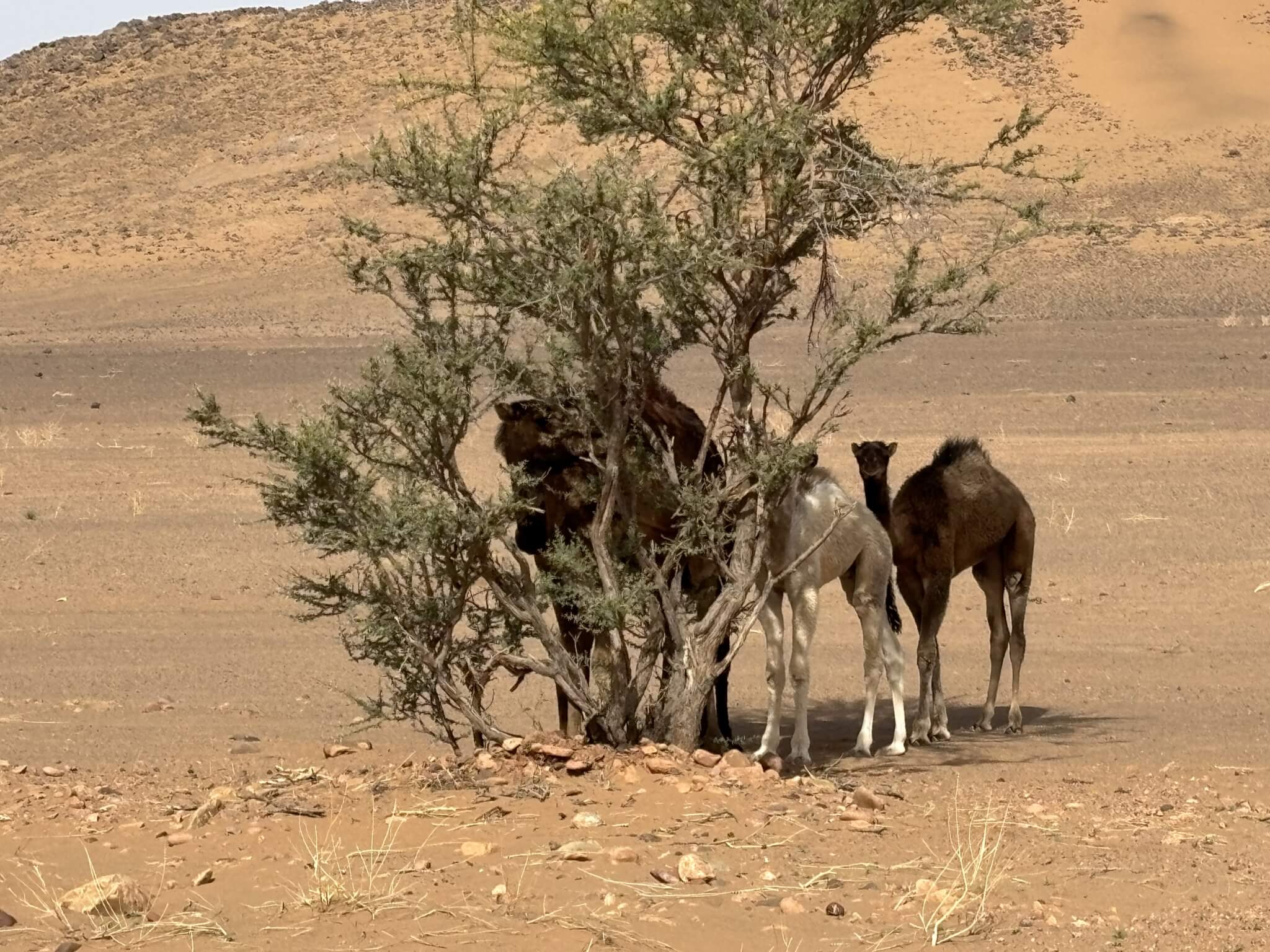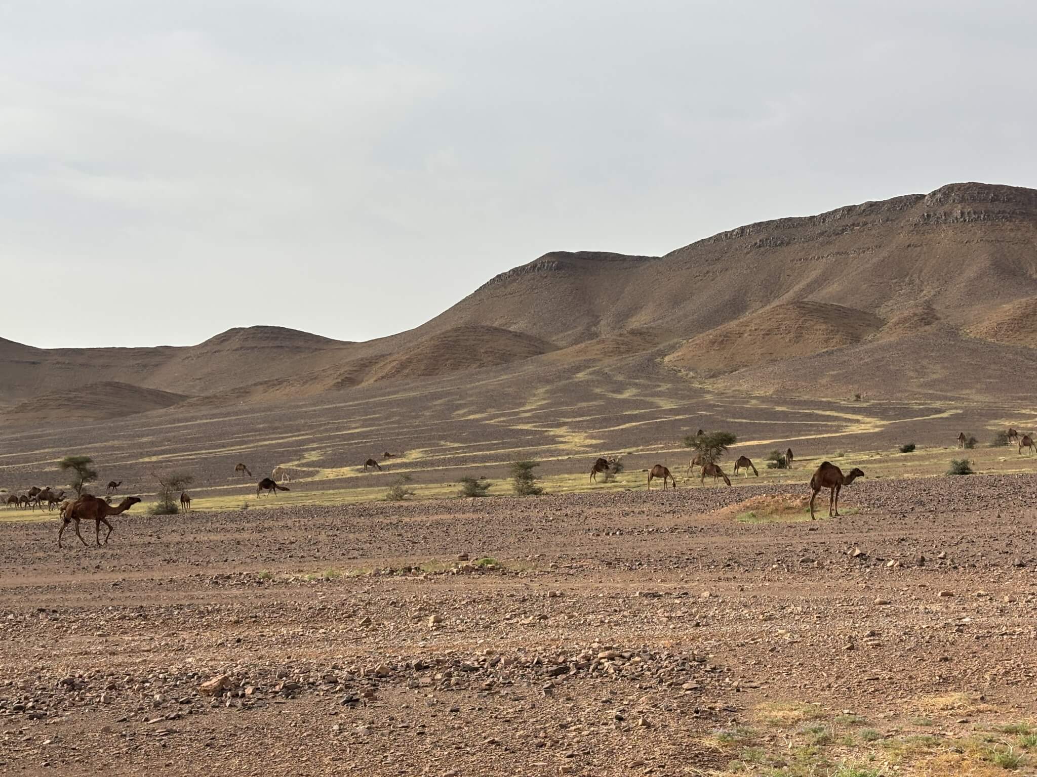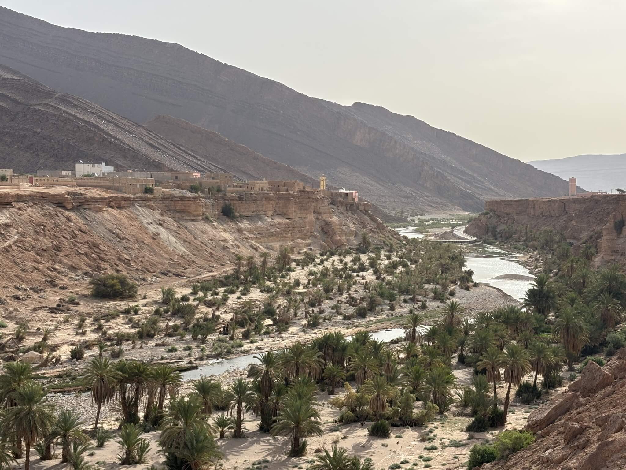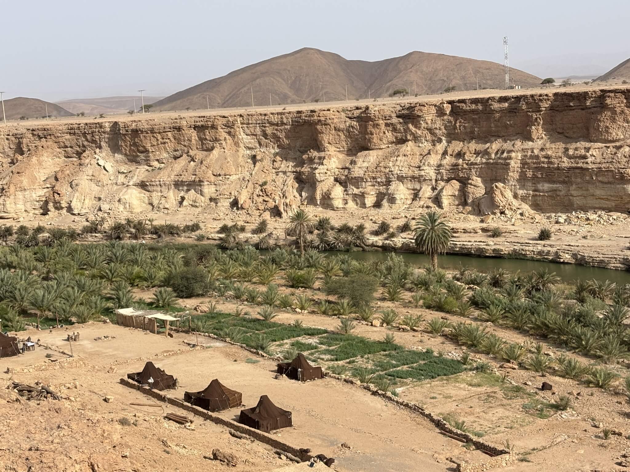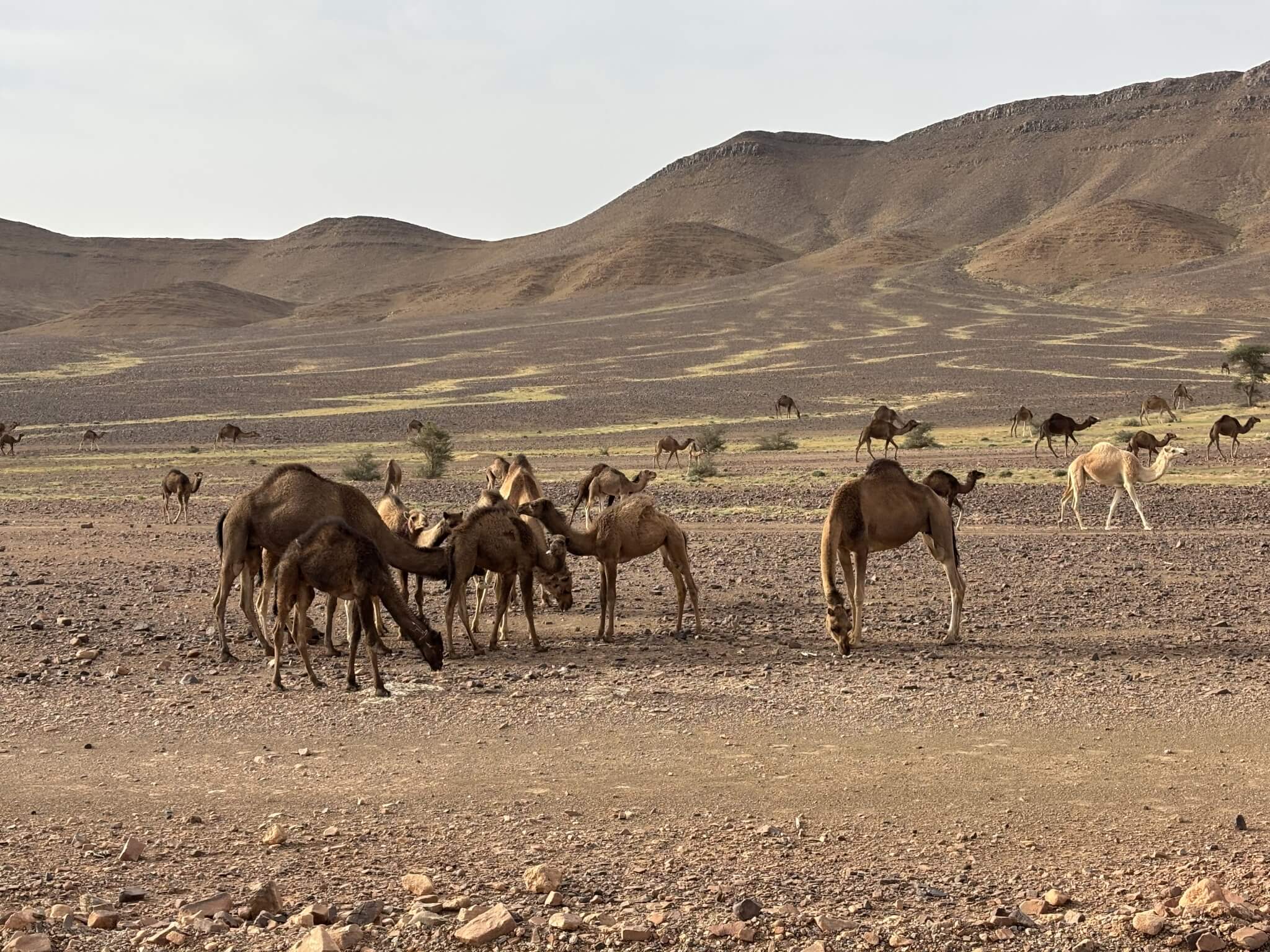 Heute liegen nur 140 Kilometer auf gut ausgebauter Straße vor uns. Wir werden also zügig vorankommen und können uns früh richtig Zeit lassen. Auf unserer Route gibt es wieder viele beschädigte Flussquerungen, die uns aber keine Probleme bereiten, da sie gut gesichert und schon im Sanierungsprozess sind. Bei einer weggespülten Brücke haben die Marokkaner eine Behelfsumfahrung angelegt. Wir staunen immer wieder, wie schnell sie ihre Frühjahrsschäden reparieren. Ansonsten ist die Landschaft heute eher karg, aber trotzdem beeindruckend. Gelegentlich sehen wir Plantagen mit Dattelpalmen, kleine Felder, Dromedare, Esel, Ziegen sowie kleine Dörfer und Siedlungen. Da Sonntag ist, erwacht das Leben erst nach und nach. Aufgrund der vorangegangenen Regenfälle findet sich in einigen Flussbetten noch genügend Wasser für die angrenzenden Bäume und Pflanzen. Auch können wir mehrere Palmenoasen entlang unserer Route sehen. Kurz vor Tissint gibt es einen schönen Aussichtspunkt, an dem wir einen Fotostopp mit Blick in eine große Oase und den Ort einlegen. Nach knapp drei Stunden erreichen wir unseren Campingplatz. Wir stehen unter Palmen und genießen den Nachmittag. Um 18 Uhr treffen wir uns zur Besprechung des nächsten Fahrtages, bevor wir ins Restaurant des Campingplatzes wechseln. Dort haben wir für uns ein Menü vorbestellt. Die Hauptspeise, Tajine Kefta, hat uns besonders gut geschmeckt. Da es ein sehr milder Abend ist, verbringen ihn die meisten noch etwas im angeregten Gespräch vor ihren Wohnmobilen. So geht wieder ein abwechslungsreicher Tag zu Ende. Leider musste ein Paar wegen technischer Probleme in die Werkstatt nach Zagora, unserem nächsten Tagesziel, geschleppt werden. Wir drücken ihnen die Daumen, dass die Reparatur schnell gelingt und sie ihre Fahrt bald mit uns gemeinsam fortsetzen können.