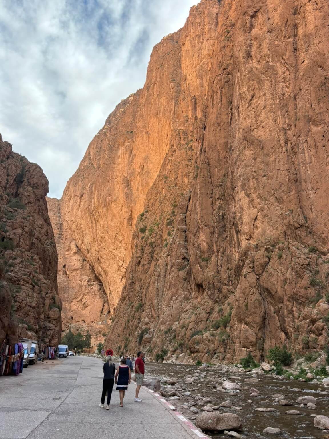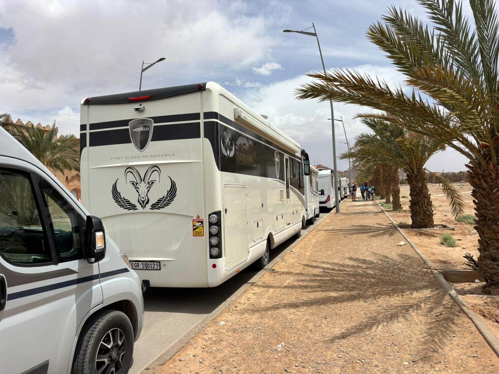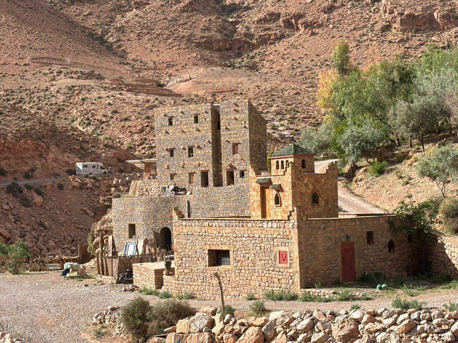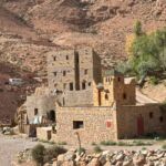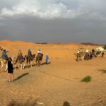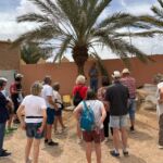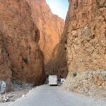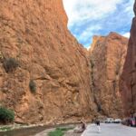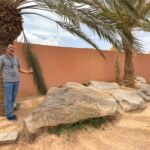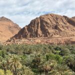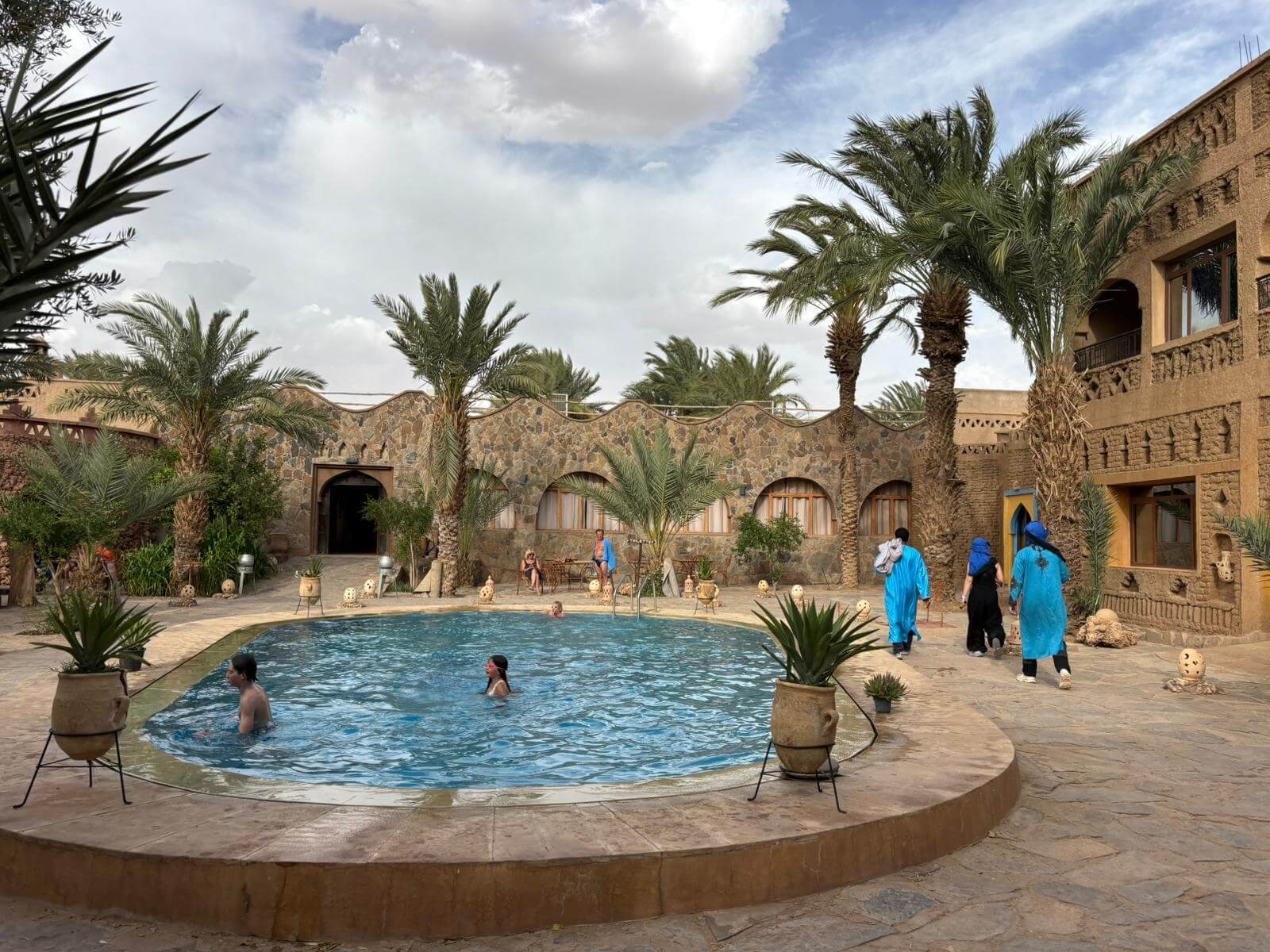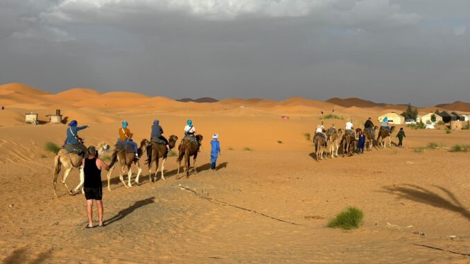 Heute liegen ca. 200 Kilometer vor uns und wir fahren wieder durch eine beeindruckende Landschaft. Nach 40 Minuten erreichen wir den Höhepunkt der heutigen Etappe, die Todra-Schlucht. An ihrer engsten Stelle ist sie nur zehn Meter breit und die Felswände ragen beeindruckend steil in die Höhe. Wir durchfahren die Engstelle und kommen an schönen Obstgärten und kleinen Lehmdörfern, eng an die Felsen geschmiegt, vorbei. Nach zwei Dritteln unserer Tagesetappe treffen wir uns in Erfoud an einer Steinschleiferei. Majid, der Firmenchef, stellt uns die vielfältigen Produkte seiner Firma und die einzelnen Bearbeitungsschritte vor. Auch erfahren wir viele interessante Details zur Entstehung der Fossilien vor 350 bis 450 Millionen Jahren. Wer möchte, kann anschließend Produkte der Firma käuflich erwerben. Gemeinsam fahren wir weiter zu unserem Campingplatz in Merzouga. Nach kurzer Zeit haben die ersten Reiseteilnehmer den Hotelpool als Platz ihrer Wahl für den Nachmittag entdeckt. Kurz nach 18 Uhr starten einige Teilnehmer zum Ausritt mit dem Dromedar zum Sonnenuntergang in die Wüste. Am Abend zieht es viele ins Restaurant, wo heute ein Buffet angeboten wird. In gemütlichen Runden beenden wir den Tag am Rande der Wüste.