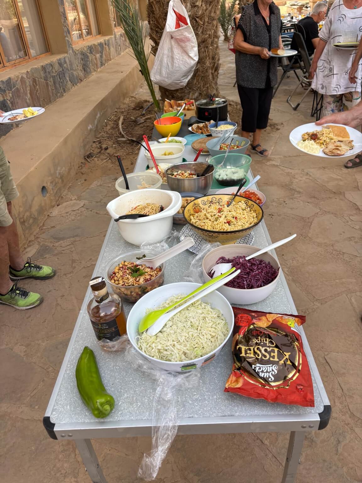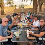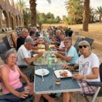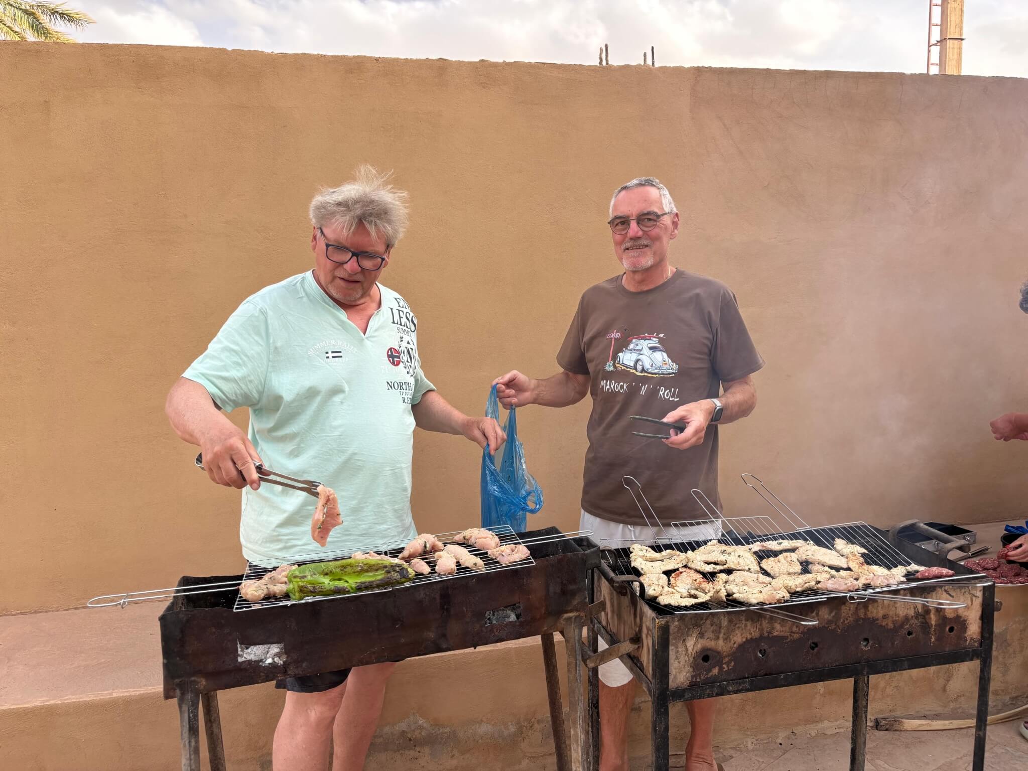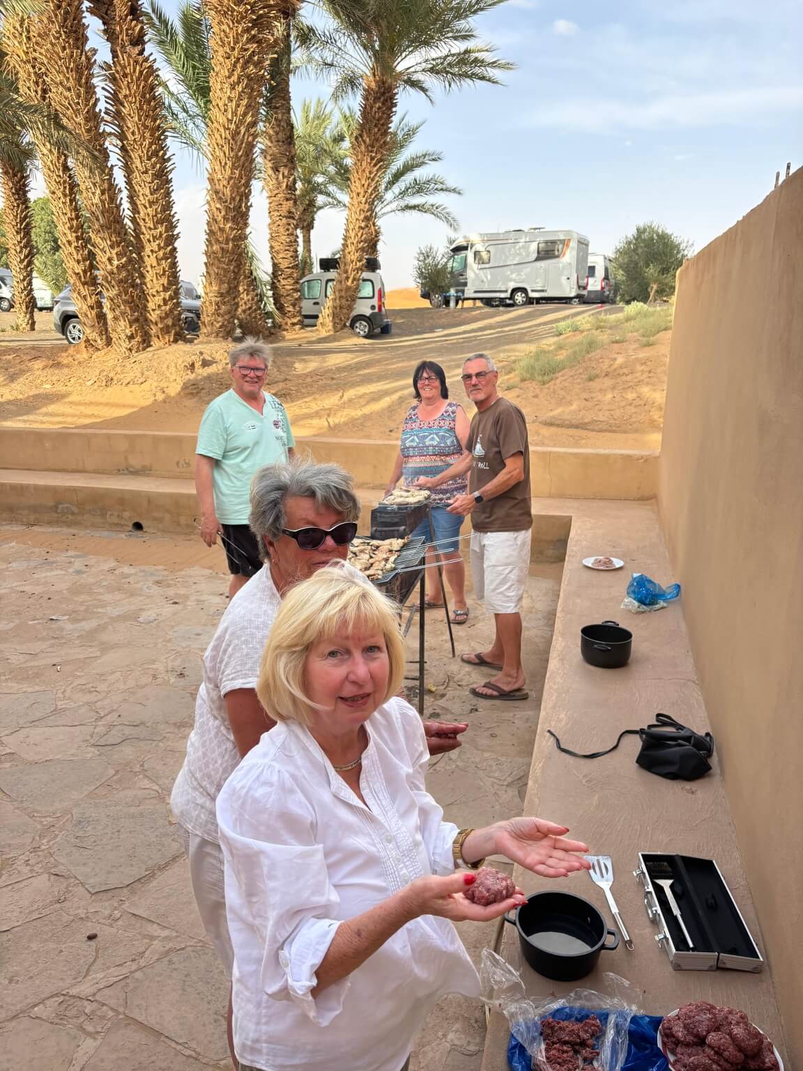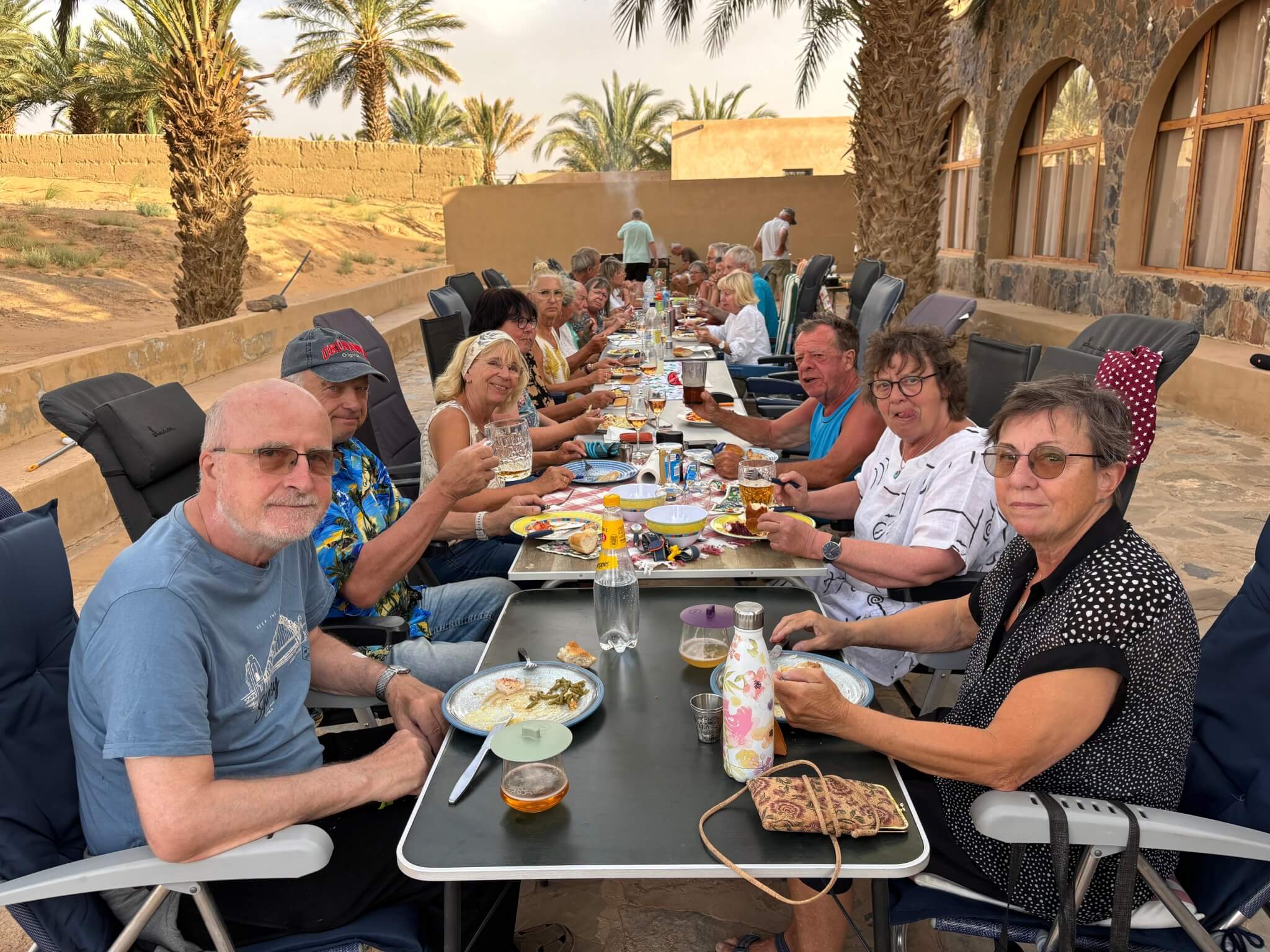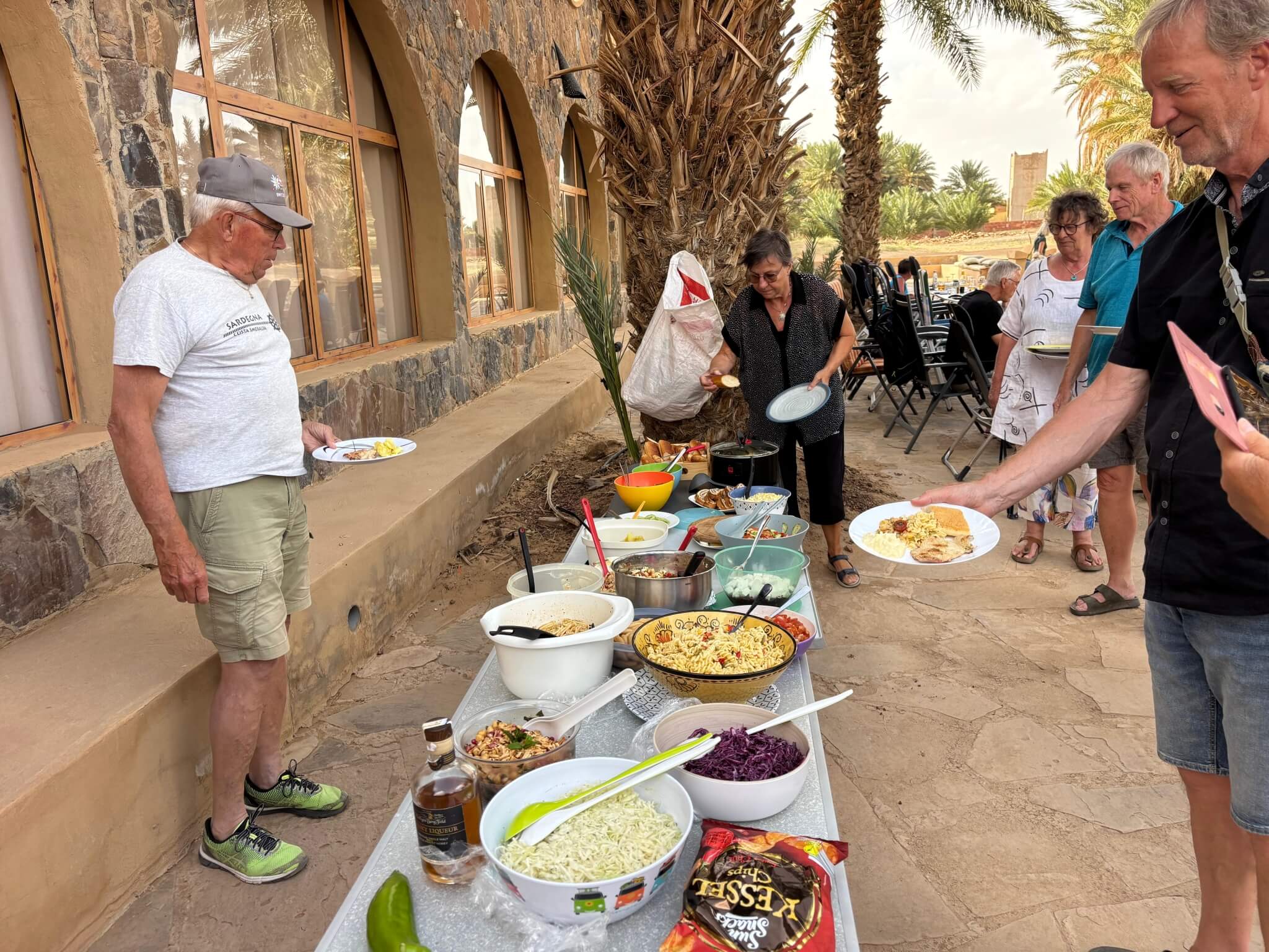 Nachdem die Frühaufsteher den tollen Sonnenaufgang über der Wüste beobachtet haben, kommen bald schon die Wüstenübernachter zurück. Die ganze Nacht hat es weiter gestürmt, aber ganz langsam ebbt der Wind ab. Unser hilfsbereiter Michael fährt mit zwei Gästen zurück nach Zagora. Das Wohnmobil mit Getriebeschaden soll fertig werden. Wenn alles gut geht, treffen wir alle drei am nächsten Campingplatz wieder. Wir übrigen Reiseteilnehmer genießen den Ruhetag. Einige wandern in die Wüste, andere haben eine Jeepsafari gebucht. Natürlich lockt auch der Hotelpool. Am Nachmittag trifft jeder noch letzte Vorbereitungen für unsere nächste Campertafel, bevor wir um 17 Uhr noch kurz den nächsten Fahrtag besprechen. Danach treffen wir uns gemeinsam zum Abendessen. Jeder hat wieder etwas für die Gruppe vorbereitet und trägt so zu einem reichhaltigen Buffet bei. Alle genießen das Beisammensein und den wunderschönen Abend.