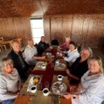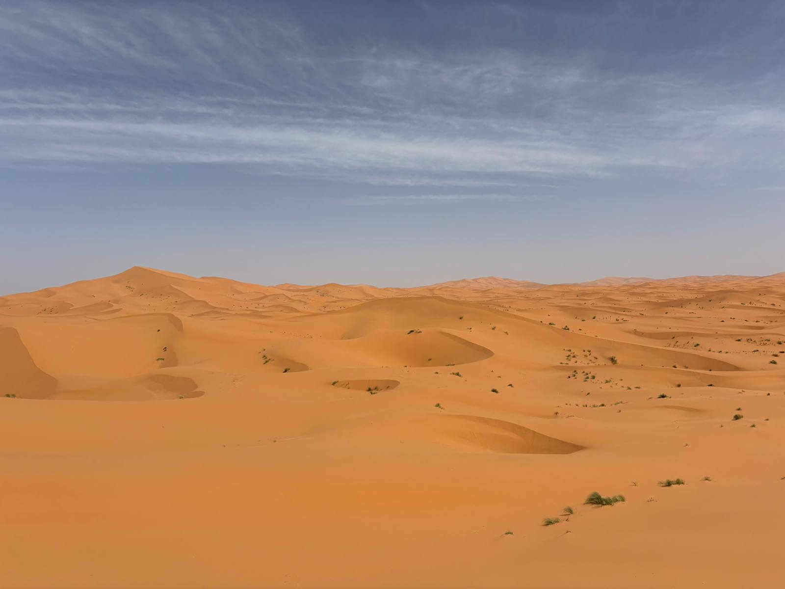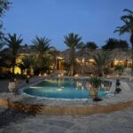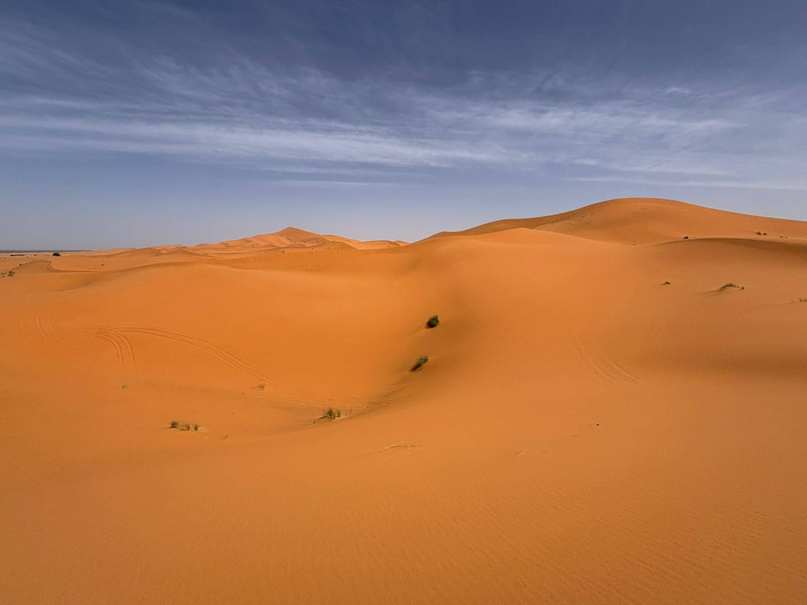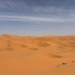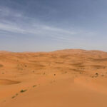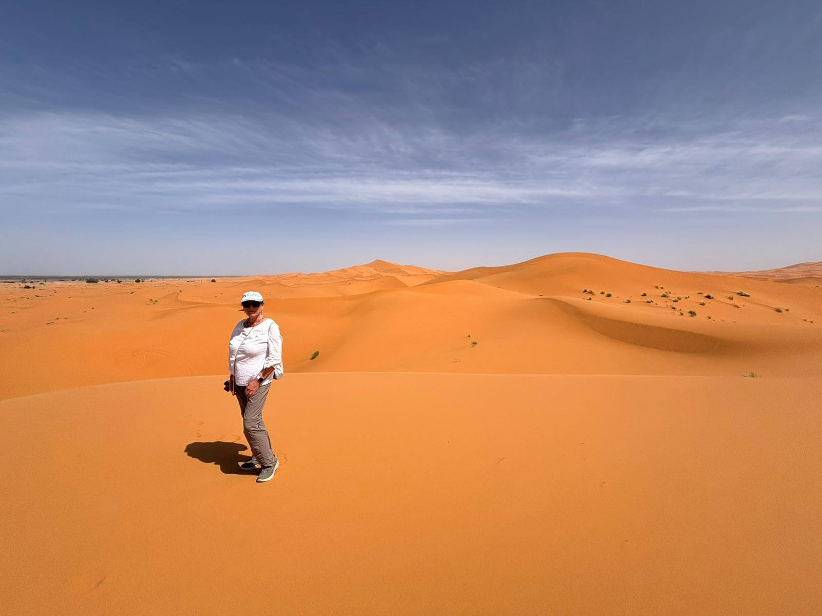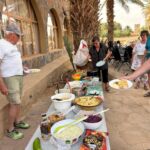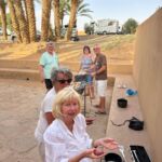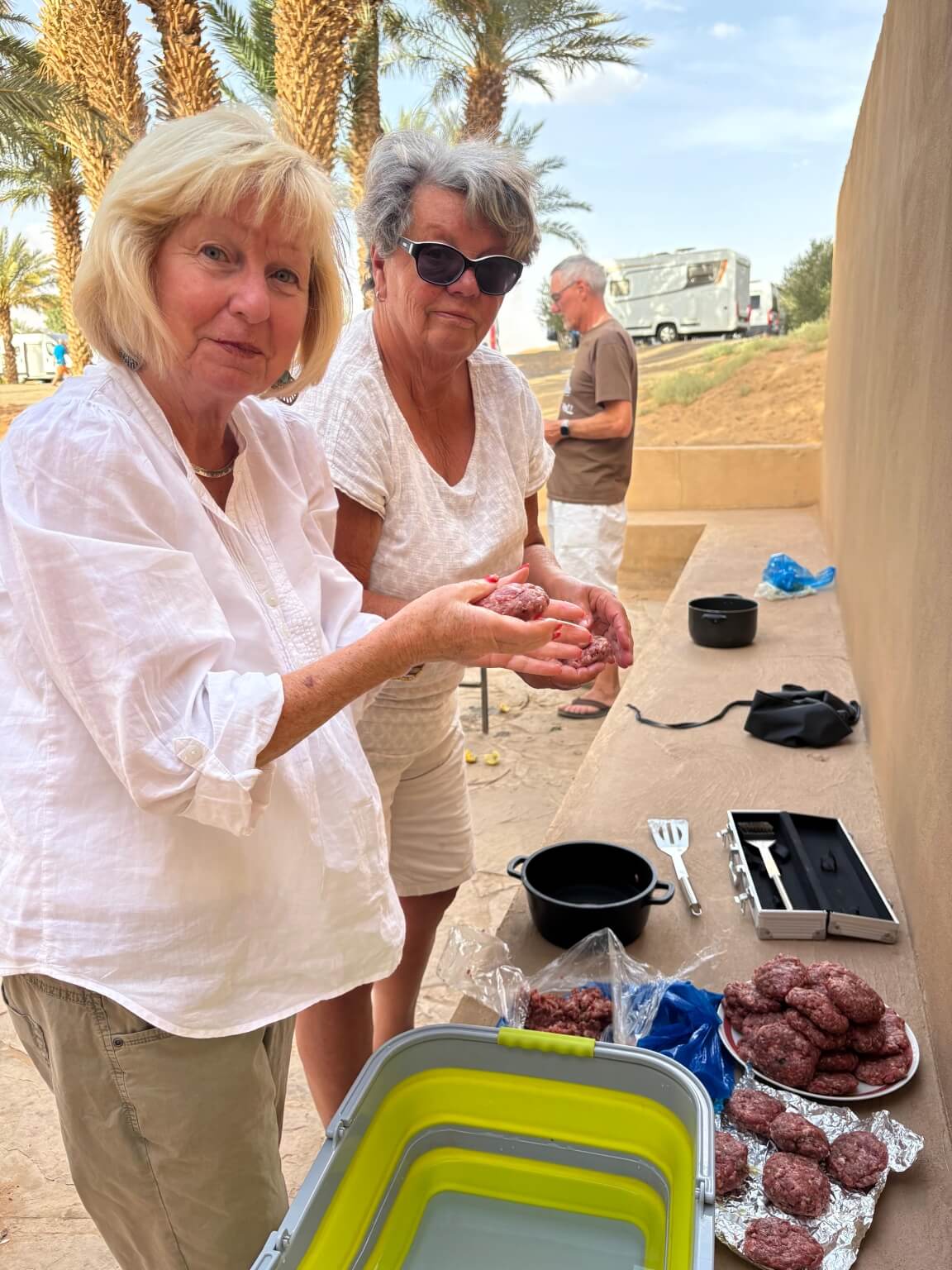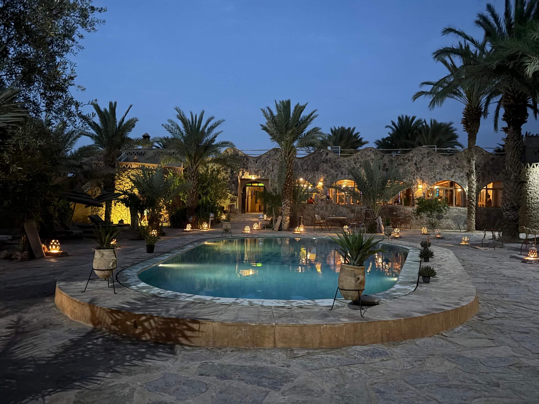 Nachdem die Frühaufsteher den tollen Sonnenaufgang über der Wüste beobachtet haben, kommen bald schon die Wüstenübernachter zurück. Die ganze Nacht hat es weiter gestürmt, aber ganz langsam ebbt der Wind ab. Unser hilfsbereiter Michael fährt mit zwei Gästen zurück nach Zagora. Das Wohnmobil mit Getriebeschaden soll fertig werden. Wenn alles gut geht, treffen wir alle drei am nächsten Campingplatz wieder. Wir übrigen Reiseteilnehmer genießen den Ruhetag. Einige wandern in die Wüste, andere haben eine Jeepsafari gebucht. Natürlich lockt auch der Hotelpool. Am Nachmittag trifft jeder noch letzte Vorbereitungen für unsere nächste Campertafel, bevor wir um 17 Uhr noch kurz den nächsten Fahrtag besprechen. Danach treffen wir uns gemeinsam zum Abendessen. Jeder hat wieder etwas für die Gruppe vorbereitet und trägt so zu einem reichhaltigen Buffet bei. Alle genießen das Beisammensein und den wunderschönen Abend.