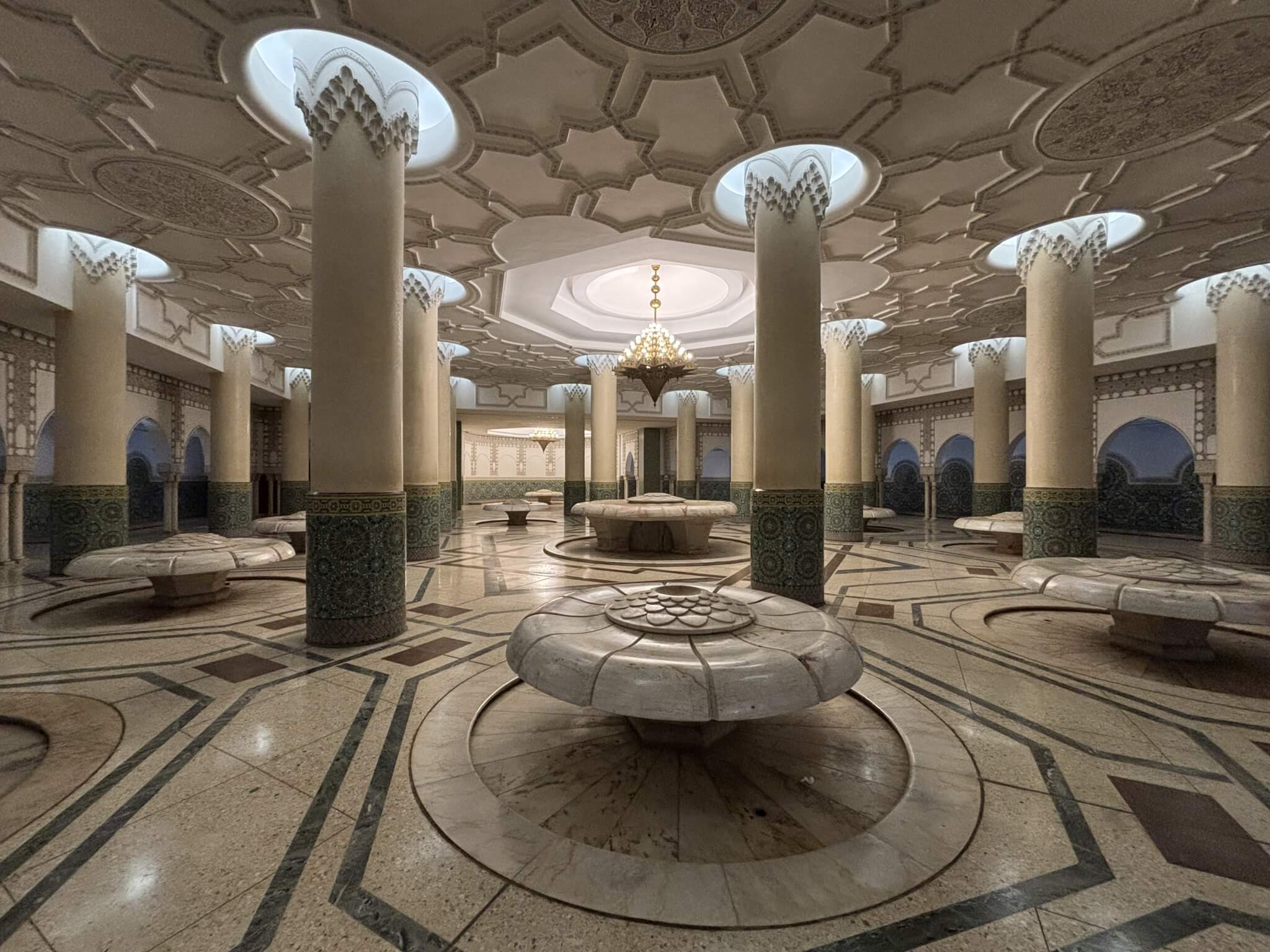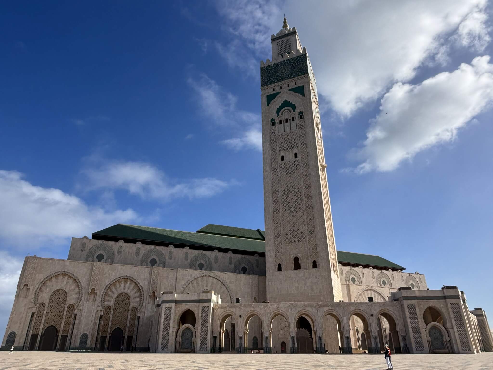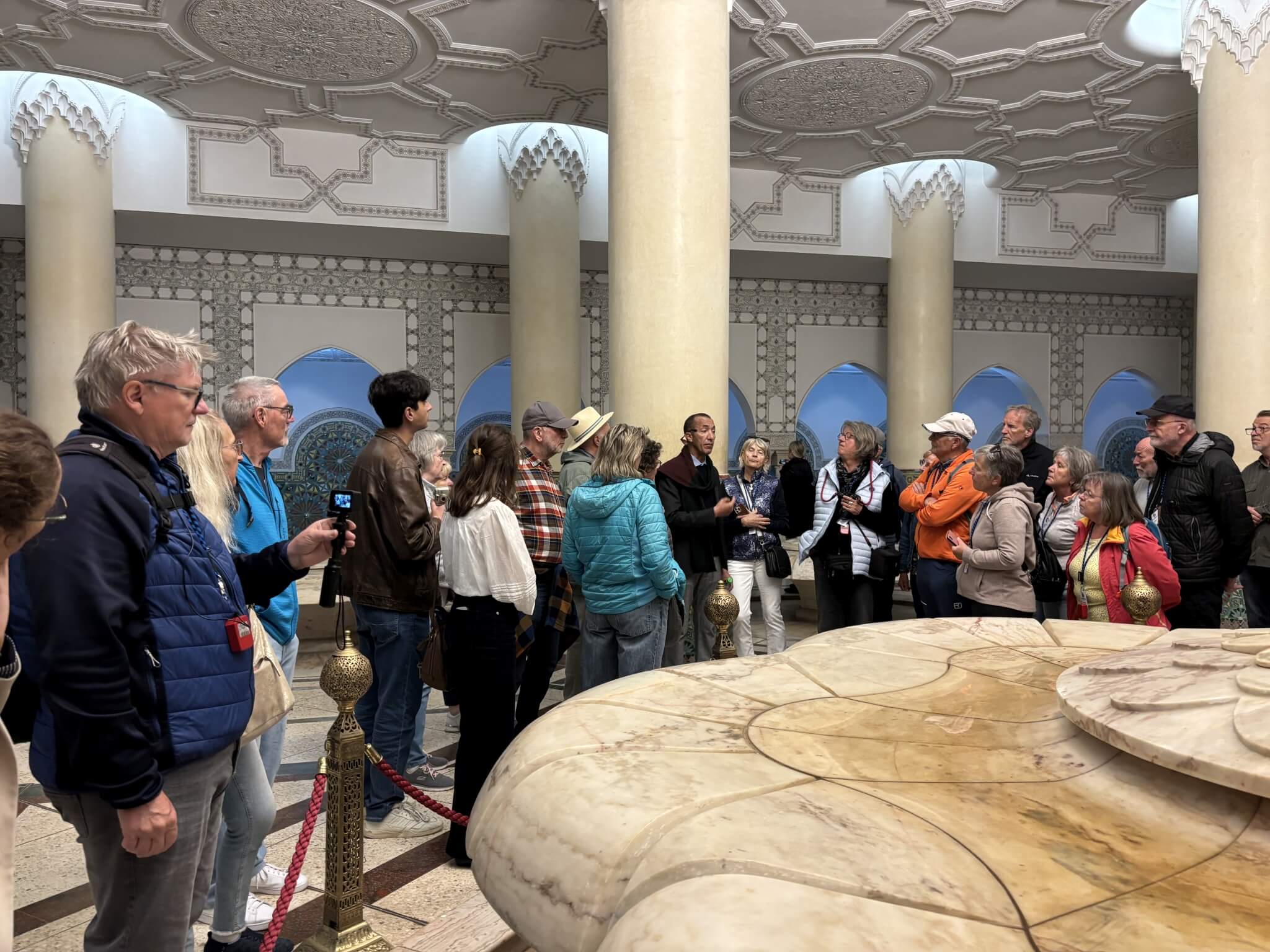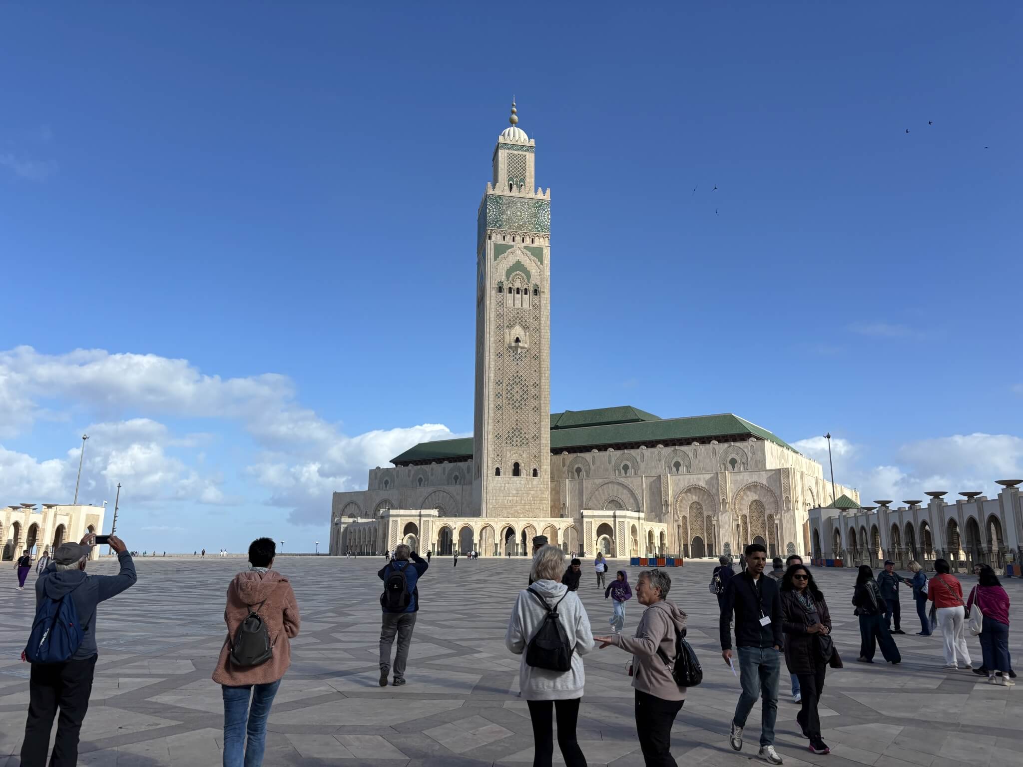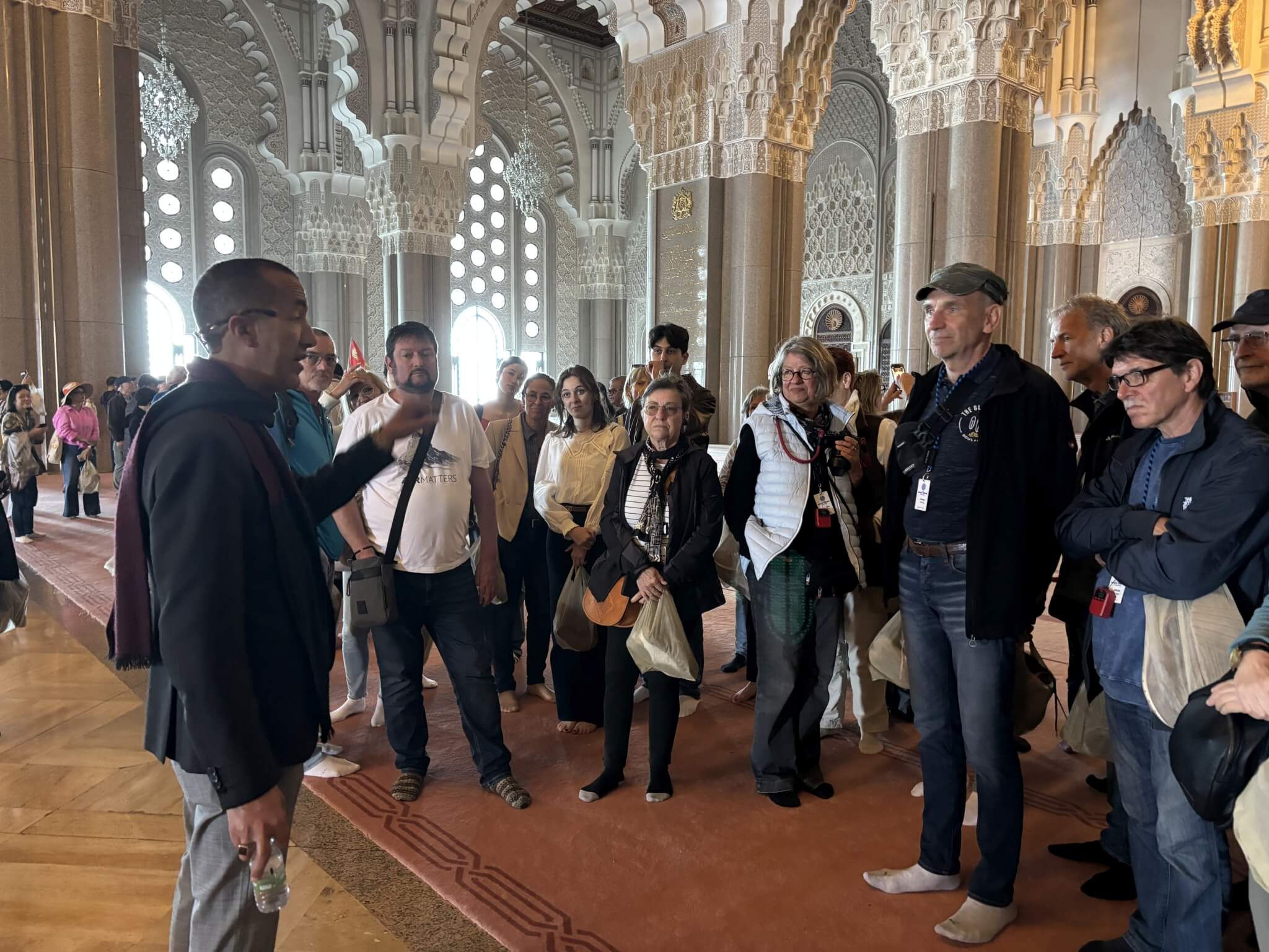 Am Morgen starten wir mit dem Bus Richtung Casablanca, der größten Stadt Marokkos. Unser Ziel ist die im maurischen Stil erbaute Moschee, benannt nach dem 1991 verstorbenen König Hassan II. Sie gilt in einigen Quellen als drittgrößte der Welt und bietet Platz für bis zu 25.000 Gläubige. Das Minarett der Moschee ist stolze 210 Meter hoch. Nach der Besichtigung bringt uns Soufian, unser Busfahrer, zurück zum Campingplatz. Unterwegs legen wir noch einen Fotostopp am berühmten „Ricks Café“ ein und erinnern uns an Bogarts legendären Ausspruch „Schau mir in die Augen, Kleines“. Gegen Mittag starten wir dann mit unseren Wohnmobilen nach Oualidia. Unterwegs bietet sich noch ein Stopp in der schönen Stadt Azemmour an. Angekommen am Campingplatz genießen wir zunächst den weiten Blick aufs Meer. Danach findet unsere Besprechung der nächsten beiden Tage statt. Dazu spendiert die Reiseleitung einen spritzigen Rosé. Im Anschluss werden die am Vortag bestellten Hühnchen-Tajinen geliefert und wir haben gemeinsam ein gutes Abendessen. Mit einem kühlen Getränk beenden wir den Tag.