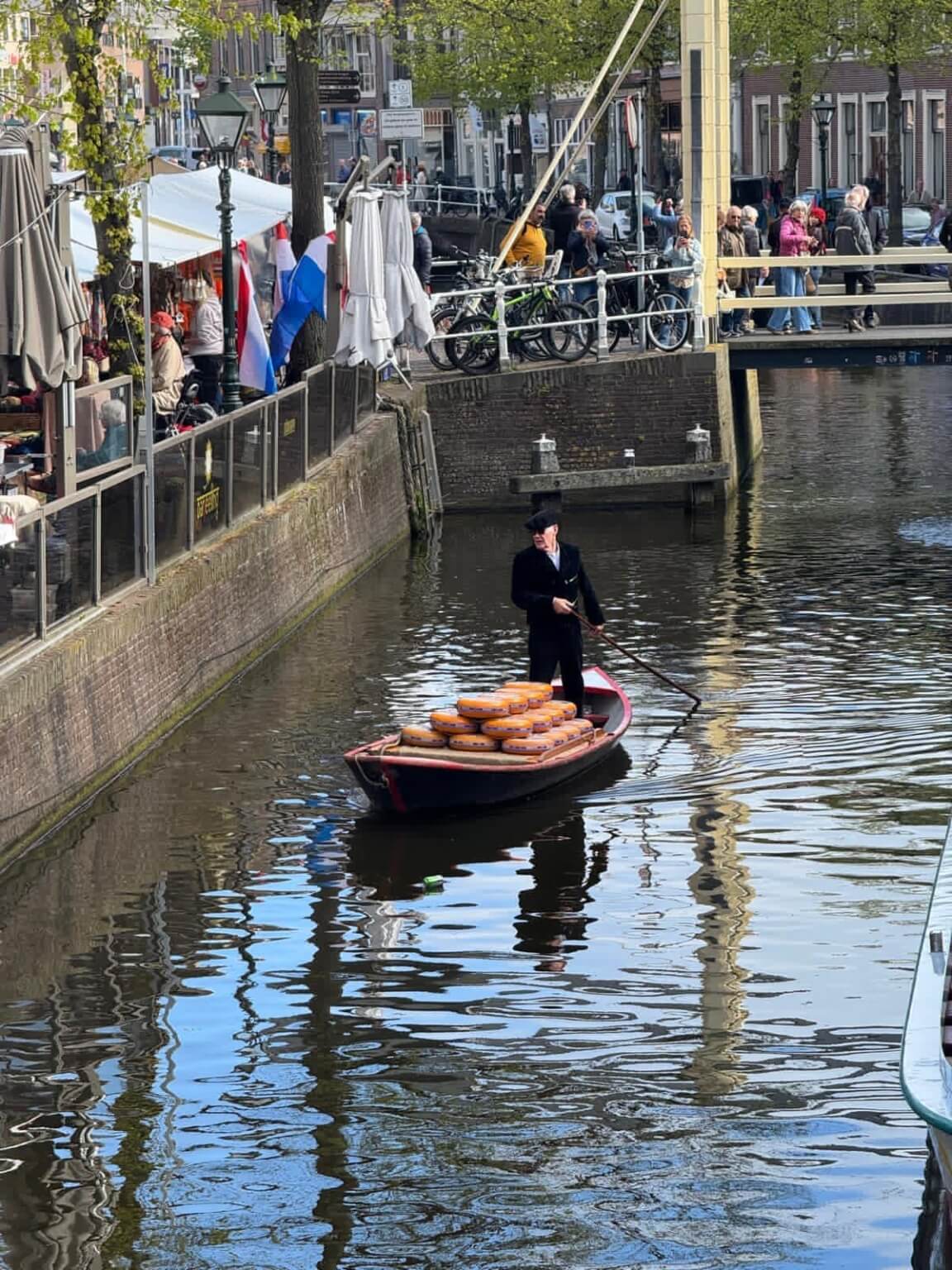 Pünktlich wie immer und wie wir es von Kuga-Teilnehmern kennen, waren um 8.30 Uhr zur Abfahrt nach Alkmaar alle da. Unser Guide Frau Leneke und unser Busfahrer Piet freuten sich auch wieder sehr, die Gruppe von Kuga begrüßen zu dürfen. Bei noch bedecktem Himmel starteten wir und wurden im Bus mit allen wichtigen Informationen zu Wasser und Land informiert. Der Käsemarkt, der von Ende März bis Ende September von 10 Uhr bis 13 Uhr geöffnet hat, war eine sehr interessante und schön anzusehende Attraktion. Auch die kleinen Gassen haben zum Schlendern eingeladen. Die Weiterfahrt führte uns an vielen bunten Tulpenfeldern (Wiesen) vorbei. Da auch hier der Winter in diesem Jahr etwas länger gedauert und kälter war, gab es noch viele davon zu sehen, da die Tulpen noch nicht geköpft worden sind. Ein kleiner Spaziergang durch das charmante und idyllische Volendam führte uns dann zu unserem Restaurant, in dem das Mittagessen reserviert war. Auf der Rückfahrt zum Campingplatz besuchten wir noch eine auf dem Land gelegene Hofkäserei. Dort wurden uns die Schritte zur Herstellung von Käse erklärt und danach gab es genügend Möglichkeiten, Käse zu kosten und zu kaufen. Jeder hat was für seinen Geschmack gefunden und auch üppig eingekauft. Der Tag ging mit einem gut gefüllten Programm zu Ende und jeder ist schon auf den nächsten Tag gespannt.
