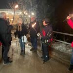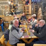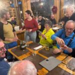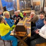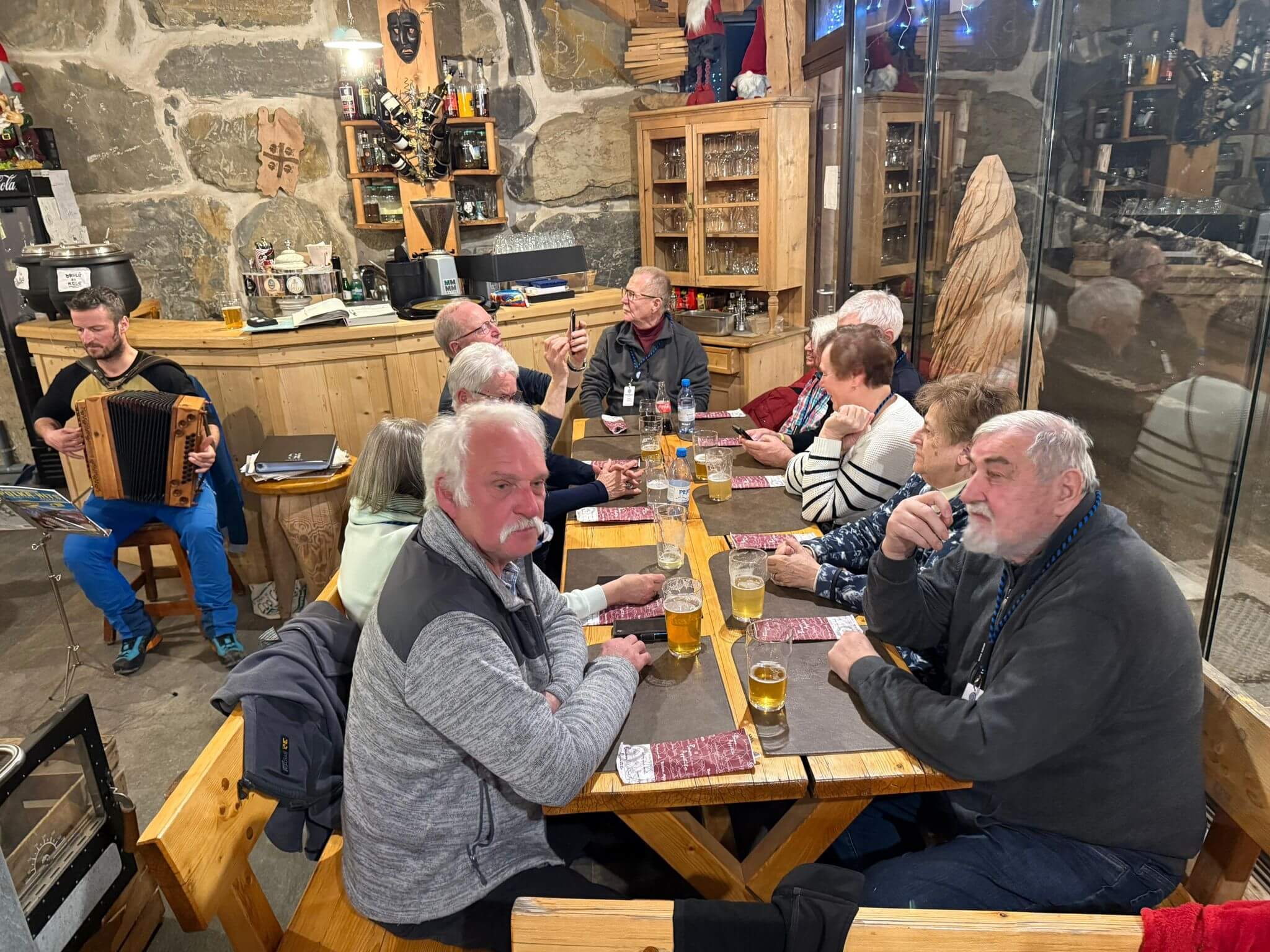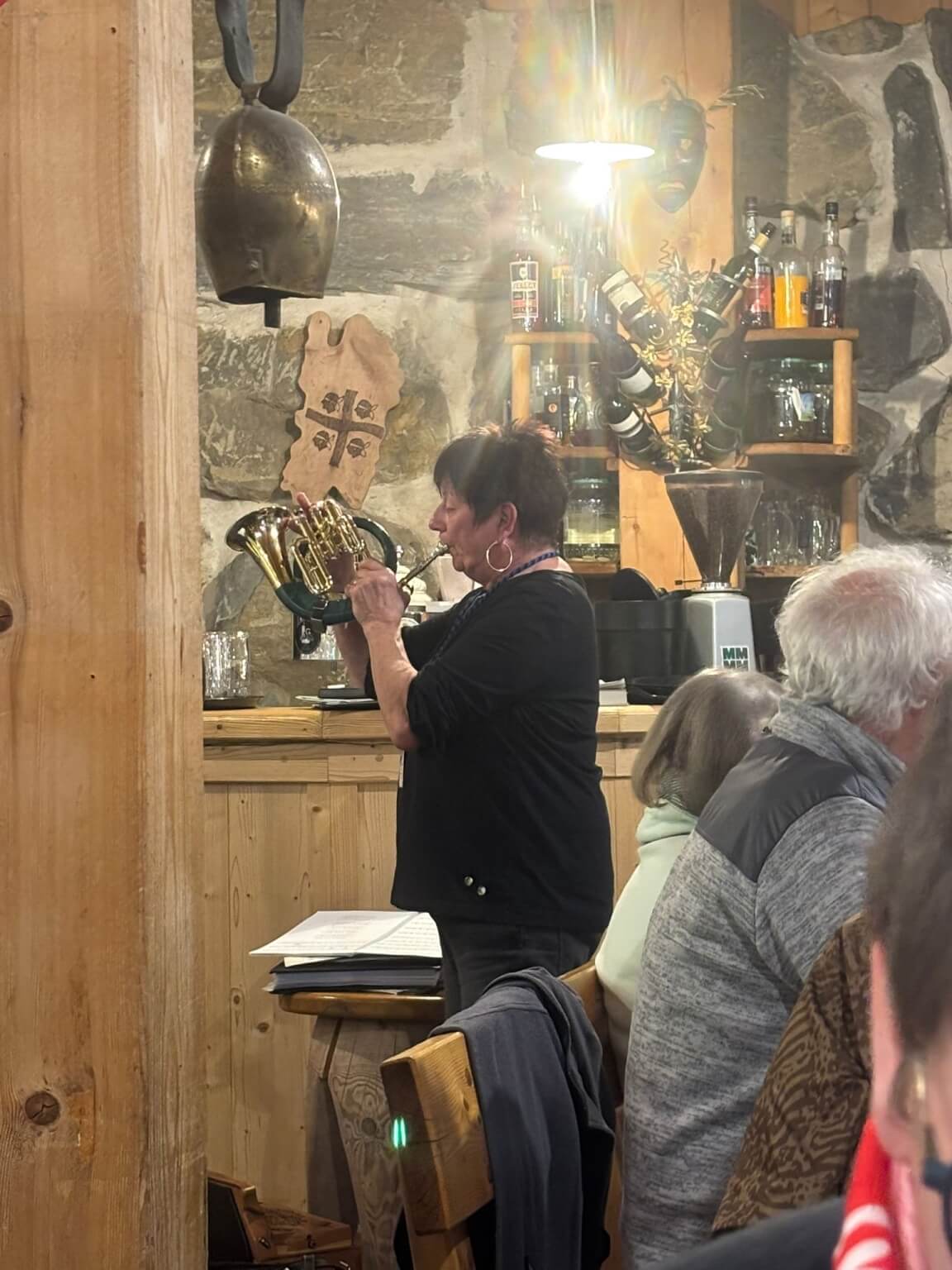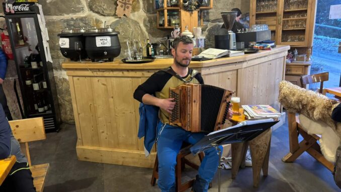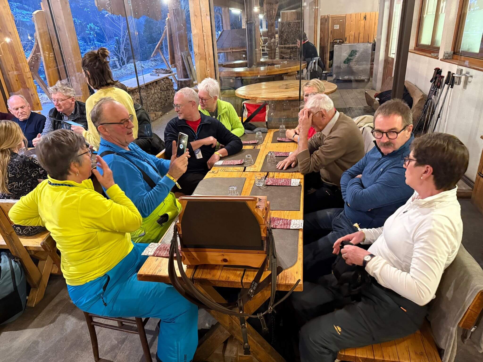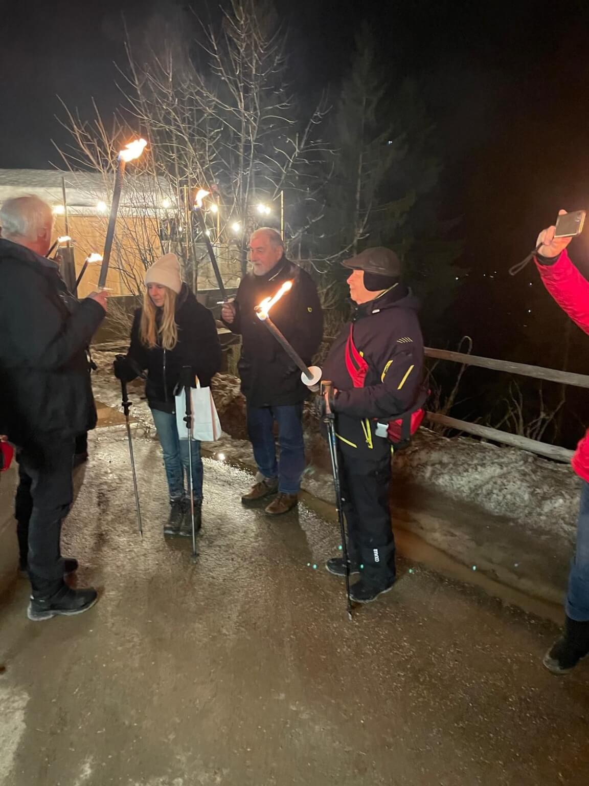 Den wunderschönen Tag verbrachten wir mit Skifahren, Wellnesstag etc. Am späten Nachmittag wanderten wir zum Dorf Pizza di Fassa und von dort hoch zur Aloch Alm. Sie liegt auf etwa 1.400 m Höhe. Auf der Terrasse hat man einen schönen Panoramablick auf das Tal und die Dolomiten. Der dazugehörige Agrarbetrieb züchtet unter anderem Rinder der Rasse Black Angus. Im Laden kann man auch Käse aus eigener Herstellung, sowie Schinken und Salami einkaufen. Wir machten davon regen Gebrauch. Unsere Claudia hat natürlich wieder zum Sammeln mit ihrem Jagdhorn geblasen und dann ging es rein in die urige Hütte. Auf der Speisekarte standen heute verschiedene Burger vom Angusrind. Die Beilagen waren Bratkartoffeln und Gemüse. Alles war hausgemacht und qualitativ sehr hochwertig. Mathias sorgte für die musikalische Unterhaltung mit seiner Ziehharmonika, ergänzt durch das Jagdhorn. Nachdem uns das Abendessen gut gemundet hatte, stellten wir uns am Hof auf. Matthias übergab uns die Fackeln und wir traten den Heimweg an. Die Fackeln leuchten uns dann den Weg heim zu unserem Camp.