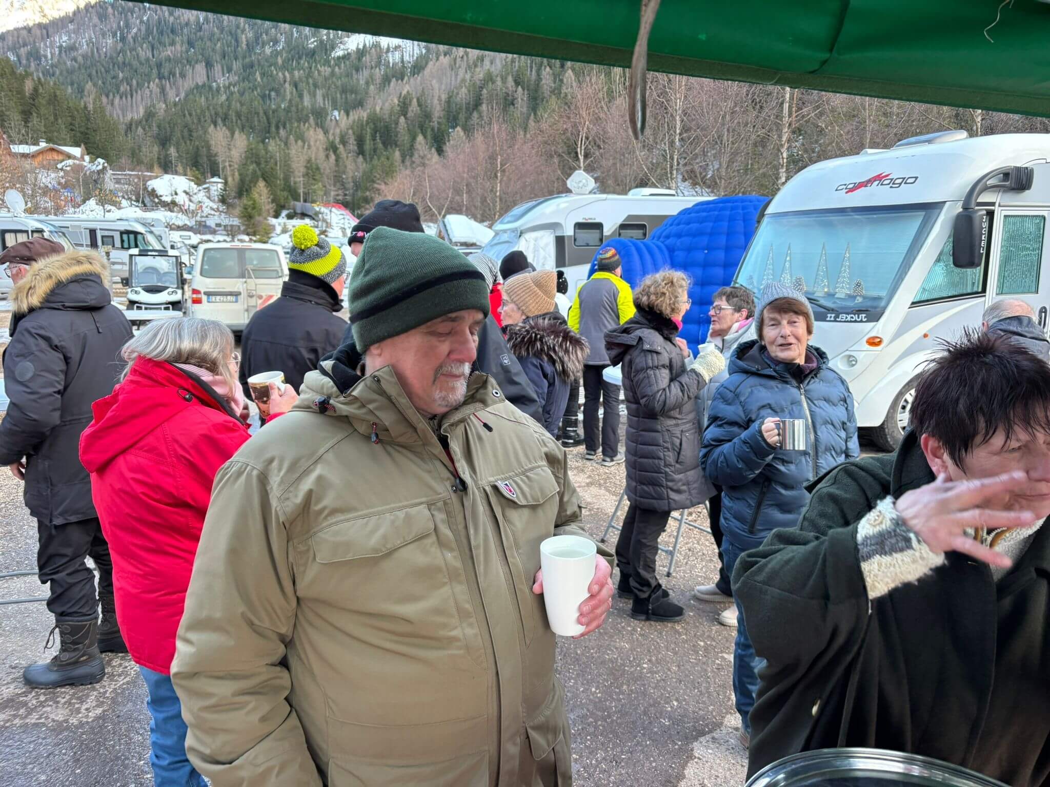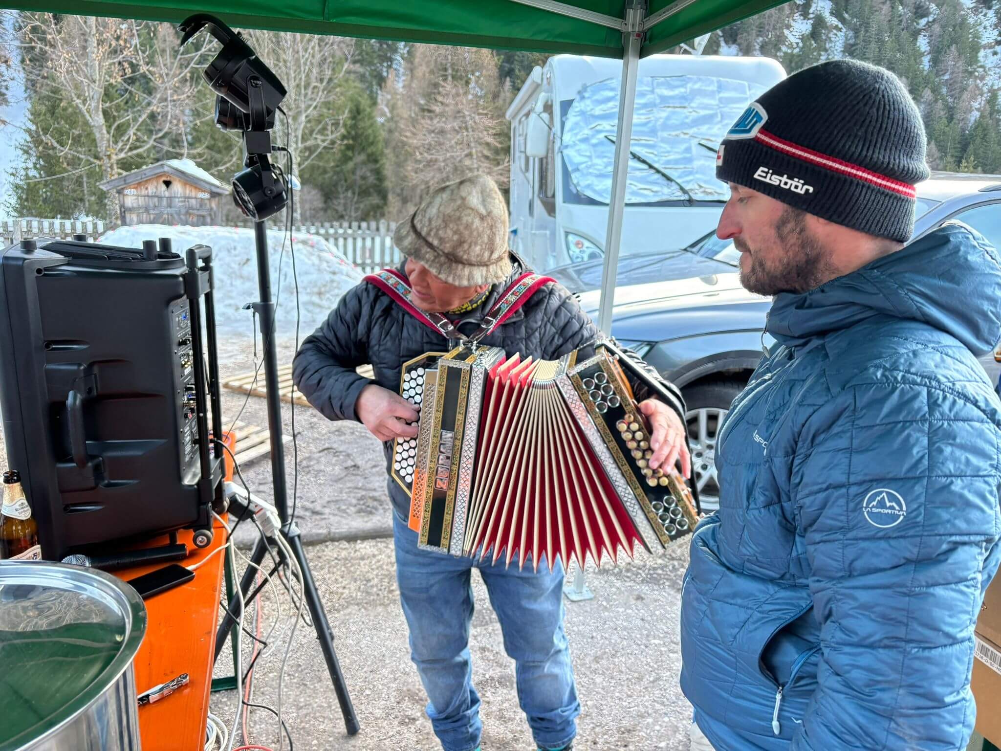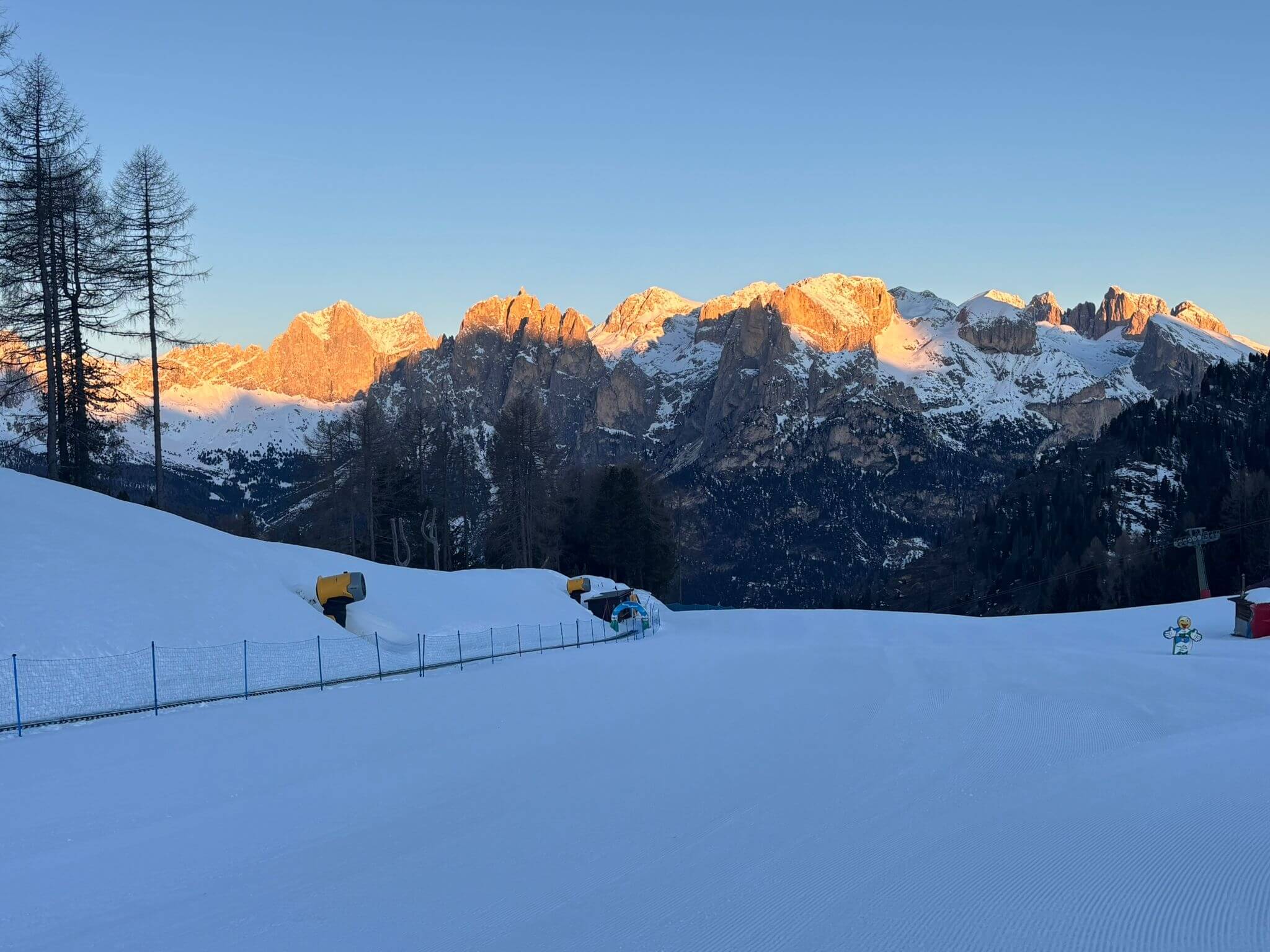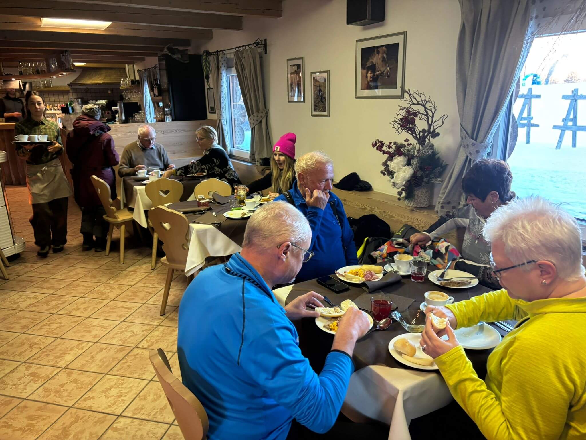 Schon um 5:30 Uhr morgens holte uns die Schneekatze vor der Einfahrt zum Campingplatz ab. Ca. 30 Minuten ging es aufwärts Richtung Bergstation der Seilbahn. Dort erwartete uns schon der Hüttenwirt mit einem reichhaltigen Frühstück und mit einem schönen, selbst gebackenen Kuchenbuffet. Doch vorher spazierten wir auf der menschenleeren Post umher. Dabei durften wir einen fulminanten Sonnenaufgang der Dolomiten erleben. Langsam erleuchtete die Sonne Stück für Stück den Rosengarten. Was war das für ein Erlebnis? Das frühe Aufstehen hat sich für alle gelohnt. In der Hütte stärkten wir uns beim Frühstück und unser Mathias hat auch sein Akkordeon mitgebracht. Damit brachte er uns auch gleich wieder in Stimmung. Im Laufe des Vormittags konnte jeder, wie er wollte, mit der Seilbahn nach unten zu unserem Camp fahren. Viele holten dann noch den versäumten Schlaf in den Wohnmobilen nach. So waren wir wieder gestärkt für die Après-Ski-Party. Es wurde getanzt und gelacht. Und Mathias hat einen „verrückten“ Harmonikaspieler engagiert. Es war wieder ein wunderschöner Tag, den wir erleben durften.
