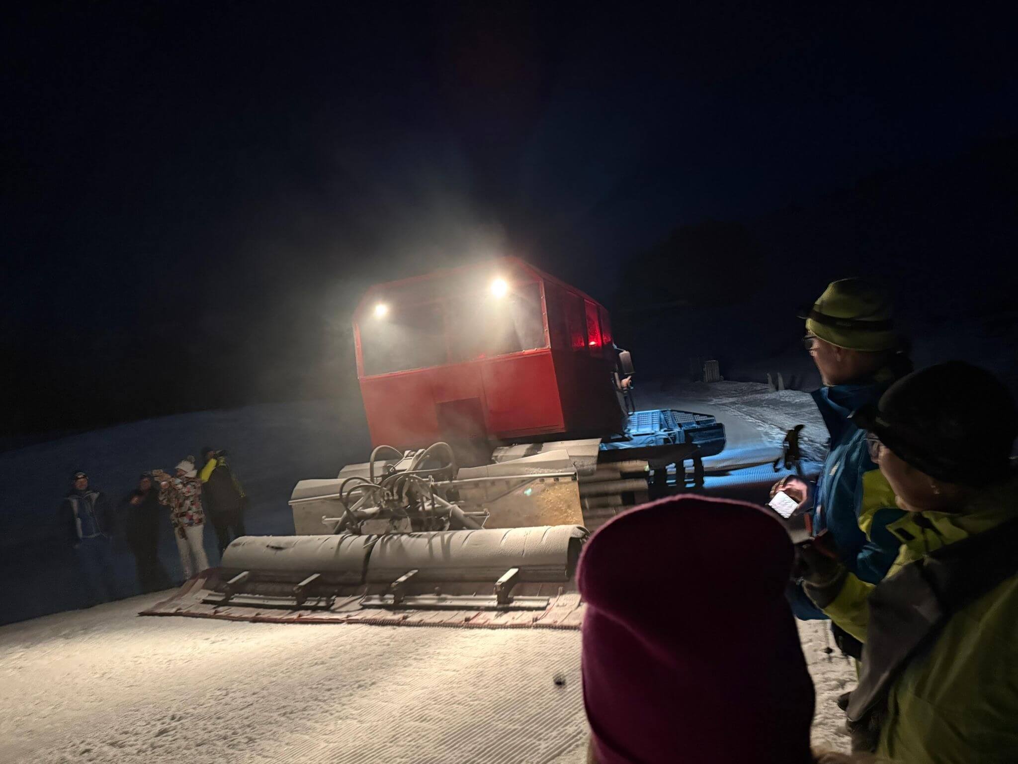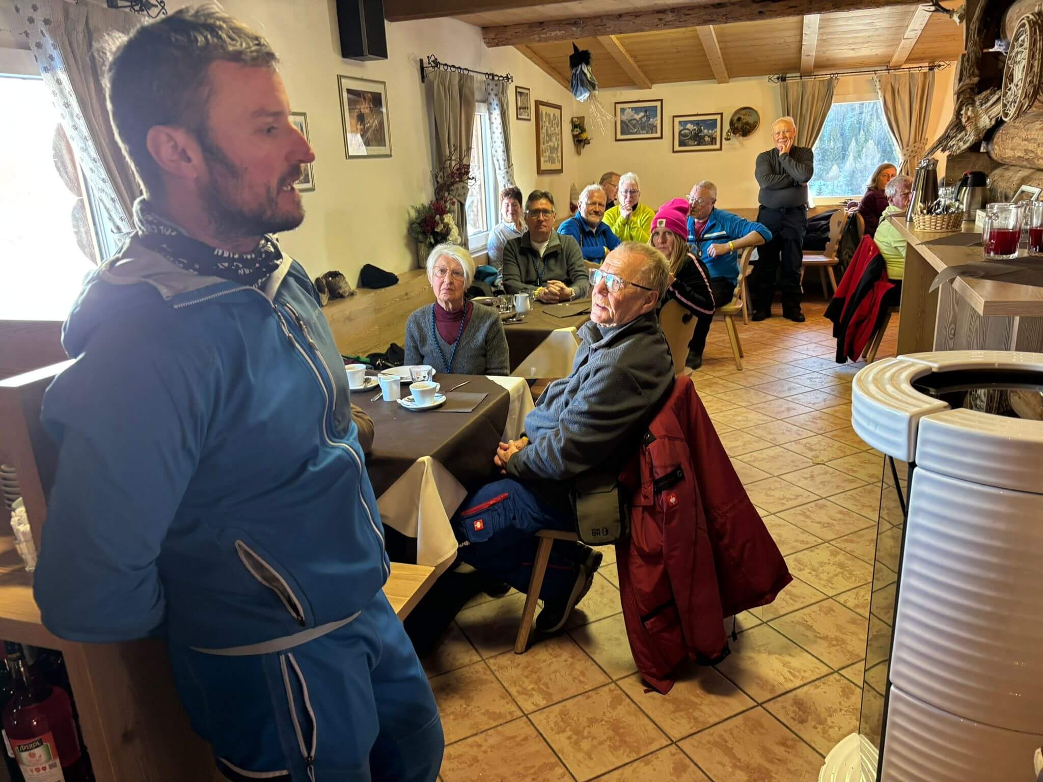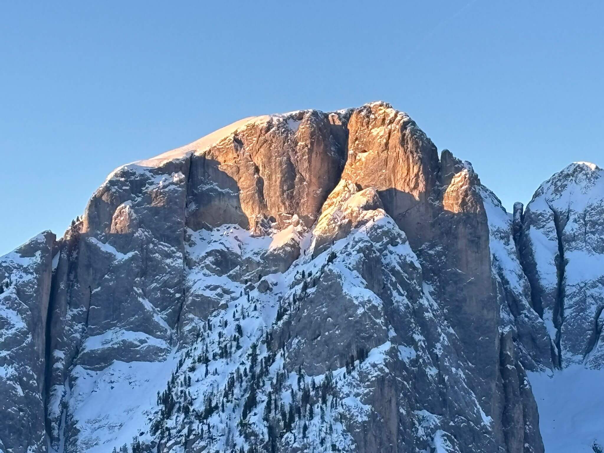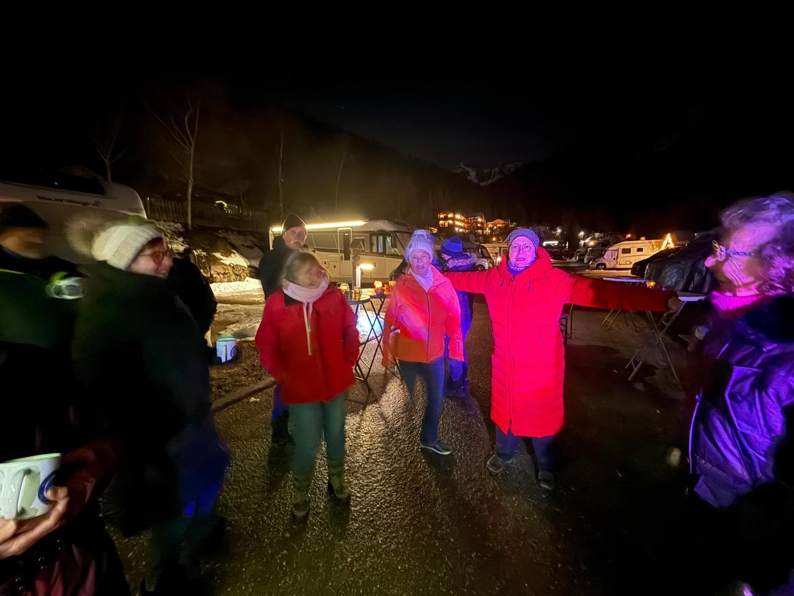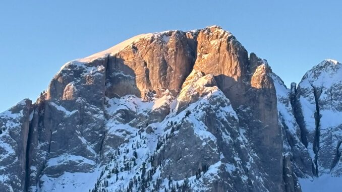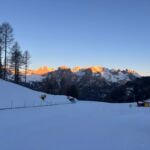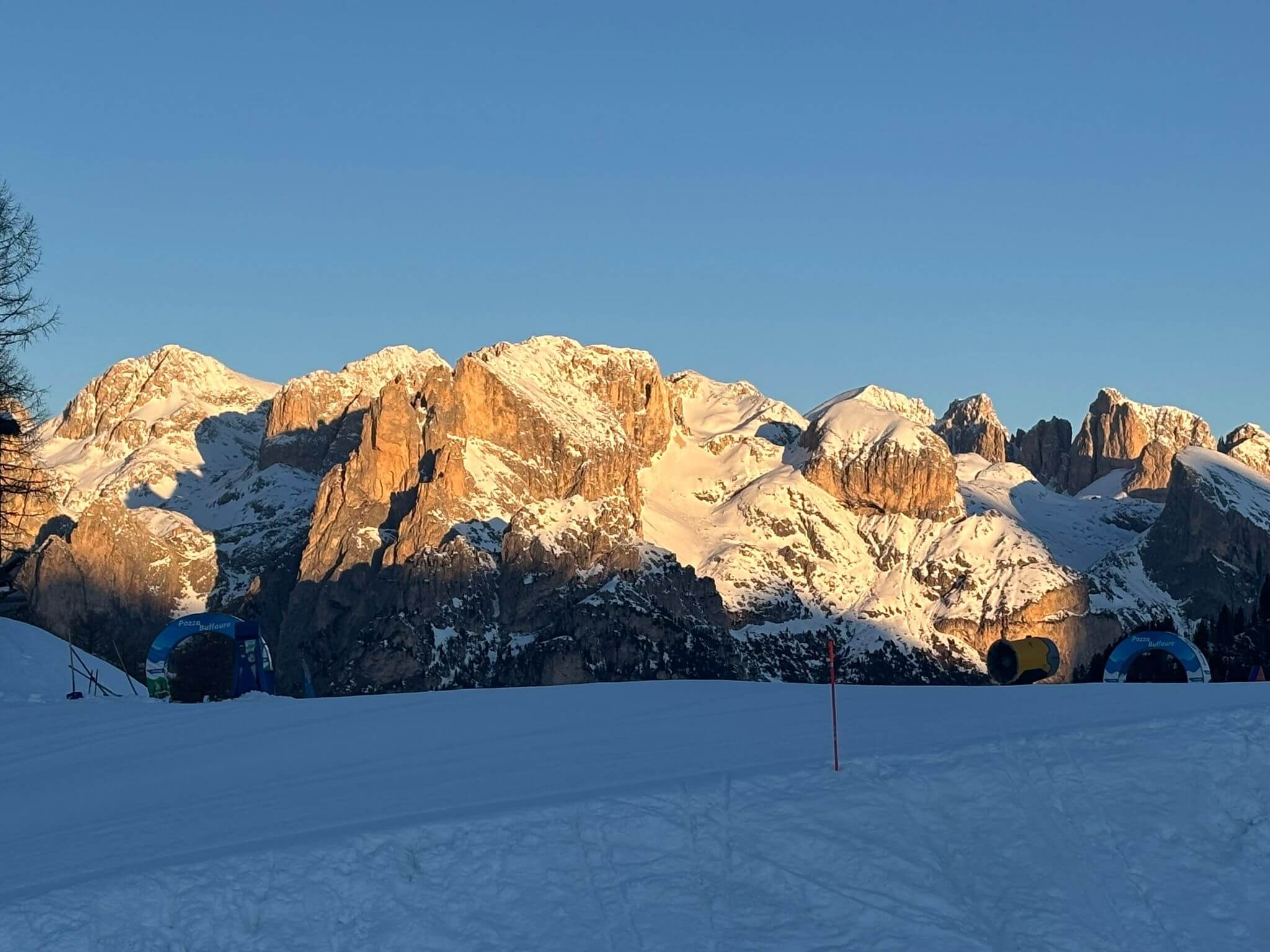 Schon um 5:30 Uhr morgens holte uns die Schneekatze vor der Einfahrt zum Campingplatz ab. Ca. 30 Minuten ging es aufwärts Richtung Bergstation der Seilbahn. Dort erwartete uns schon der Hüttenwirt mit einem reichhaltigen Frühstück und mit einem schönen, selbst gebackenen Kuchenbuffet. Doch vorher spazierten wir auf der menschenleeren Post umher. Dabei durften wir einen fulminanten Sonnenaufgang der Dolomiten erleben. Langsam erleuchtete die Sonne Stück für Stück den Rosengarten. Was war das für ein Erlebnis? Das frühe Aufstehen hat sich für alle gelohnt. In der Hütte stärkten wir uns beim Frühstück und unser Mathias hat auch sein Akkordeon mitgebracht. Damit brachte er uns auch gleich wieder in Stimmung. Im Laufe des Vormittags konnte jeder, wie er wollte, mit der Seilbahn nach unten zu unserem Camp fahren. Viele holten dann noch den versäumten Schlaf in den Wohnmobilen nach. So waren wir wieder gestärkt für die Après-Ski-Party. Es wurde getanzt und gelacht. Und Mathias hat einen „verrückten“ Harmonikaspieler engagiert. Es war wieder ein wunderschöner Tag, den wir erleben durften.
